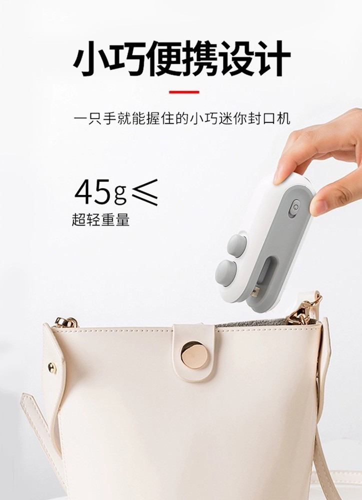 🔻迷你小巧,方便携带 迷你封口机真的很迷你 一只手就能握住 口袋、包包随便装 想带去哪里就带去哪里 居家旅行吃货必备神器