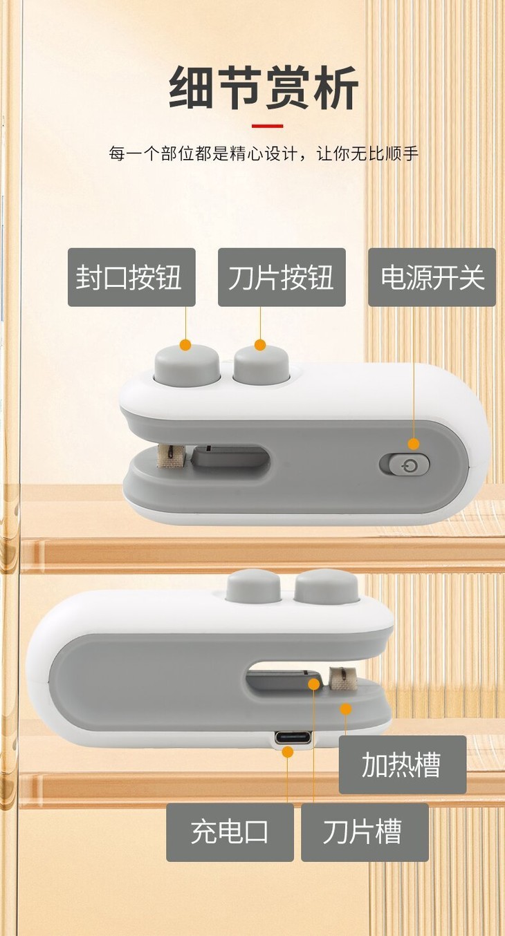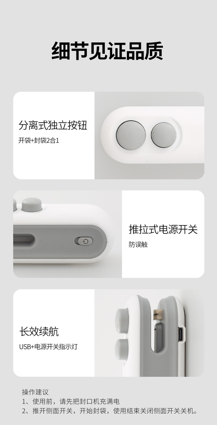 🔻选用优质的ABS材质 ✅抗压耐摔 ✅经久耐用 整个封口机的边缘都非常圆润 完全不割手,手感非常舒适