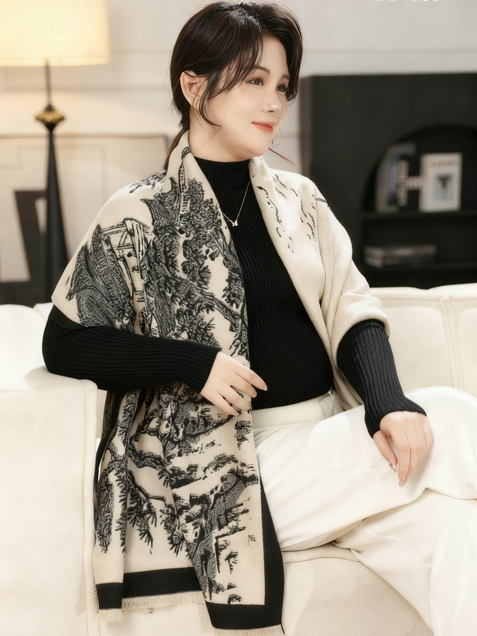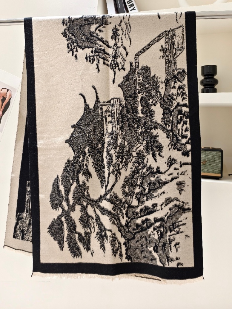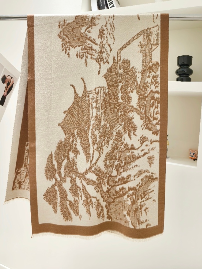 一周内发货【3色山水画围巾&披肩两用】卡其、黑色、蓝色,正反两用~尺寸:63*180cm,克重:360克,不压肩。成分:黏胶棉,不易起球~