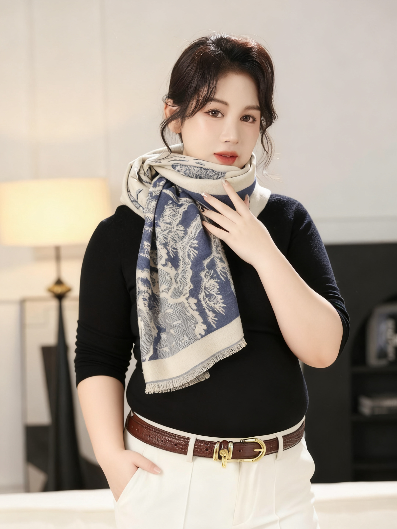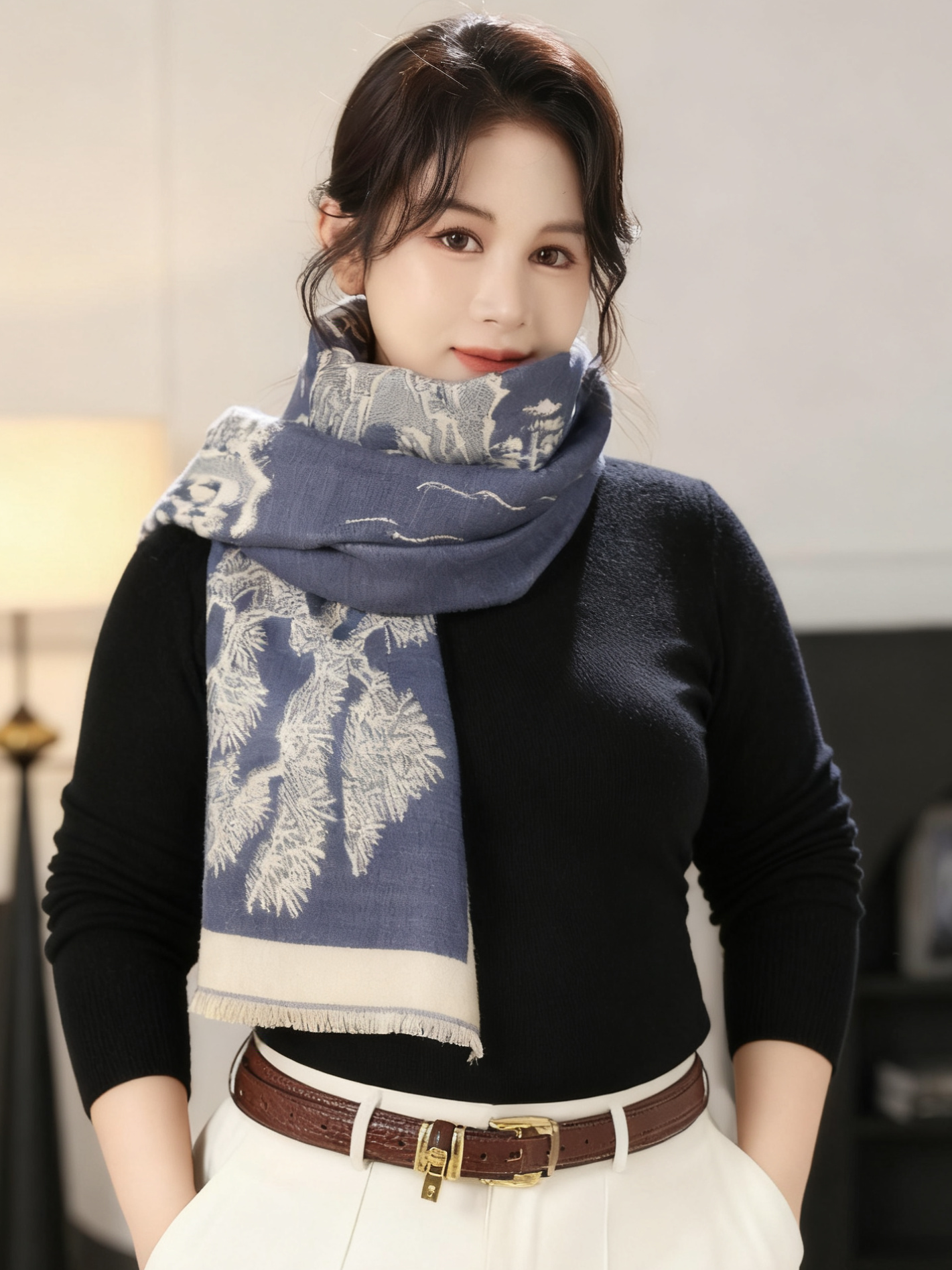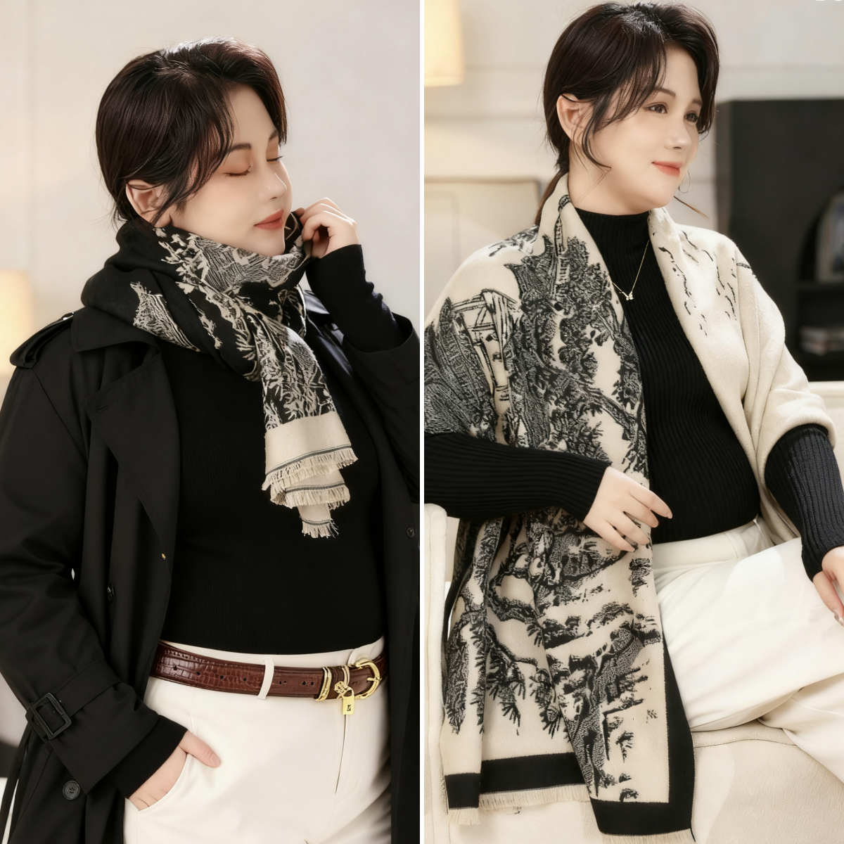 一周内发货【3色山水画围巾&披肩两用】卡其、黑色、蓝色,正反两用~尺寸:63*180cm,克重:360克,不压肩。成分:黏胶棉,不易起球~