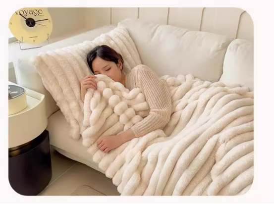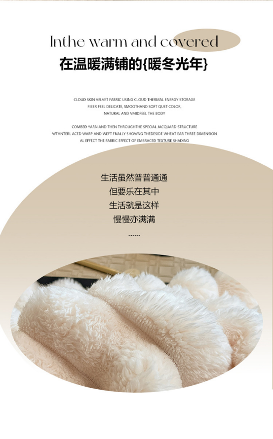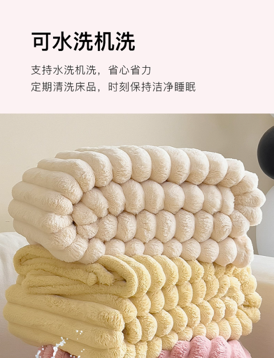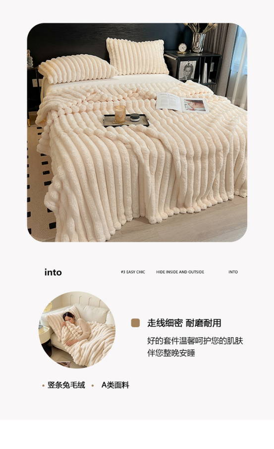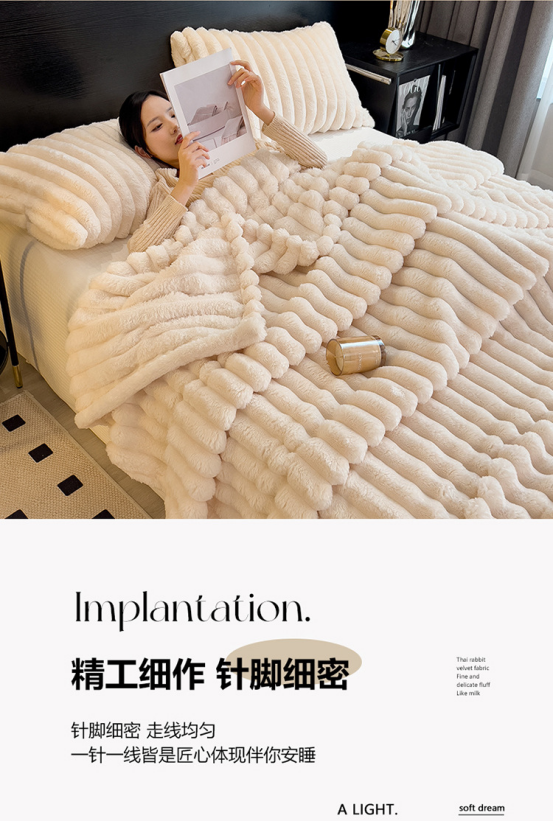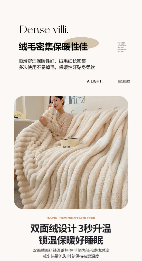 这款兔毛绒加厚绒毯,面料经过处理,就算使劲摩挲也不会起静电。 所以特别亲肤,裸睡毫无负担。 长期使用也不用担心会失去原有的亲肤细腻,即使是水洗后自然晾干,毯面绒毛依然顺滑平整