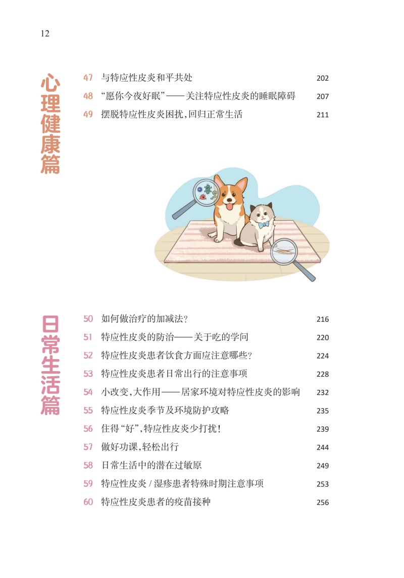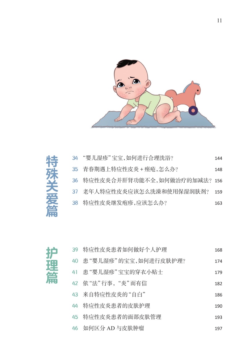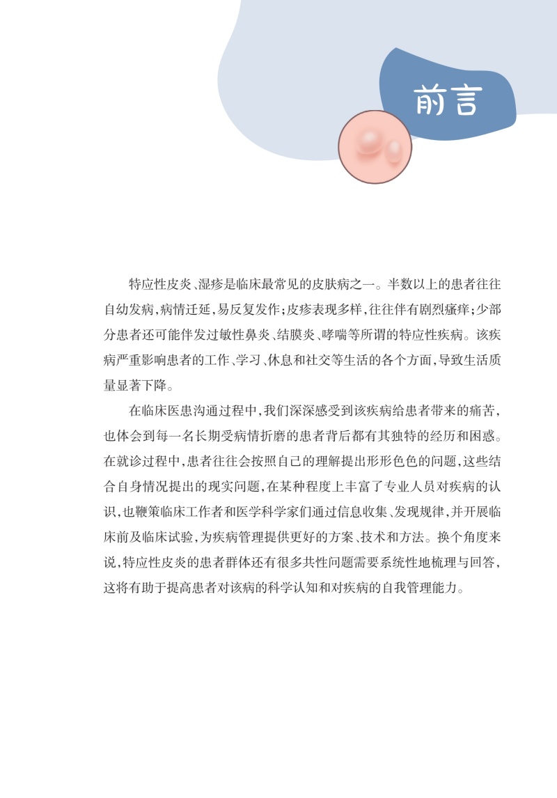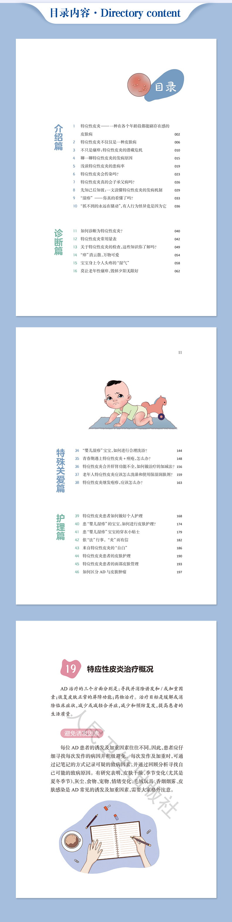 【1】本书比较全面系统地介绍了特应性皮炎**的理论知识。【2】本书整体结构分为特应性皮炎的病因、临床表现、发病机制、诊断和治疗方案、管理和日常生活中衣食住行需要注意的事项等。【3】具体到每一章节,内容均涵盖客观科学的介绍,更结合了专家个人的诊治经验,针对不同的疾病严重程度、患者年龄群及合并疾病给出相应的诊疗及管理意见。【4】因为特应性皮炎是一种长期存在的慢性疾病,容易合并其他疾病,如“特应性皮炎遇到了青春期痤疮,皮肤该如何正确护理”这样的话题想必就是皮肤科临床医师经常遇到的问题。本书的内容设计旨在帮助皮肤科临床医师解决日常工作中的一些常见问题,急临床所急,所以诸如这些问题的答案相信一定能够让读者阅读后豁然开朗,有所收获。