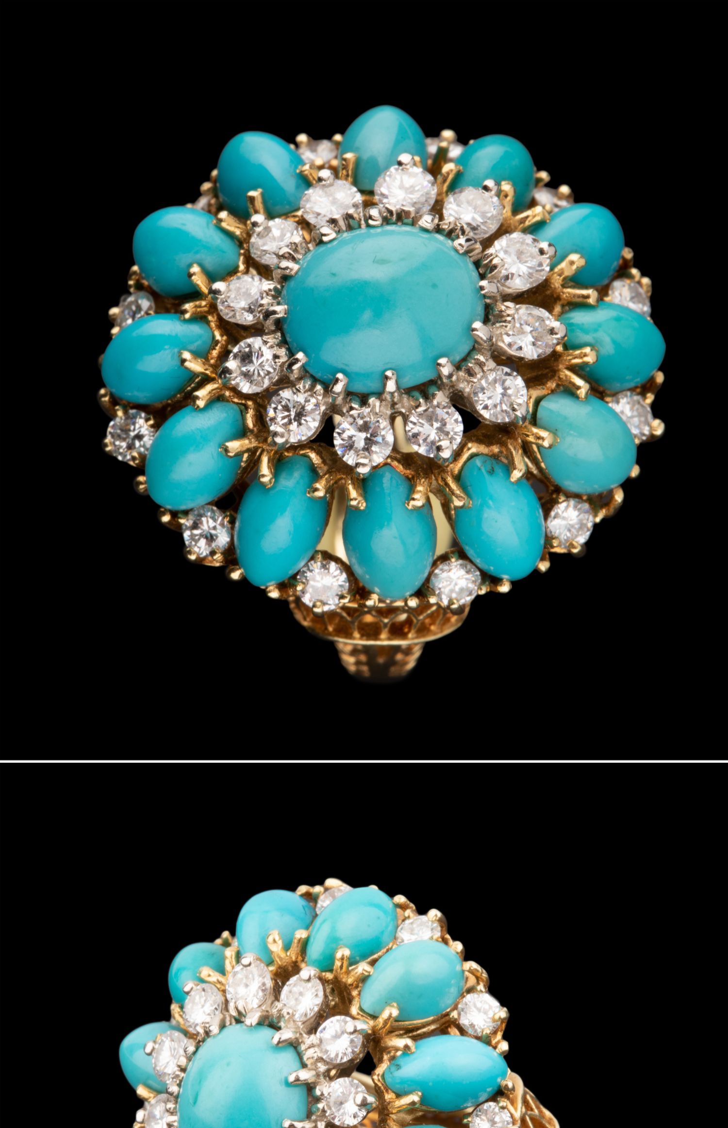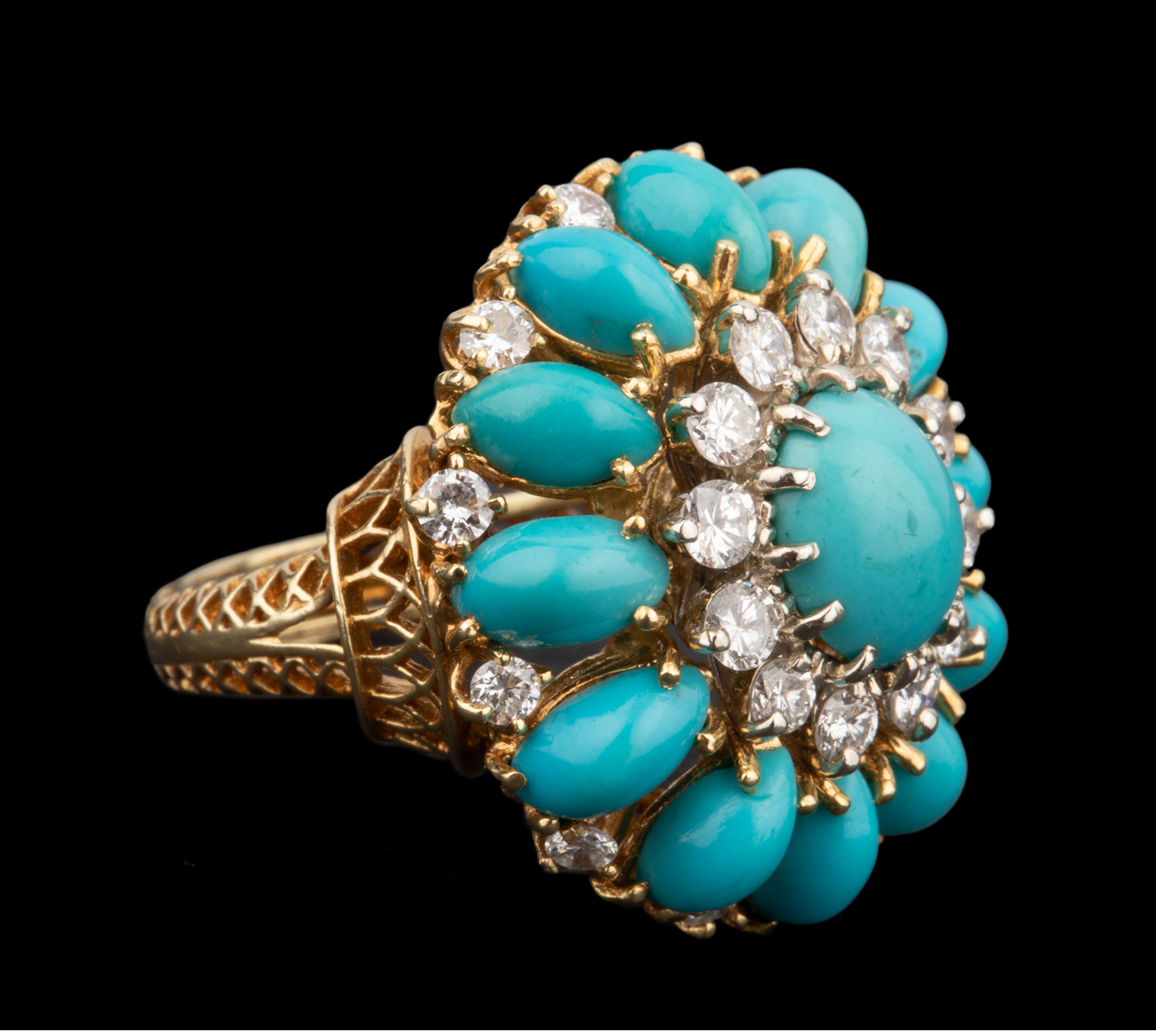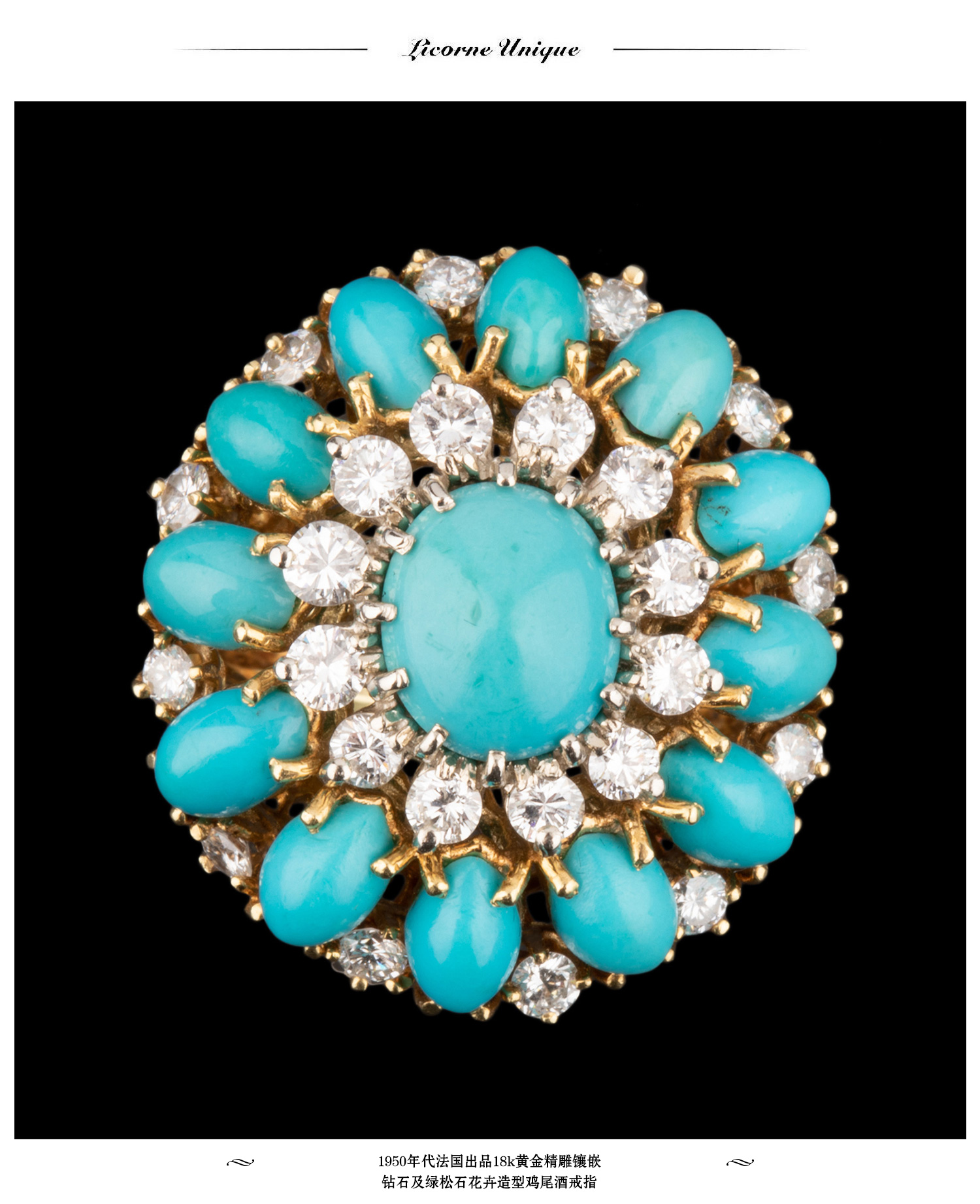 独角鹿西洋古董首饰珠宝18K黄金精雕镶嵌钻石及绿松石鸡尾酒戒指