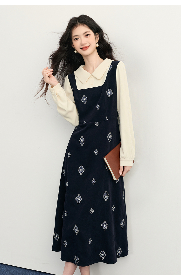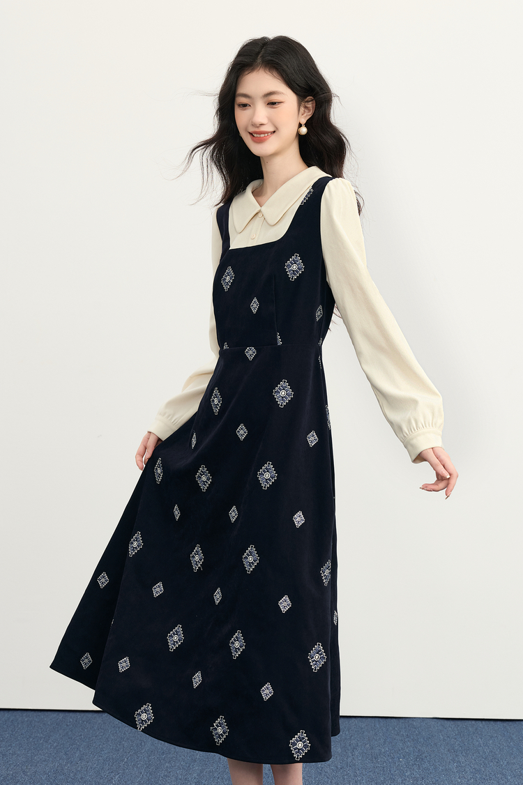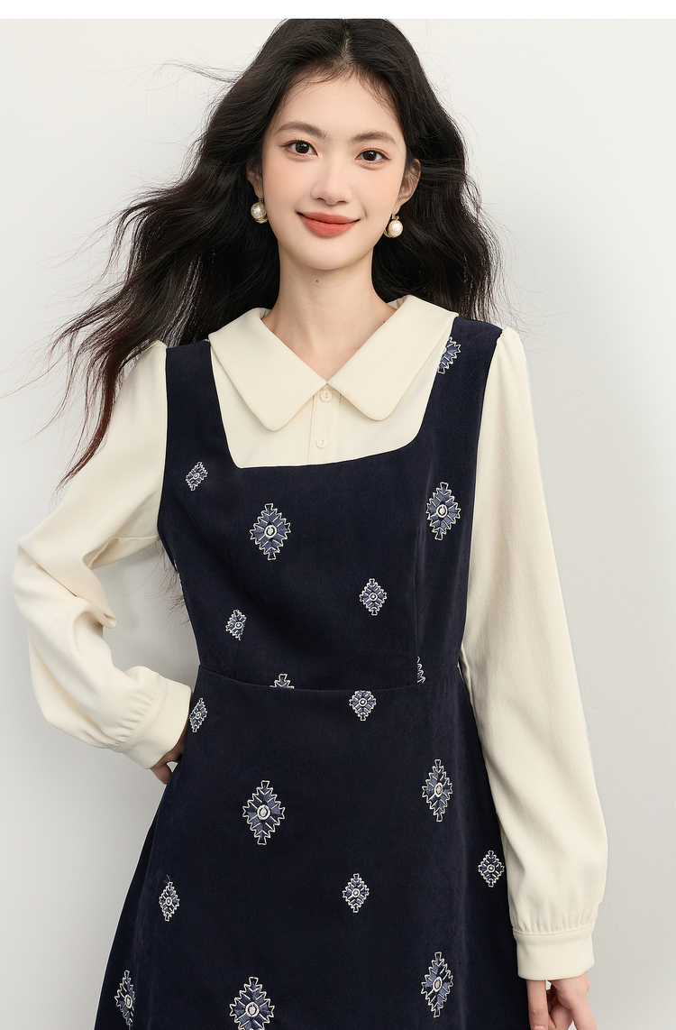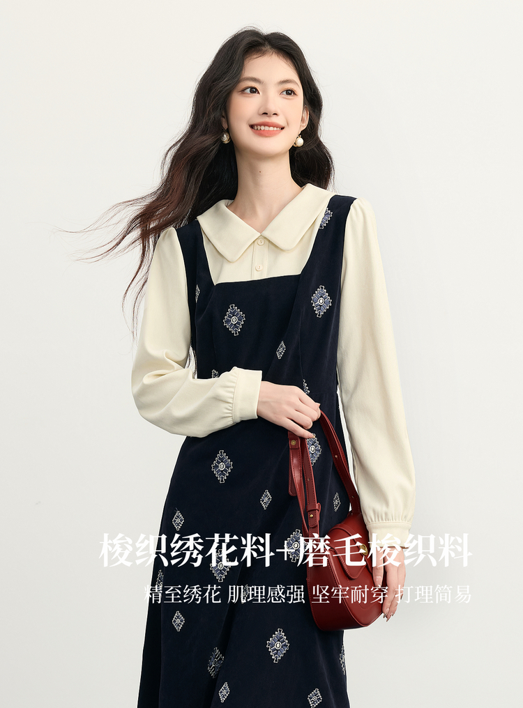 【12/03新品】熙世界伯爵千金感假两件连衣裙女秋冬民族风刺绣收腰POLO领长裙子