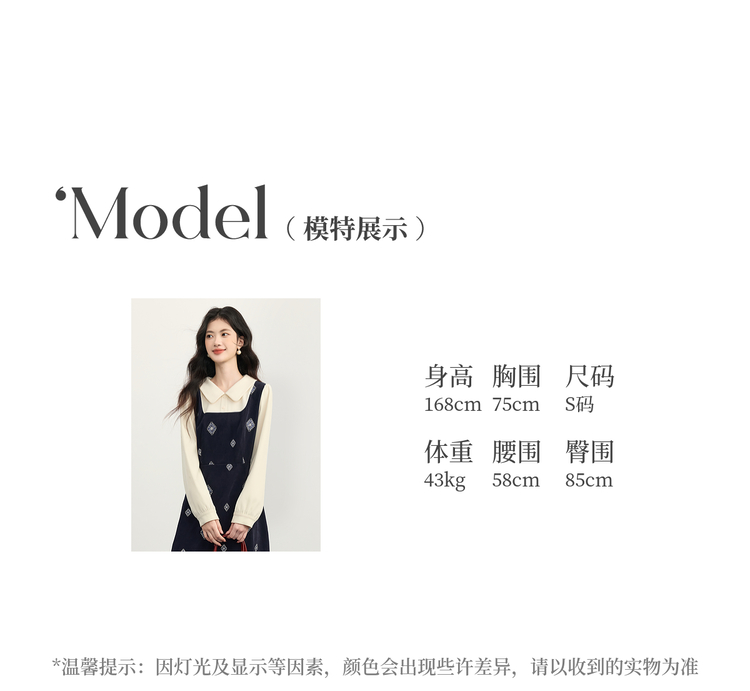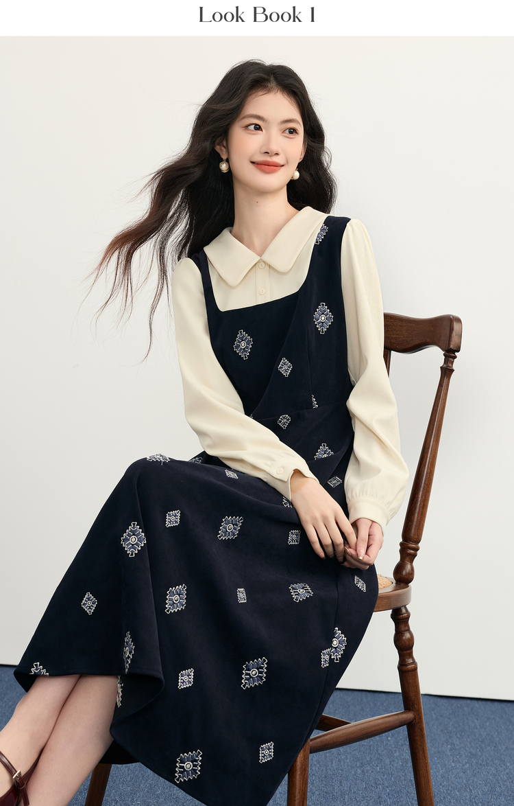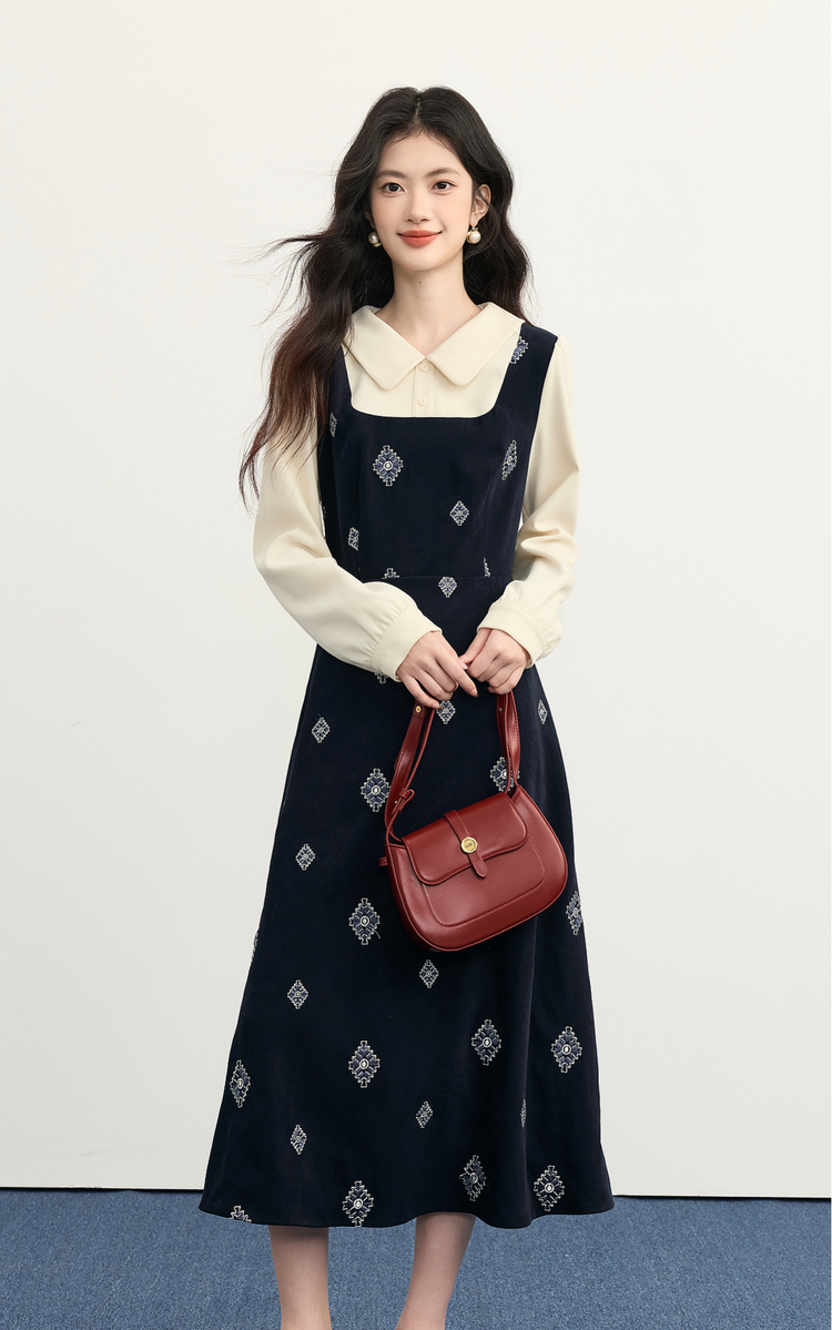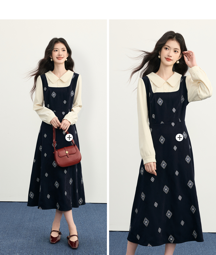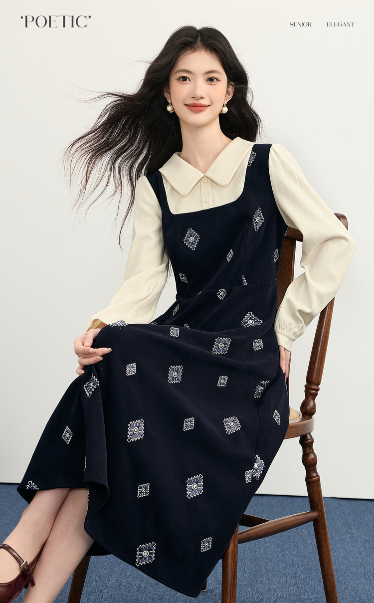 【12/03新品】熙世界伯爵千金感假两件连衣裙女秋冬民族风刺绣收腰POLO领长裙子