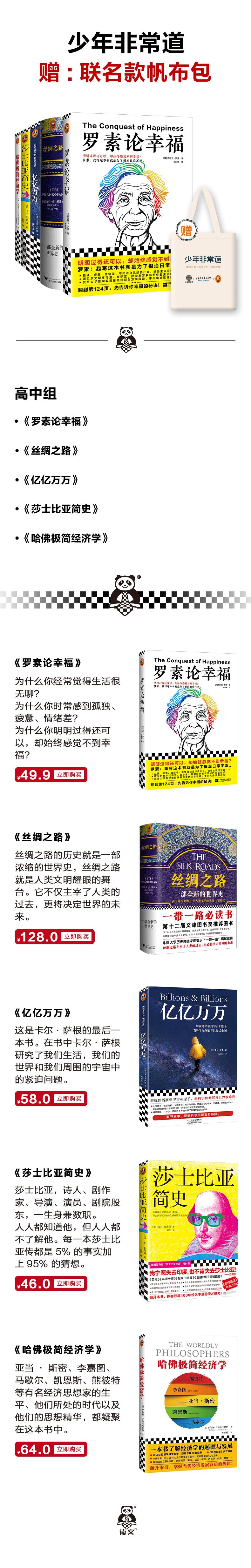 第五届少年非常道高中组系列 5套合集《罗素论幸福》《丝绸之路》《亿亿万万》《莎士比亚简史》《哈佛极简经济学》科普普及读物