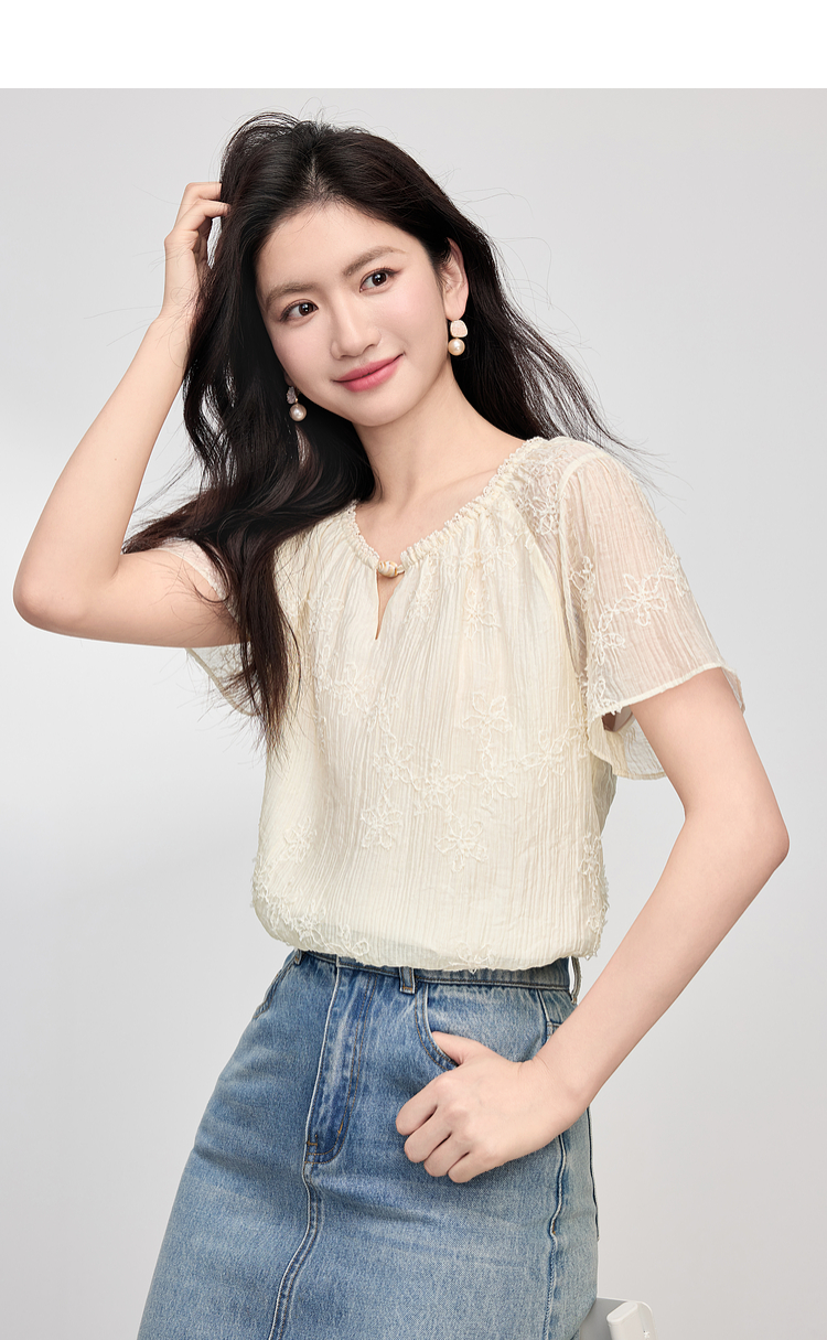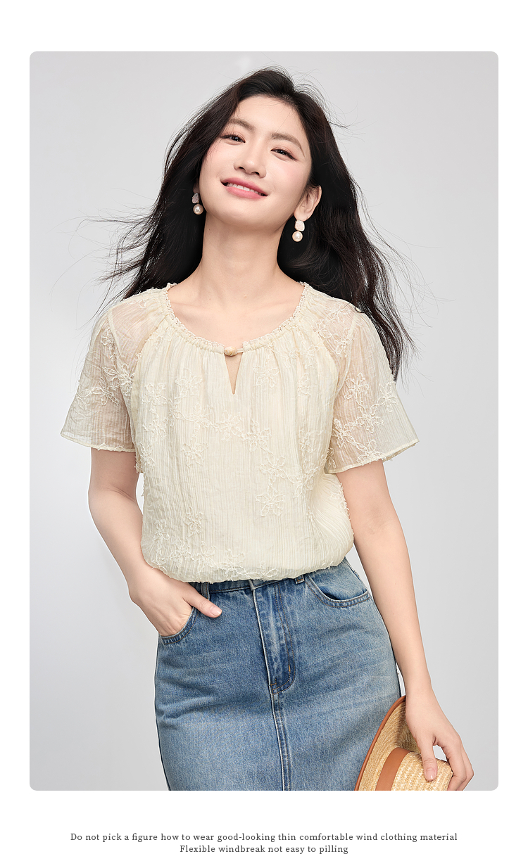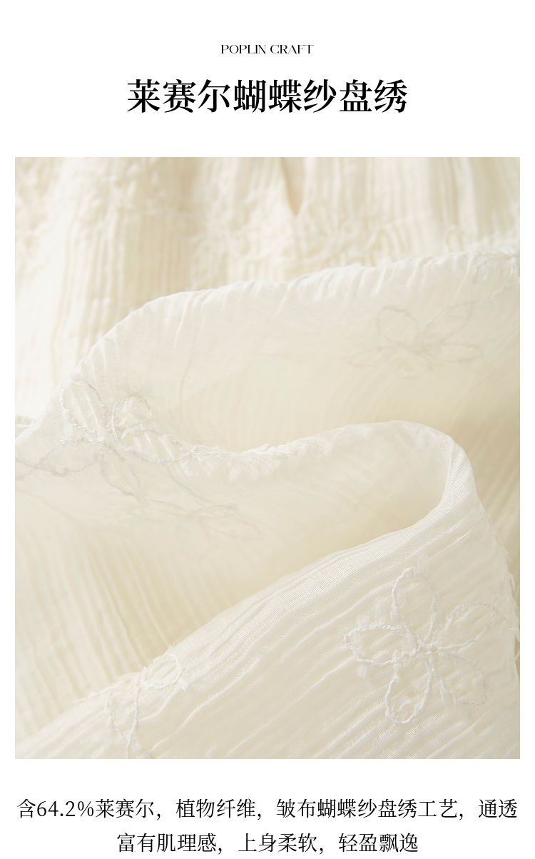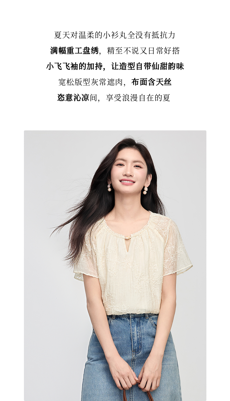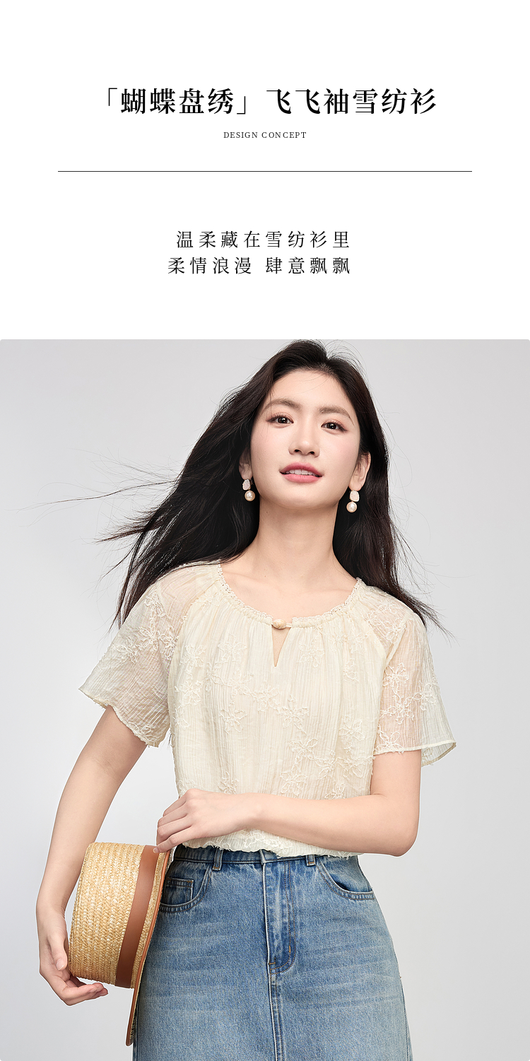 熙世界飞飞袖天丝雪纺衬衫女2025夏日新款轻中式蝴蝶纱盘刺绣上衣