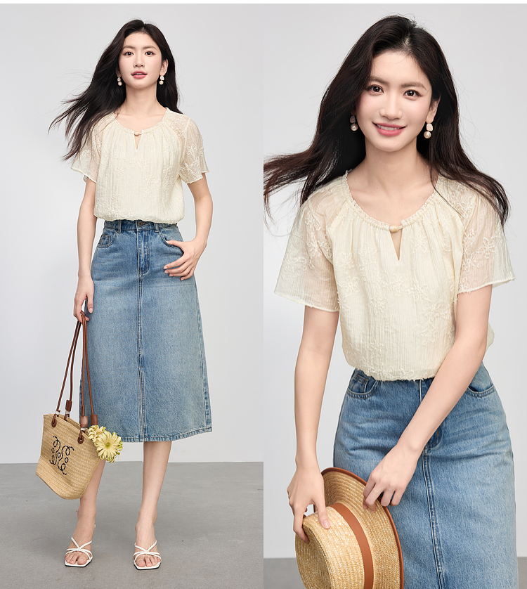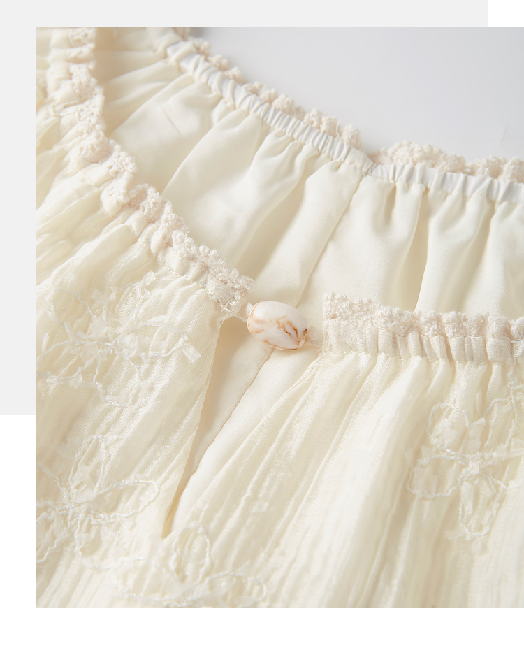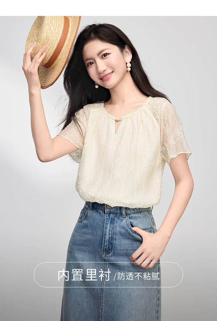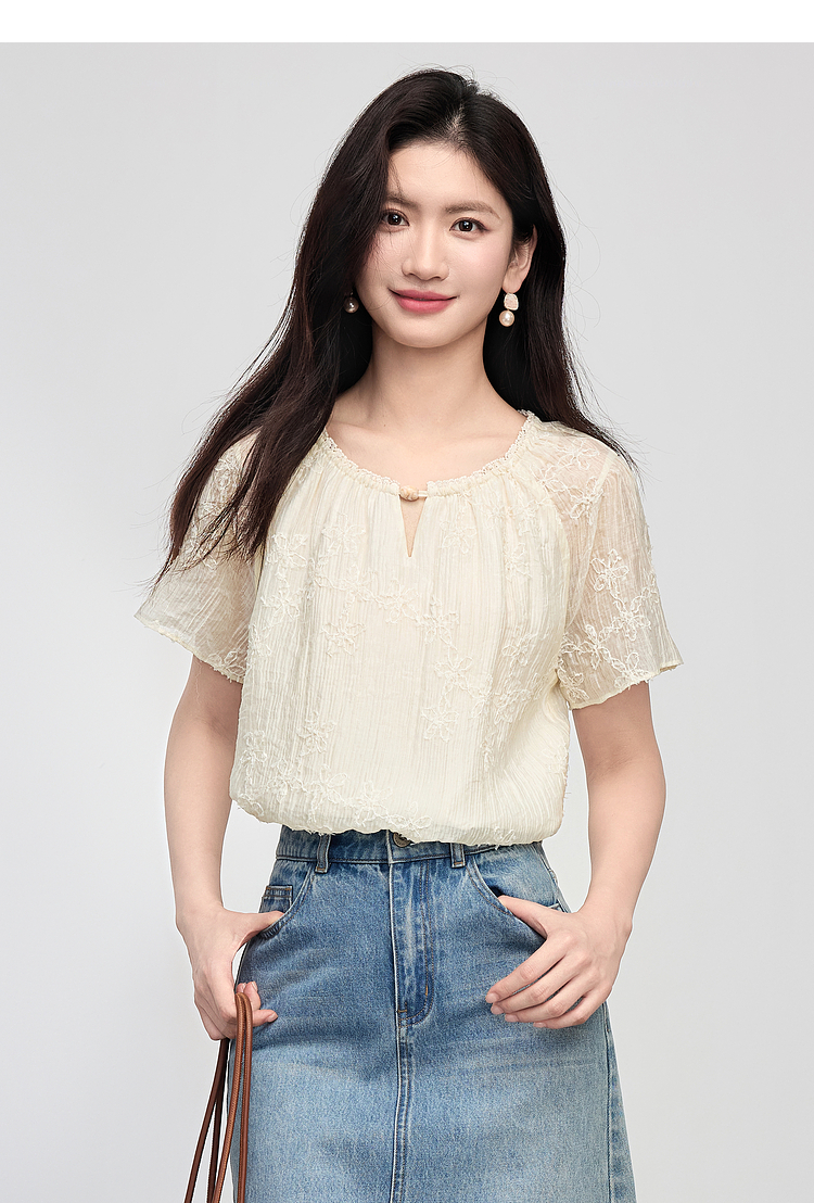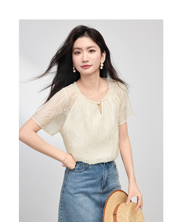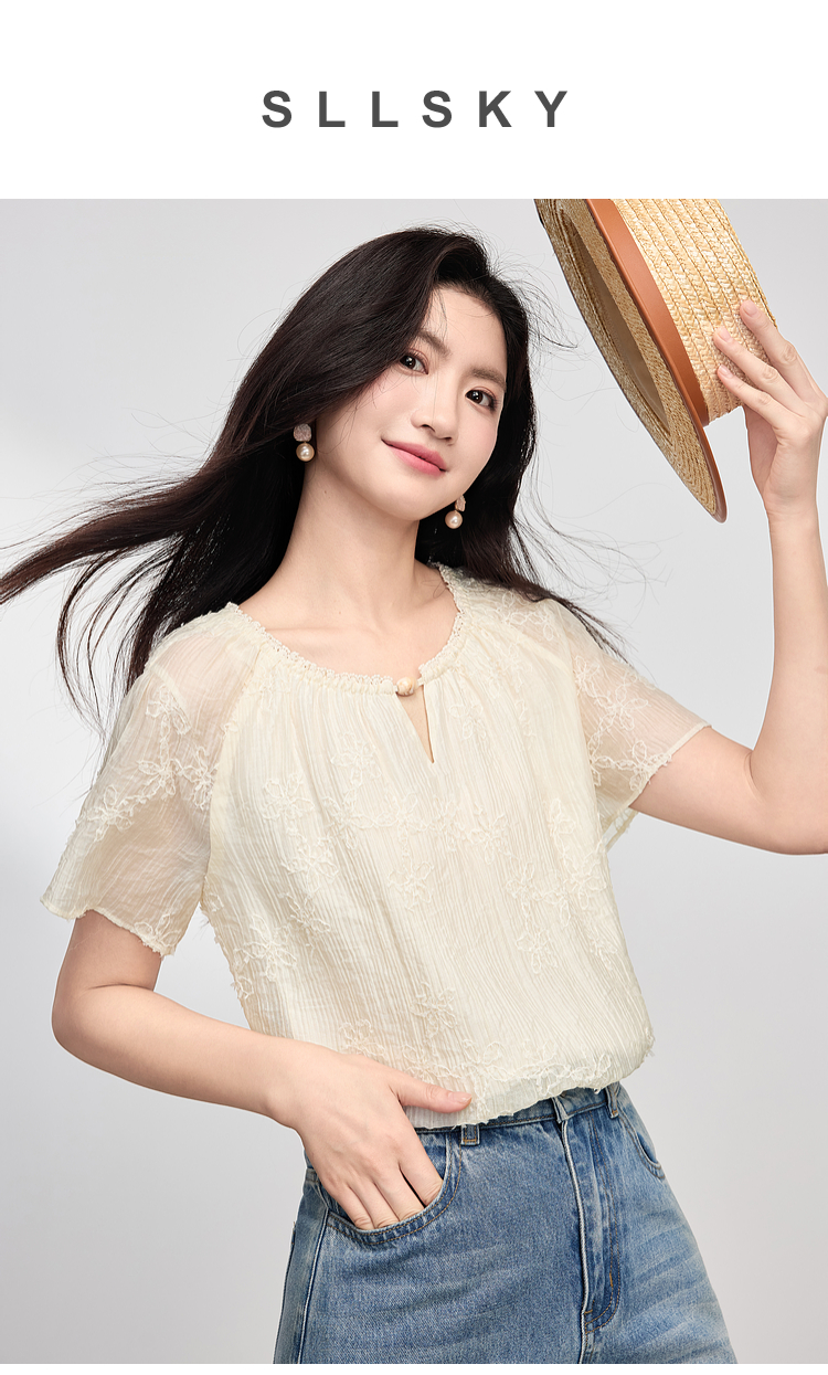 熙世界飞飞袖天丝雪纺衬衫女2025夏日新款轻中式蝴蝶纱盘刺绣上衣