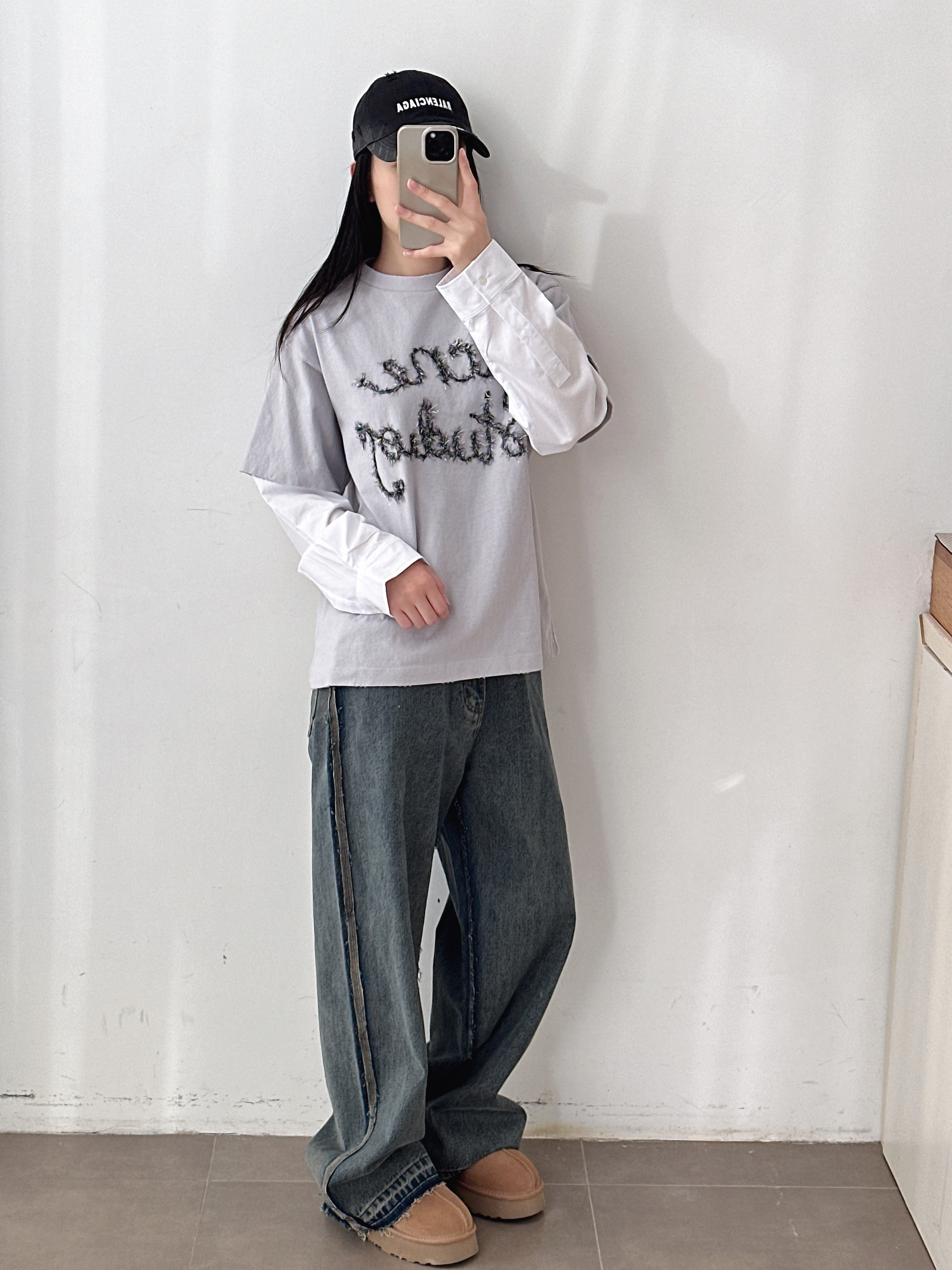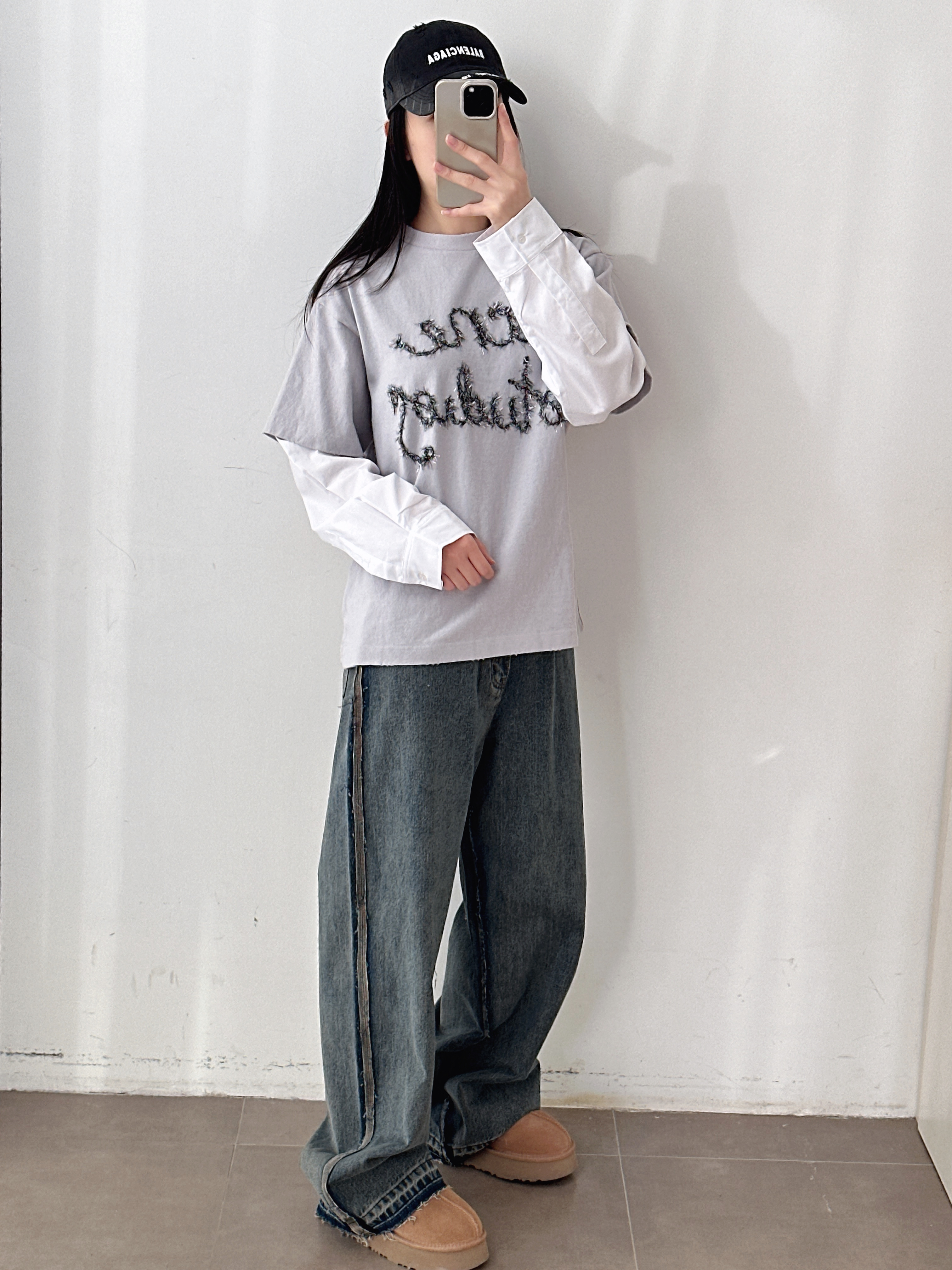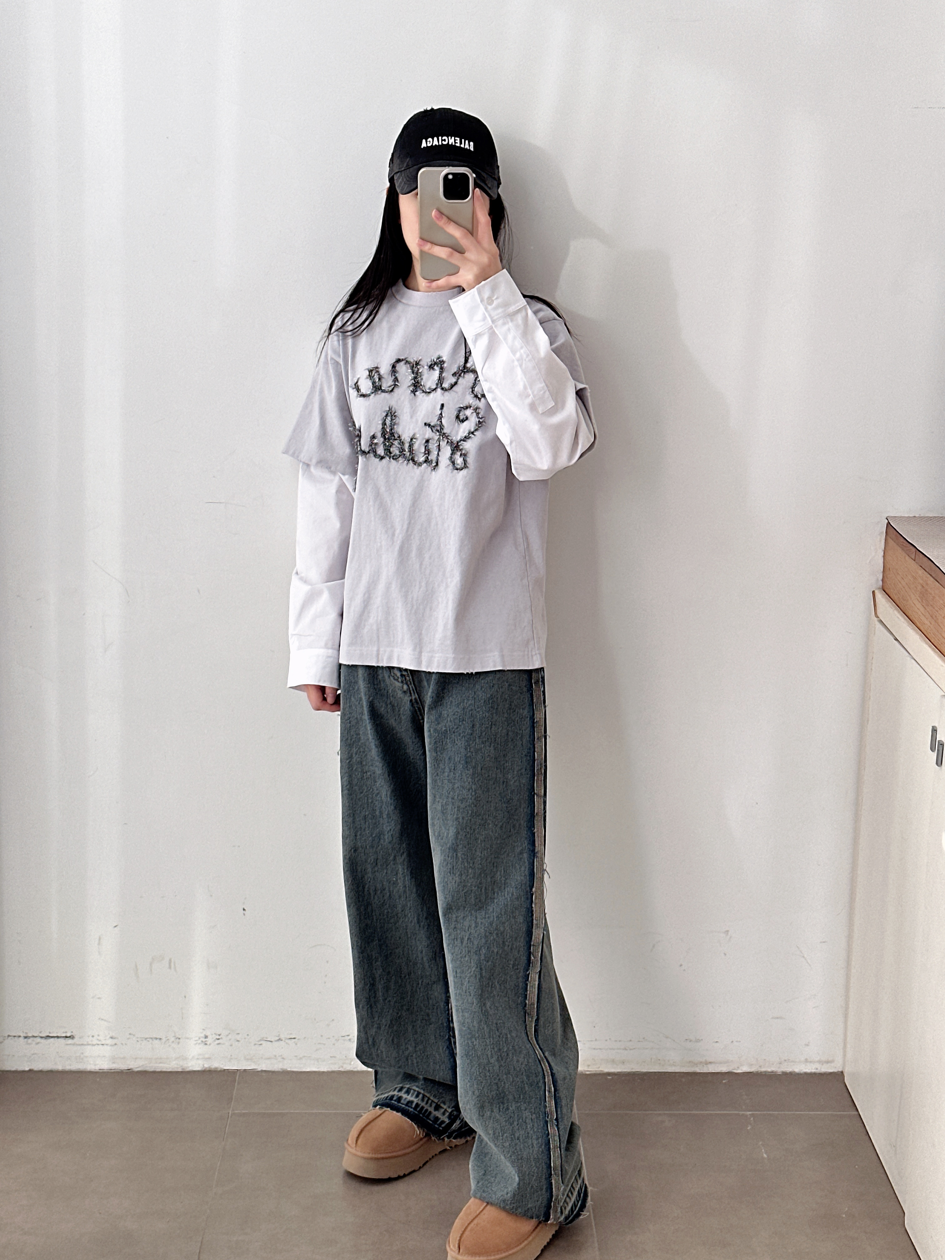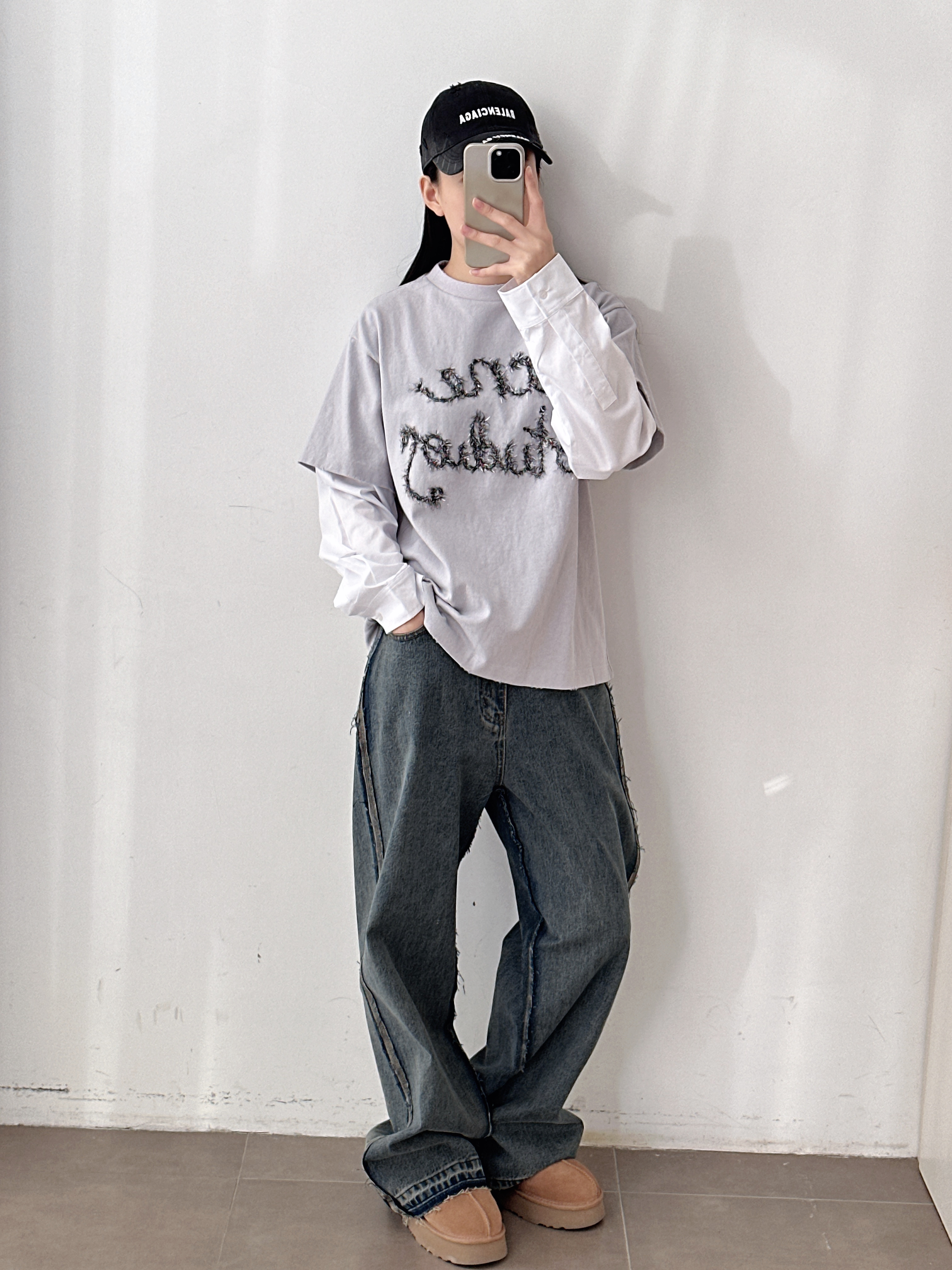 新款圆领字母刺绣拼接袖宽松假两件长袖T恤男女同款