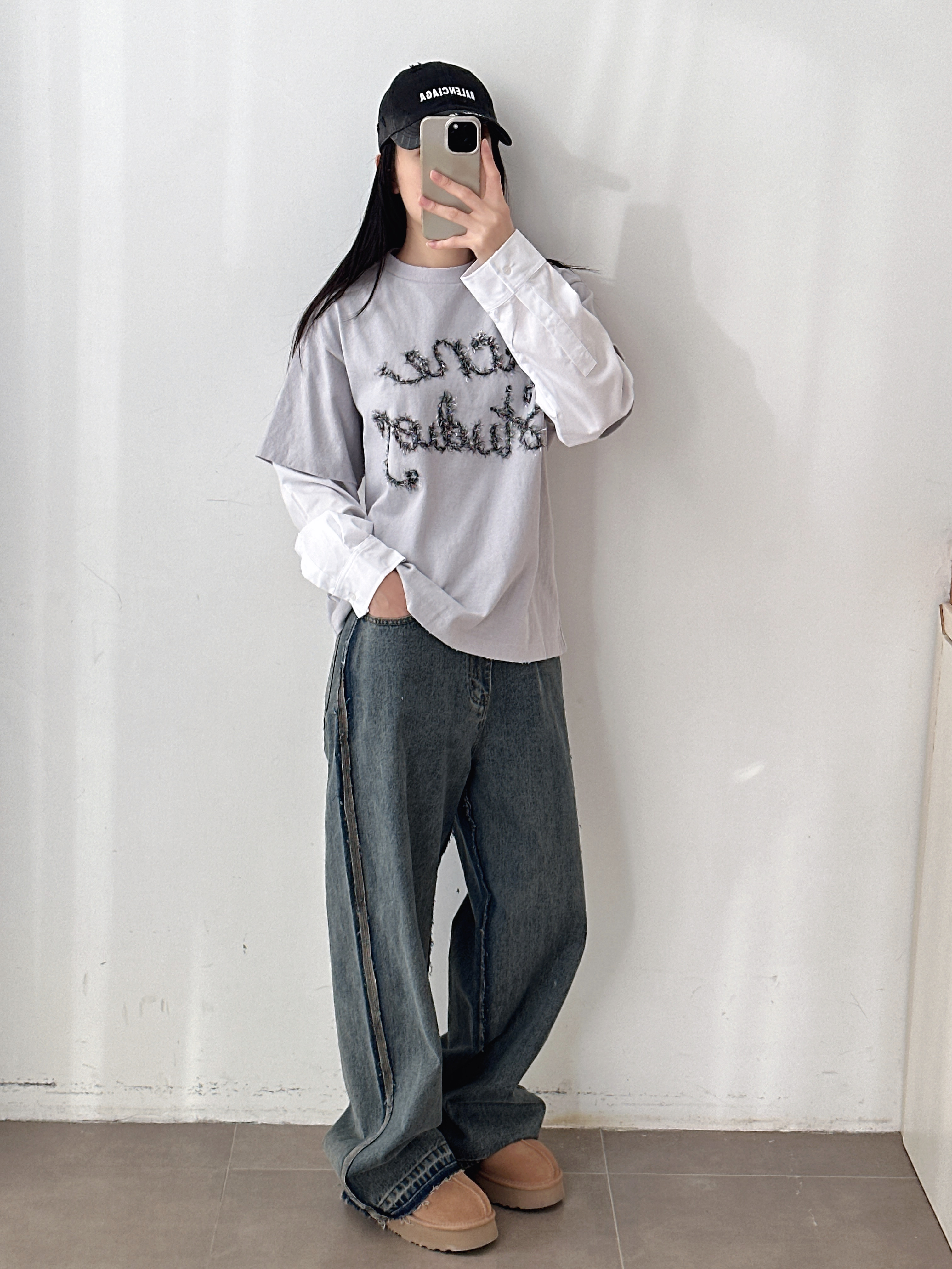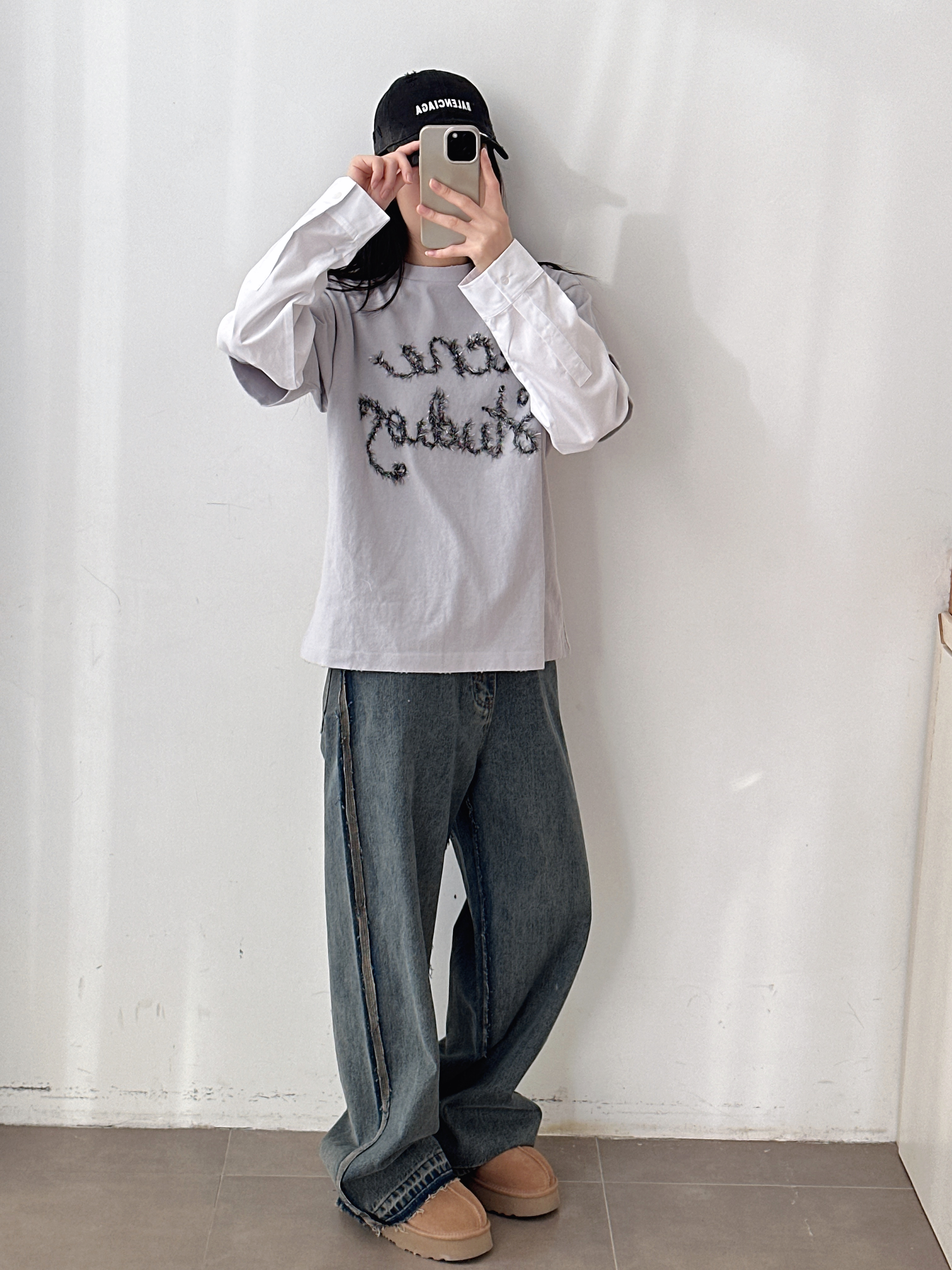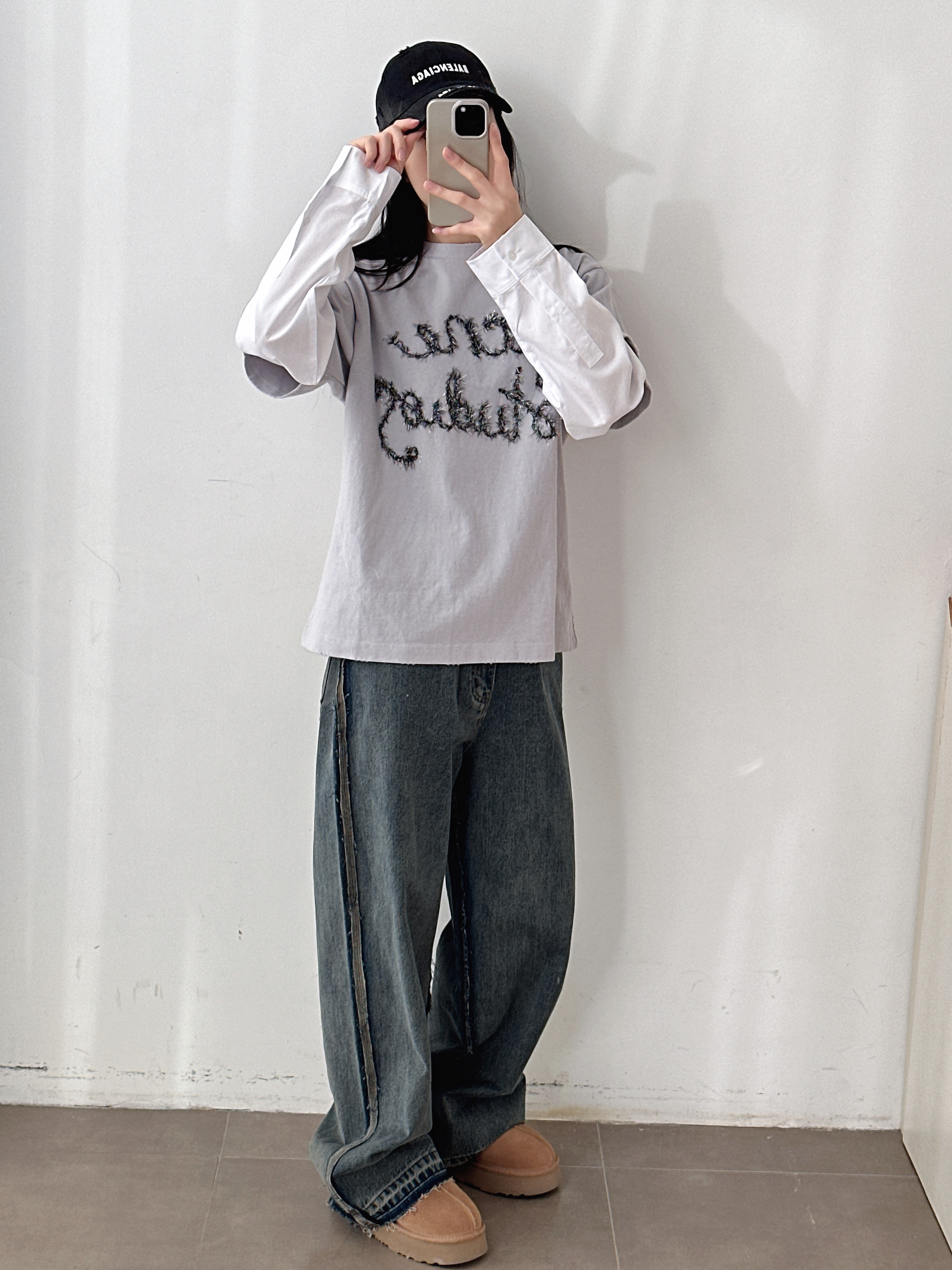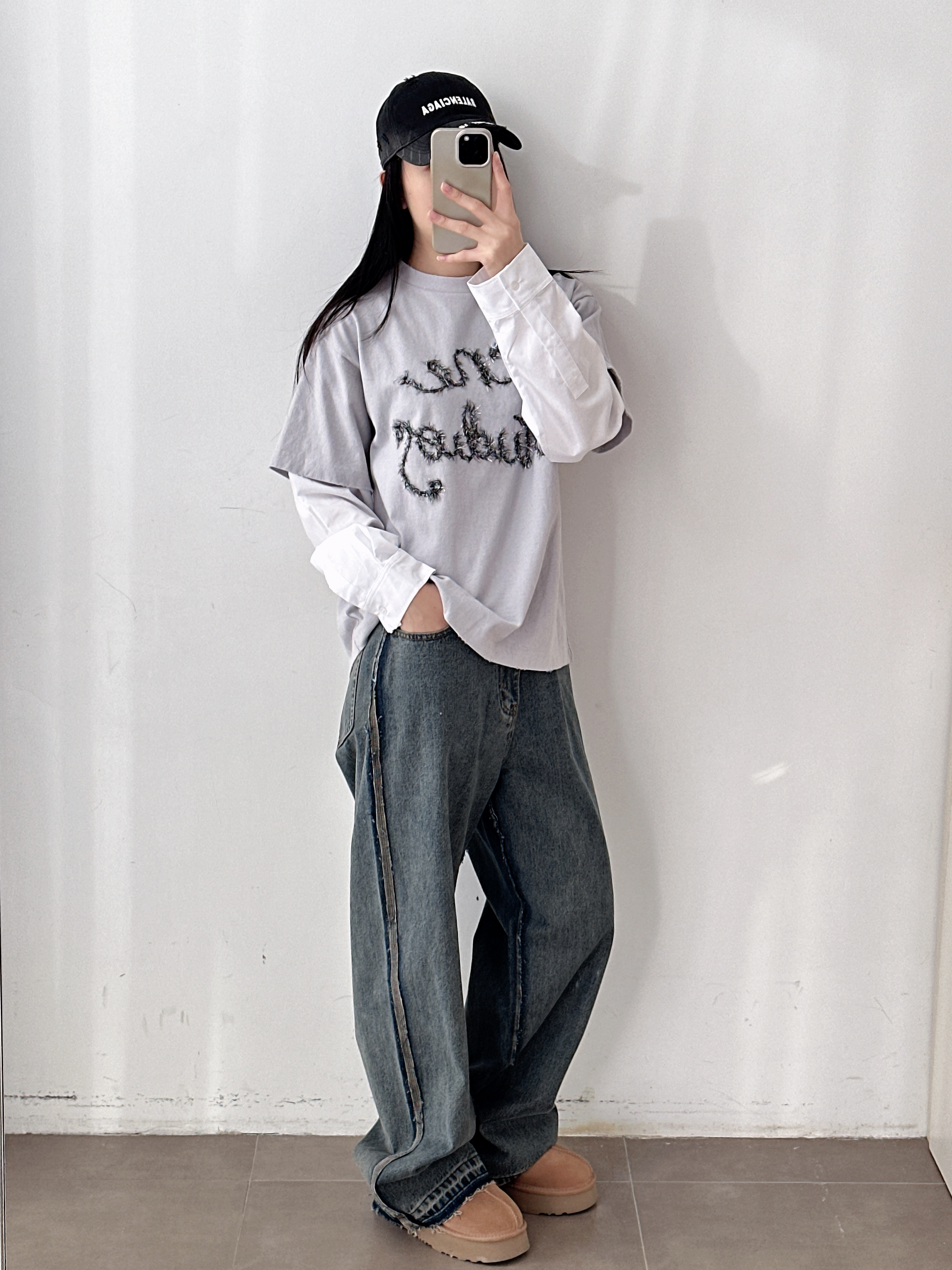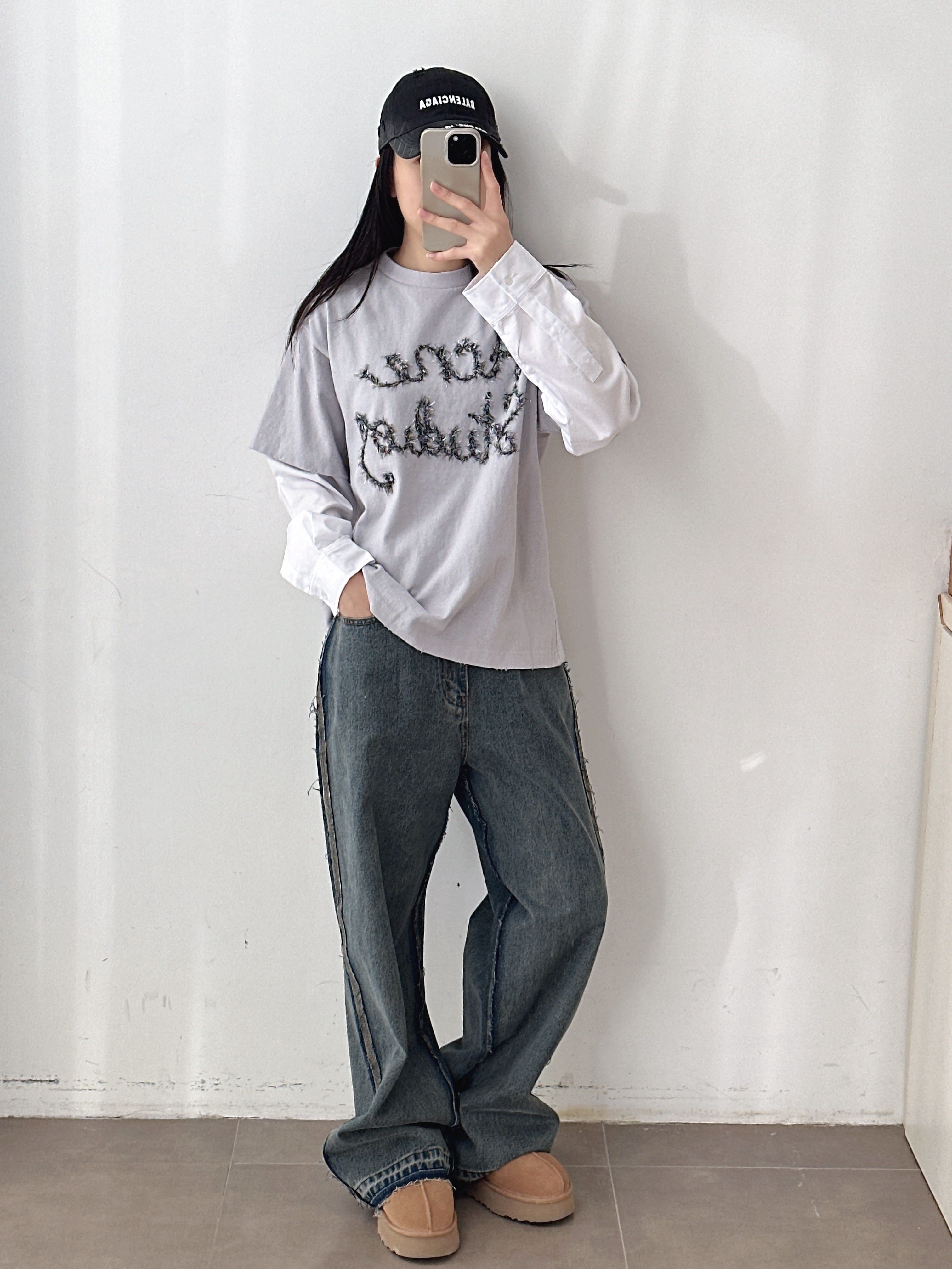 新款圆领字母刺绣拼接袖宽松假两件长袖T恤男女同款
