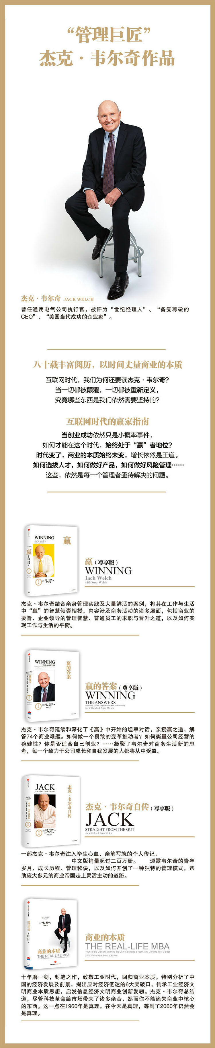 韦尔奇曾出版享誉全球的经典书籍《杰克·韦尔奇自传》与《赢》。此次,全新的作品《商业的本质》不仅是《赢》的延续,更是升华。