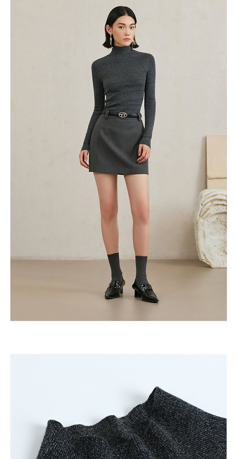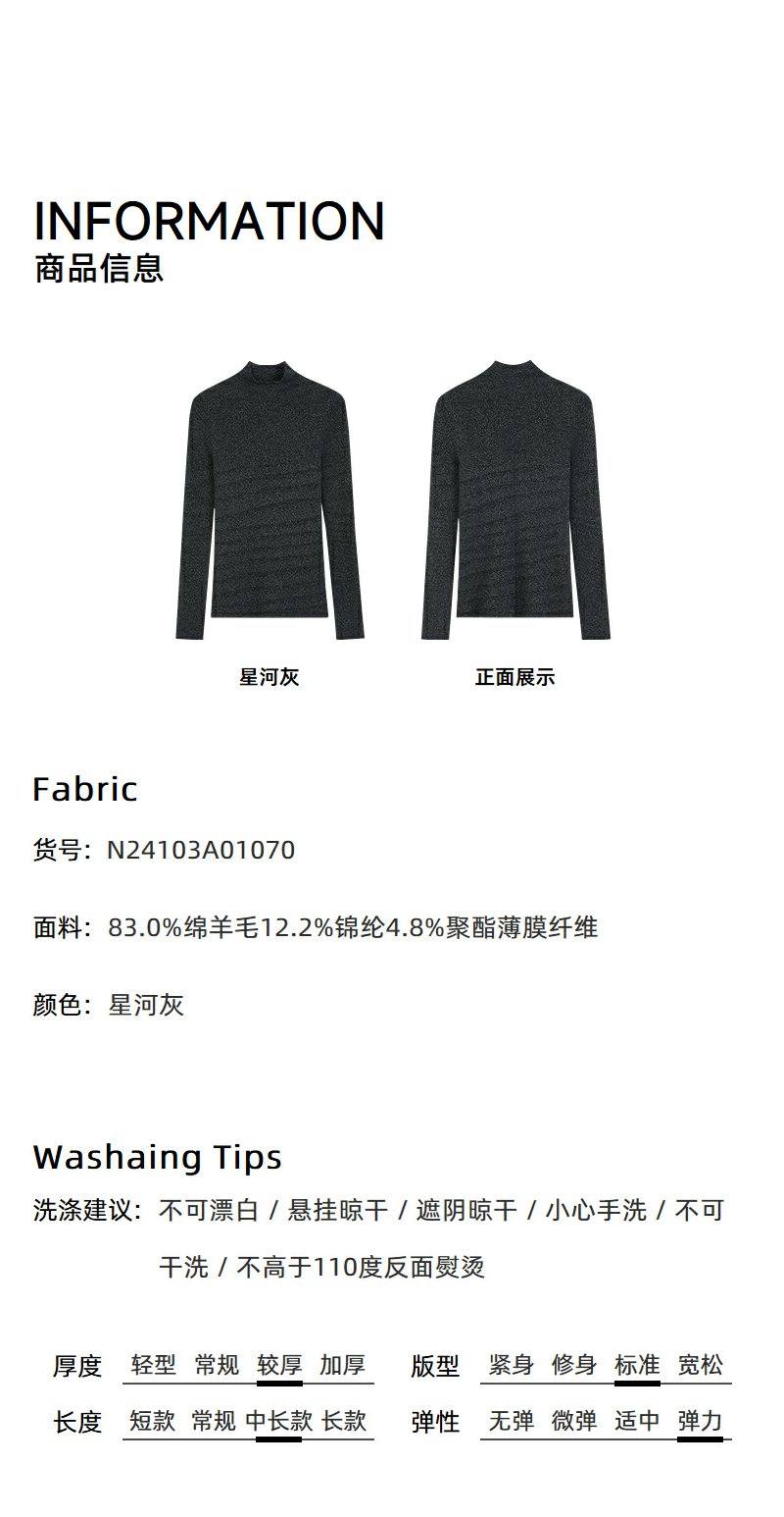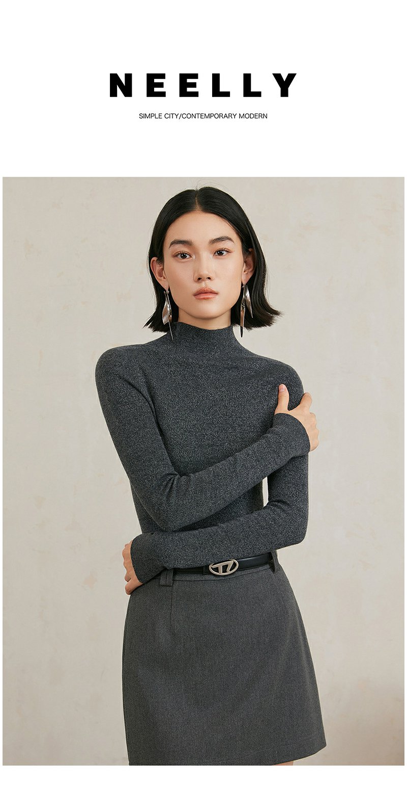 NEELLY纳俪商场同款冬季新款小高领无缝羊毛针织衫女高级灰色毛衣N24103A01070