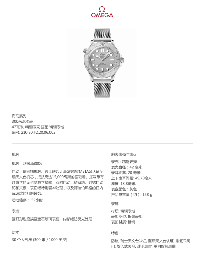 欧米茄海马系列 300米潜水表210.30.42.20.06.002