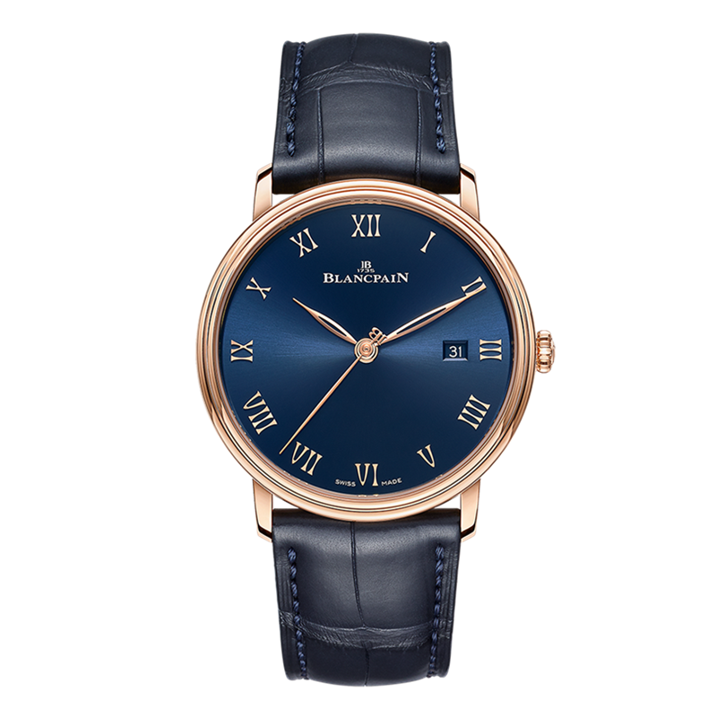 镜面 材质 | 蓝宝石水晶玻璃 | 表盘 | 18K红金表壳 蓝色表盘 罗马数字时标 日期显示 18K玫瑰金指针 时标 |