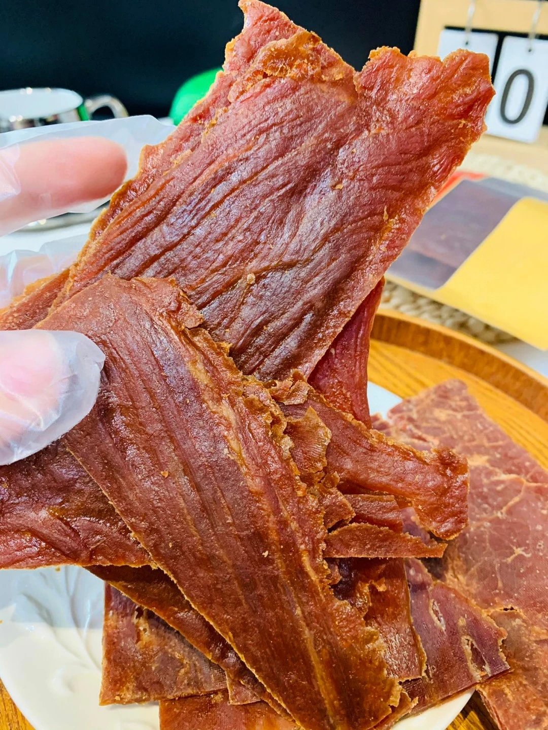 轻轻地撕一块肉脯,肉质丝丝分明,还能听到那“咝咝”的撕肉声,尝上一口,肉脯细腻有嚼劲,肉质紧实!!!