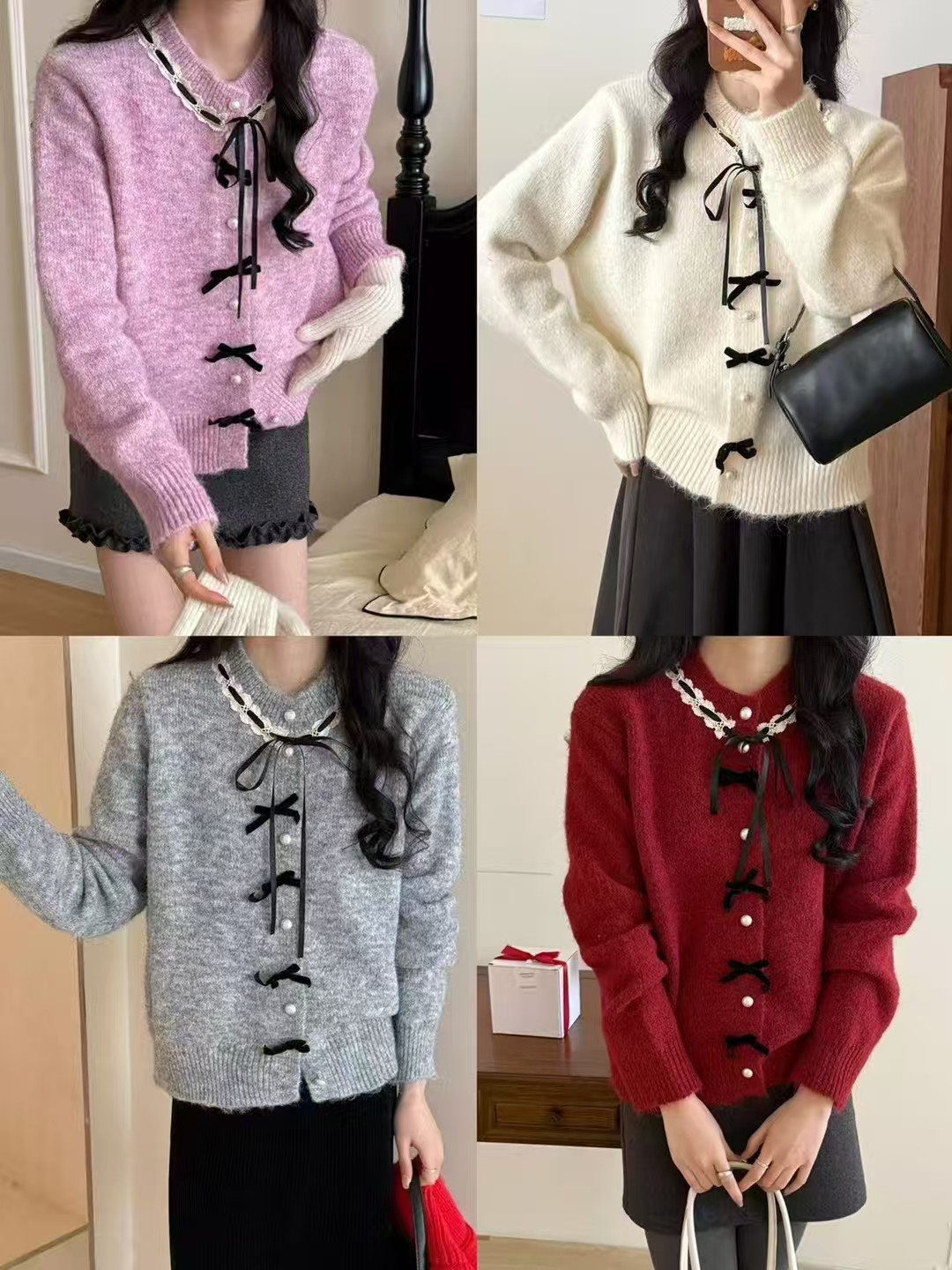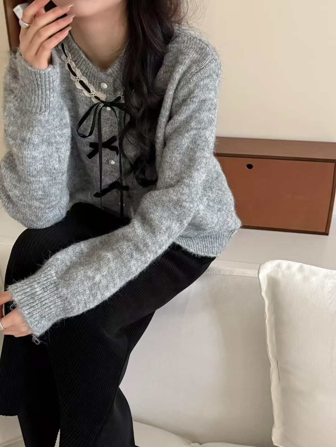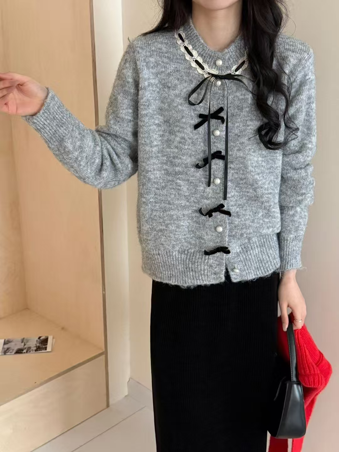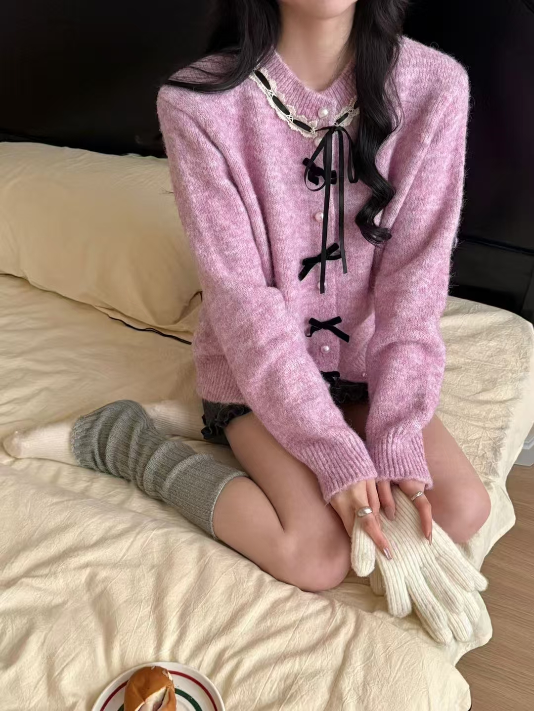【YW】无忧购韩系温柔圆领蕾丝花边系带蝴蝶结百搭软糯针织开衫毛衣86109(截单后7天发货)