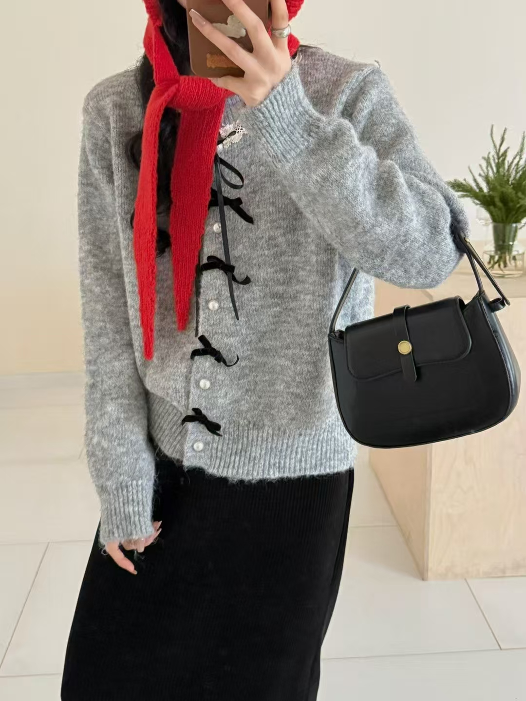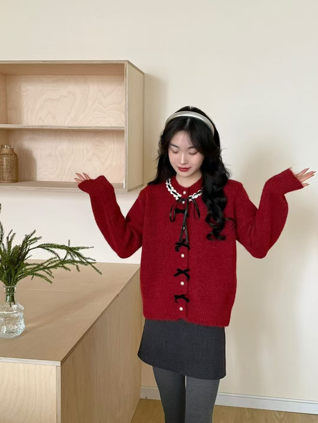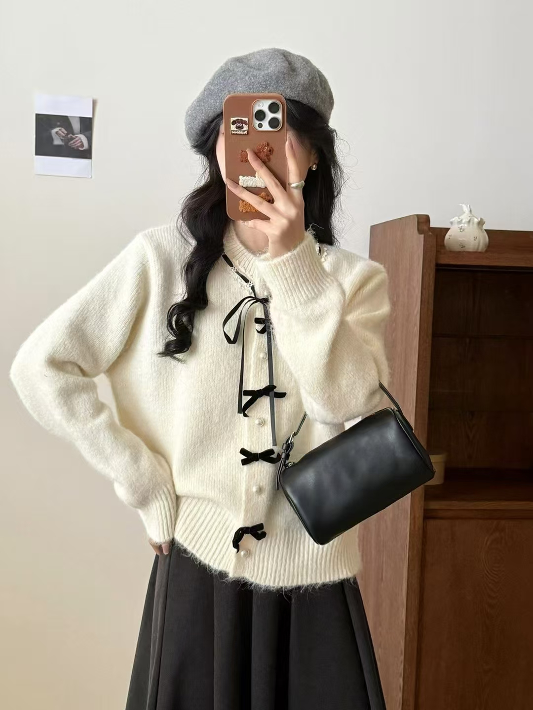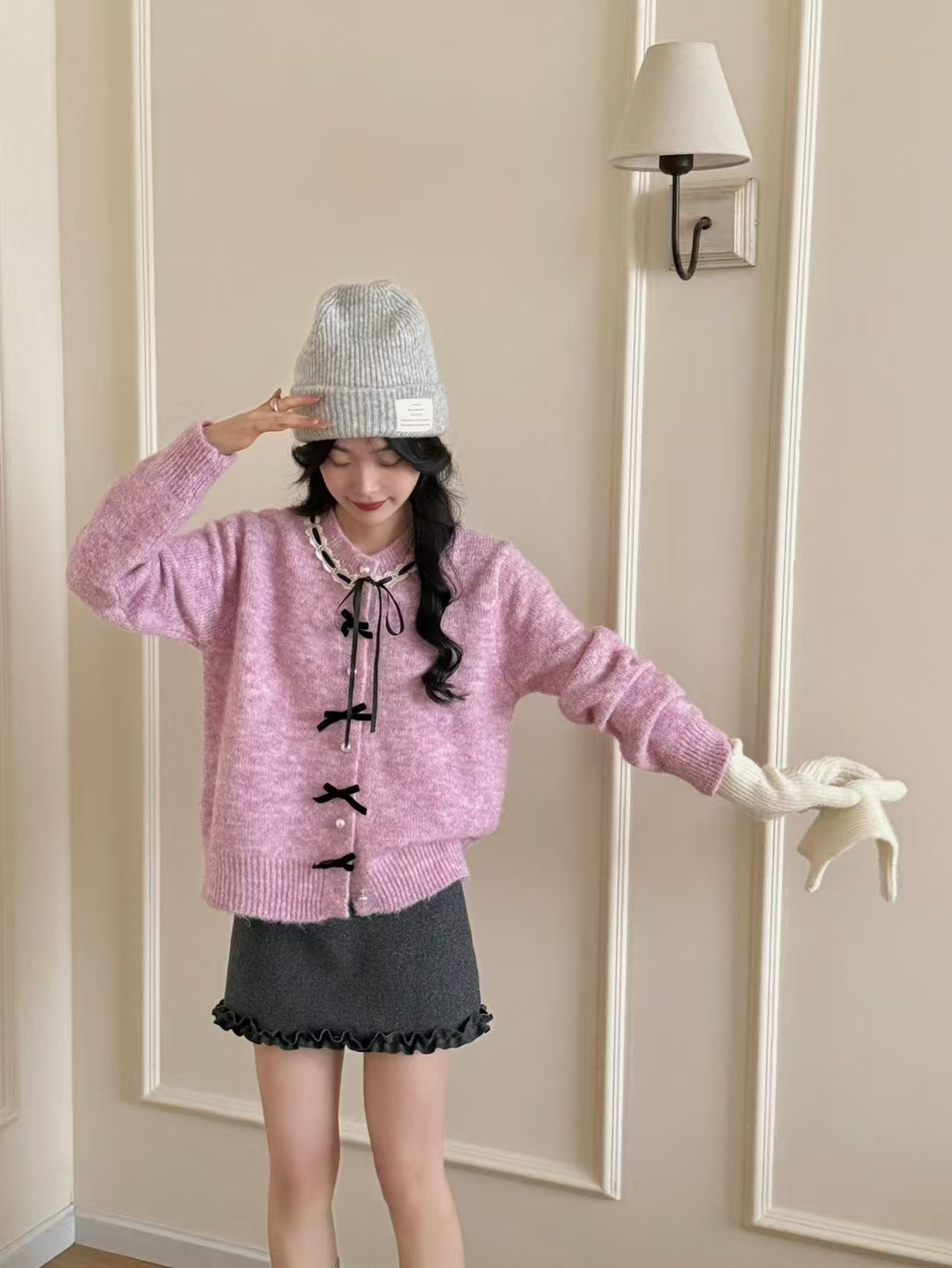【YW】无忧购韩系温柔圆领蕾丝花边系带蝴蝶结百搭软糯针织开衫毛衣86109(截单后7天发货)