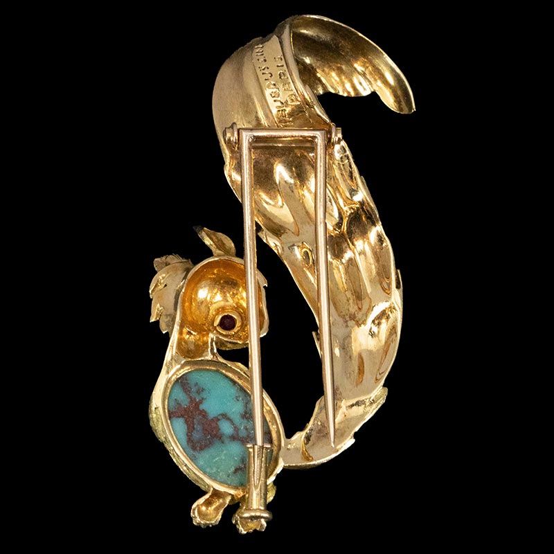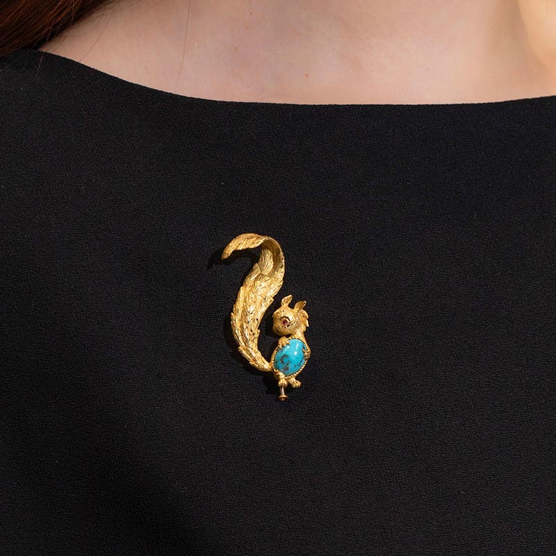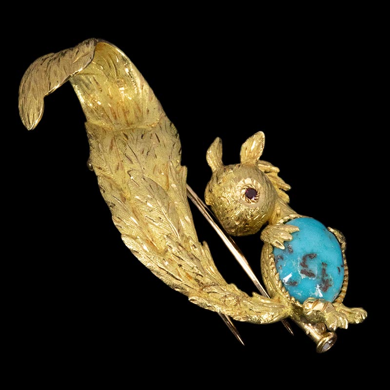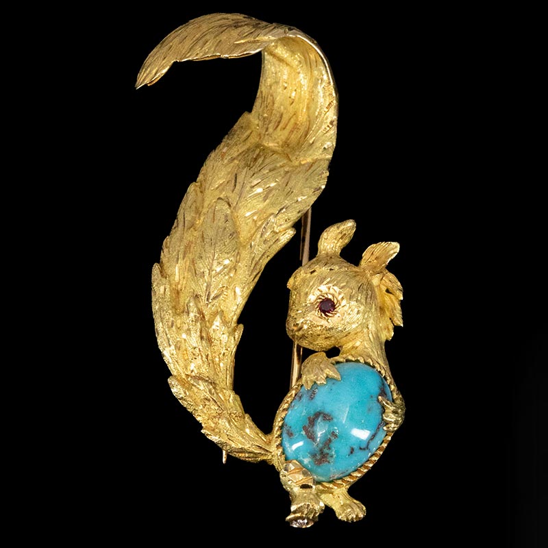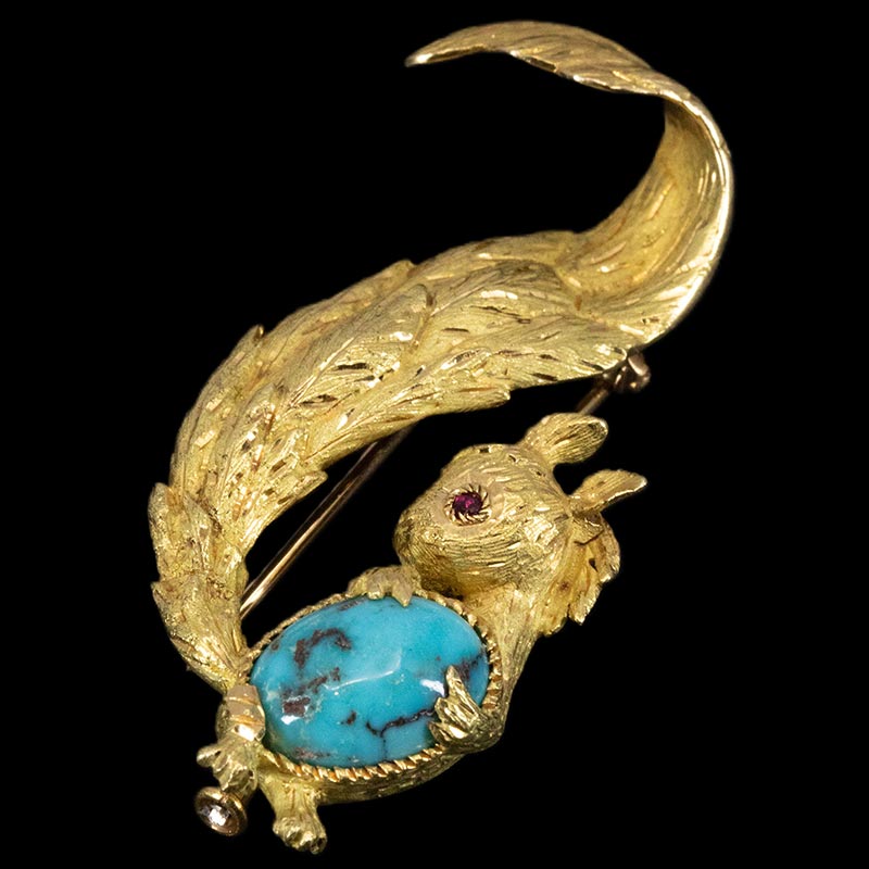 1970年代法国出品18K黄金镶嵌绿松石及红宝石小松鼠造型胸针