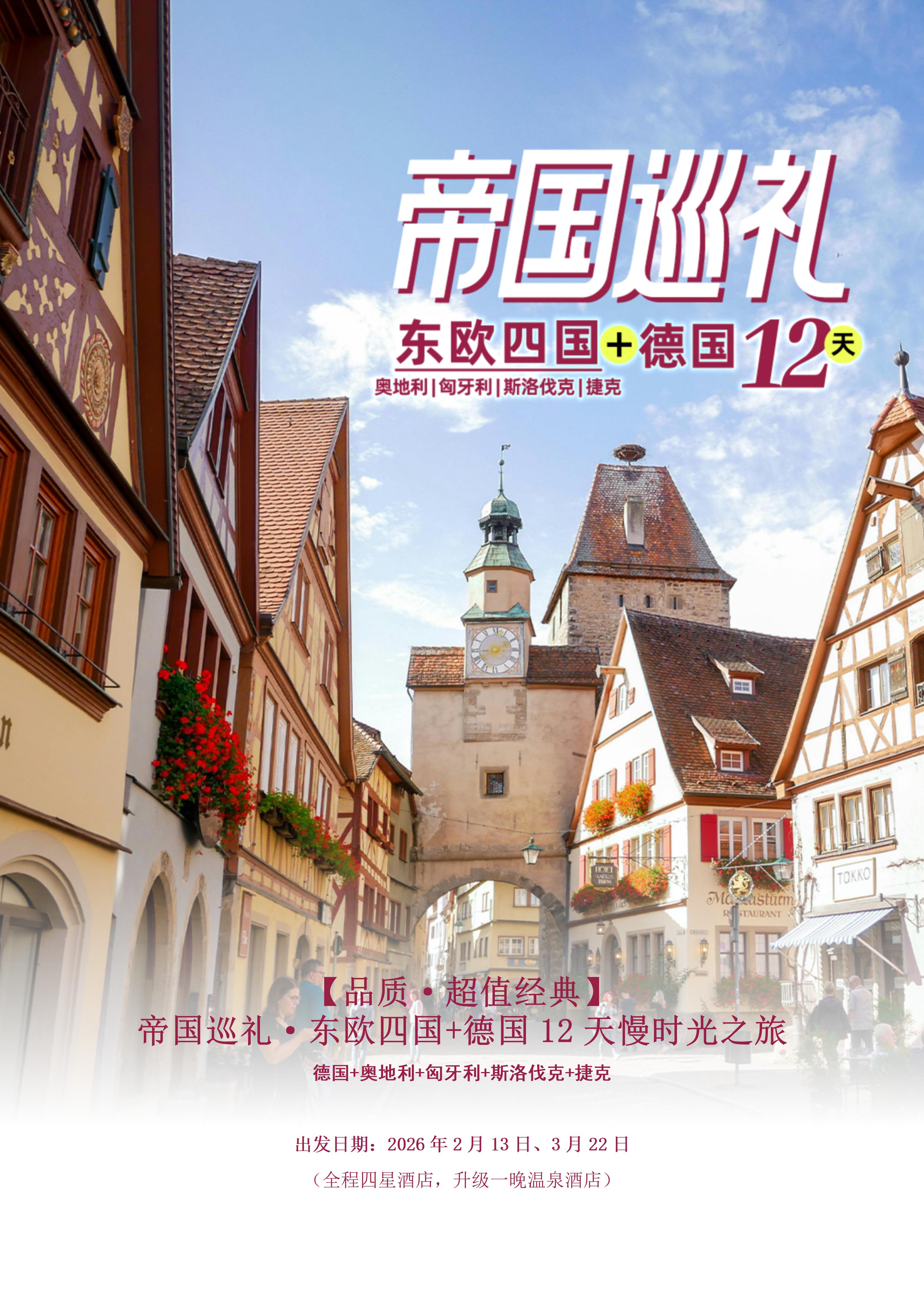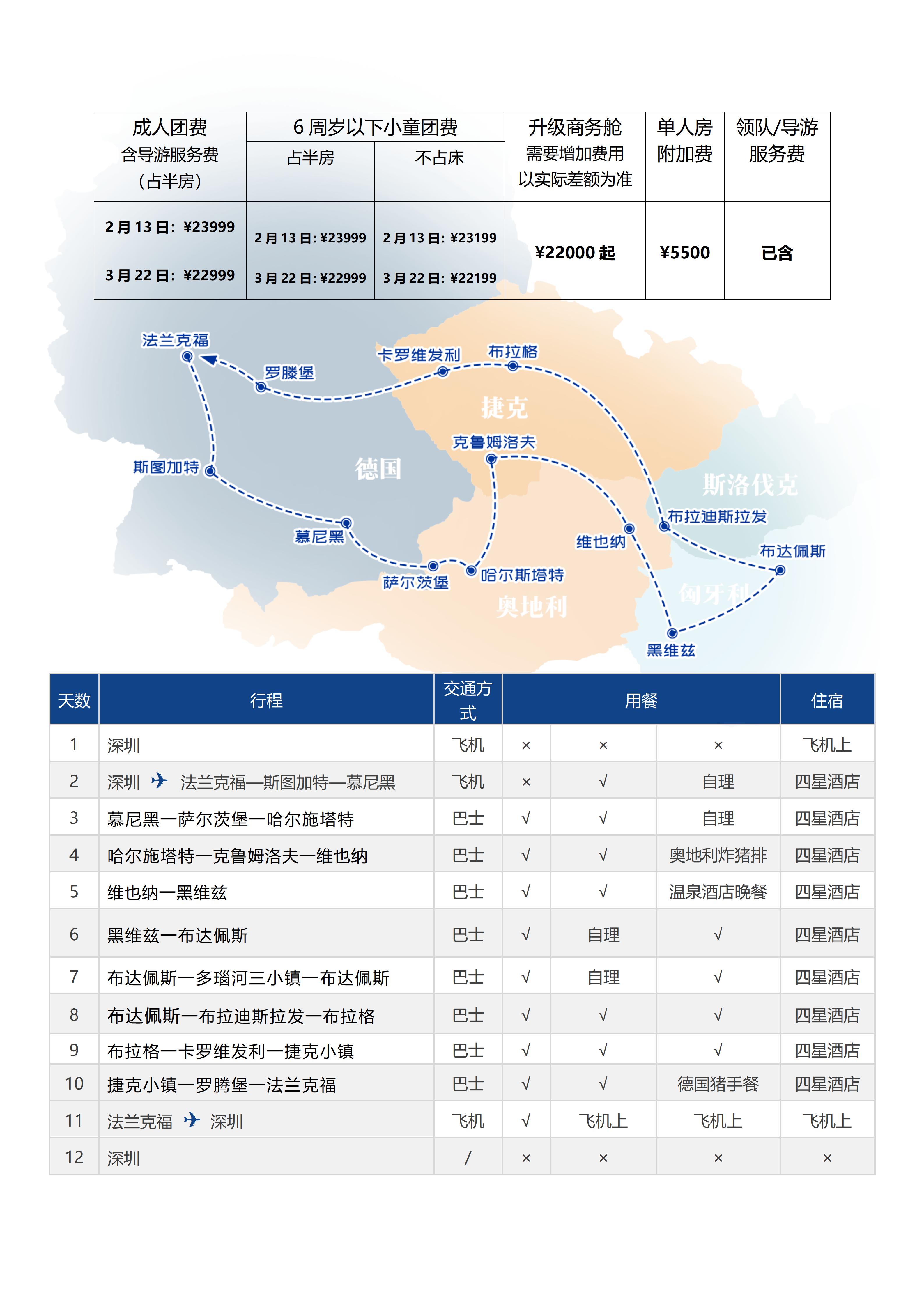 【春节】<东欧四国奥地利+匈牙利+斯洛伐克+捷克+德国12天慢时光之旅(深圳直飞往返)>多瑙河三镇巡游+五大世遗地巡礼+升级一晚温泉酒店