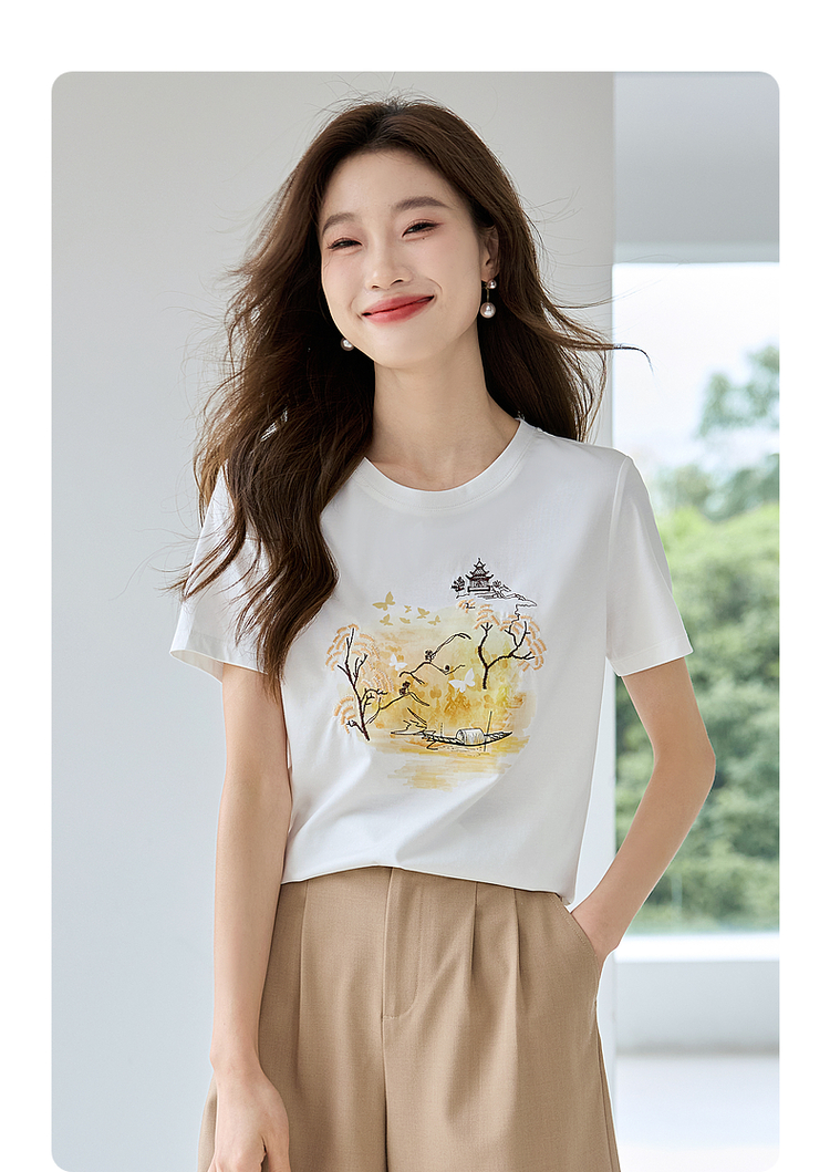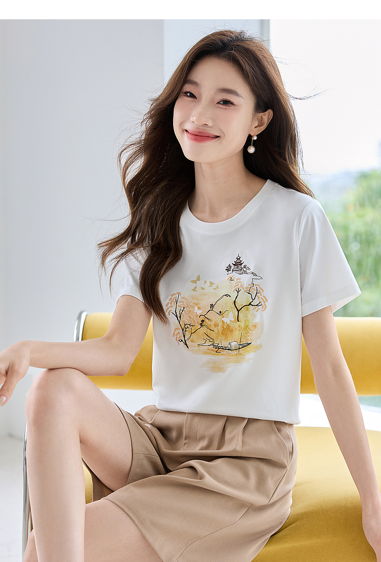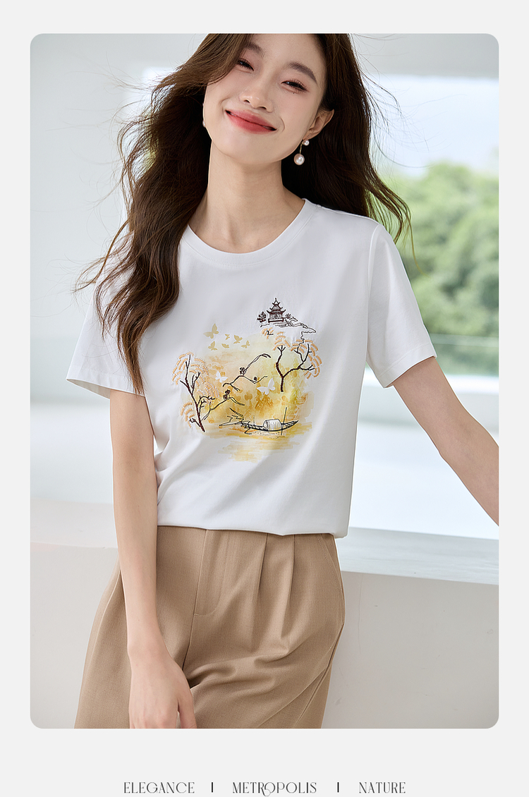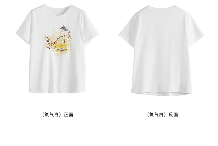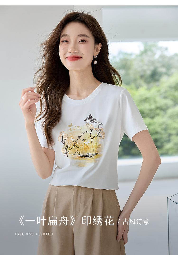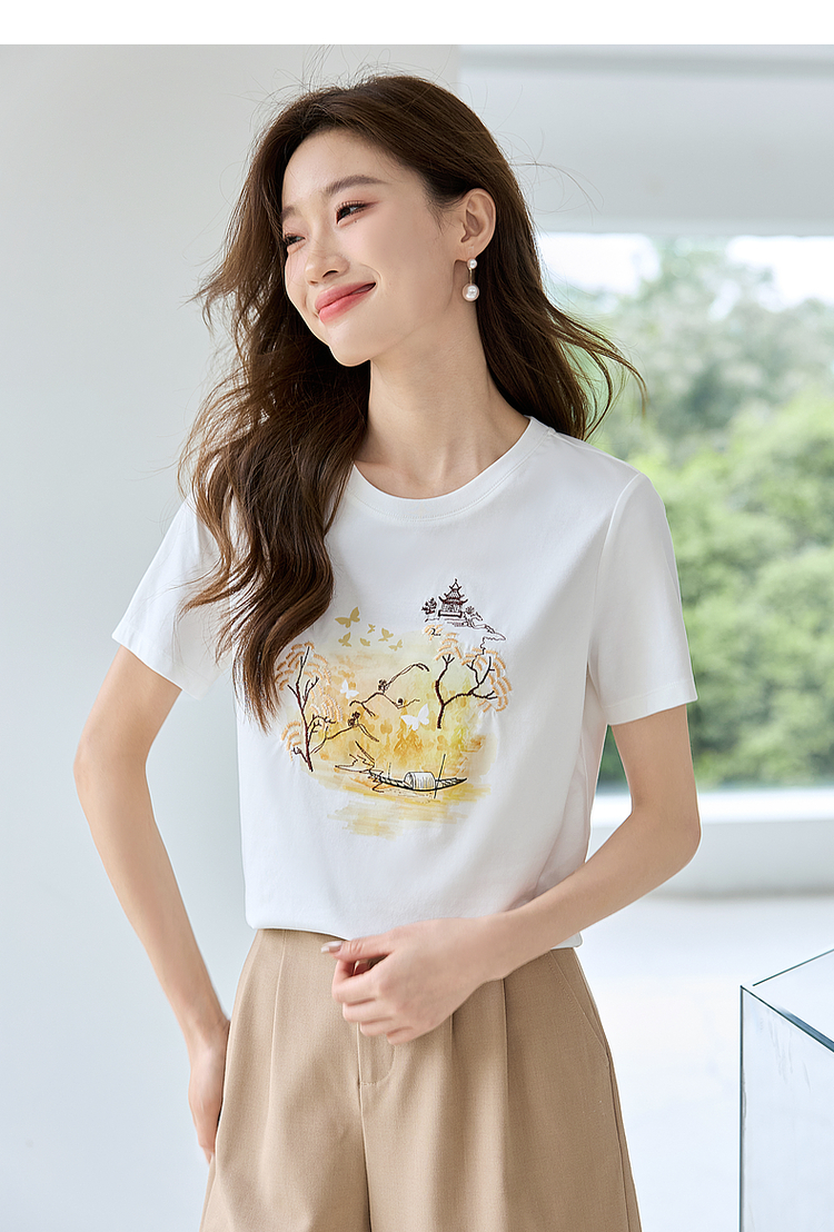 【专属特价】熙世界2025夏季新款轻国风水墨晕染刺绣白色T恤短袖设计感上衣