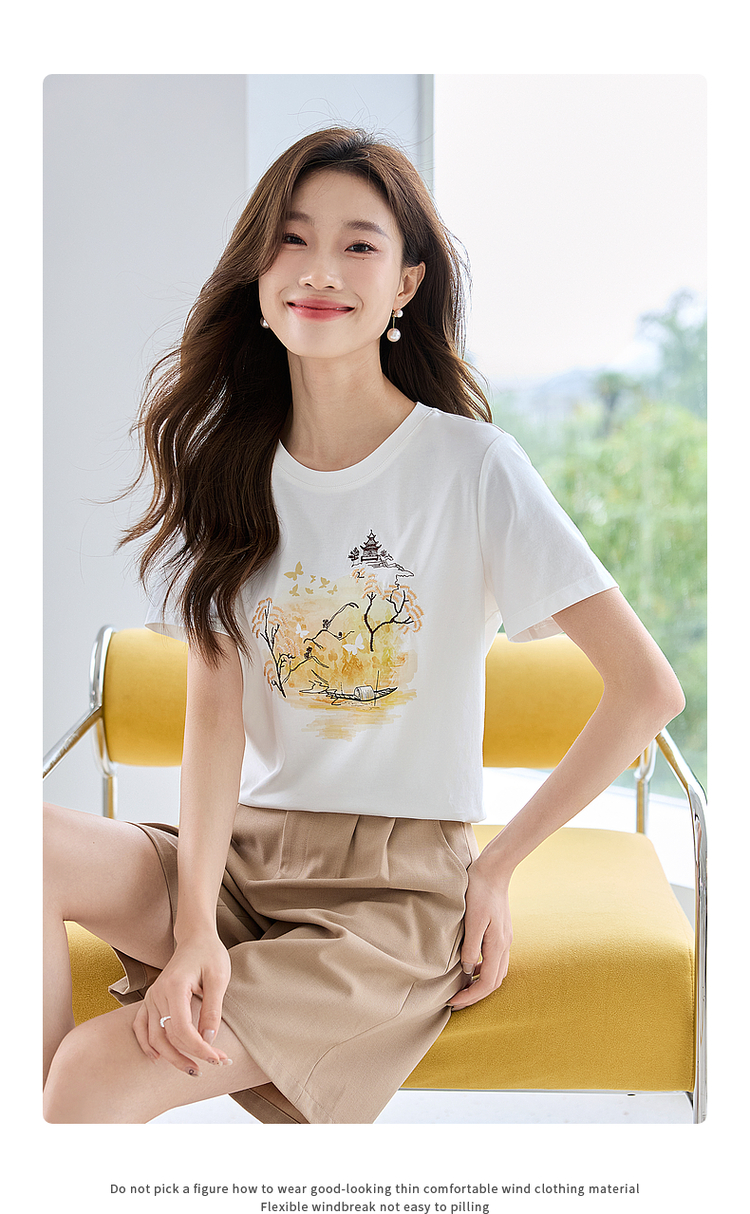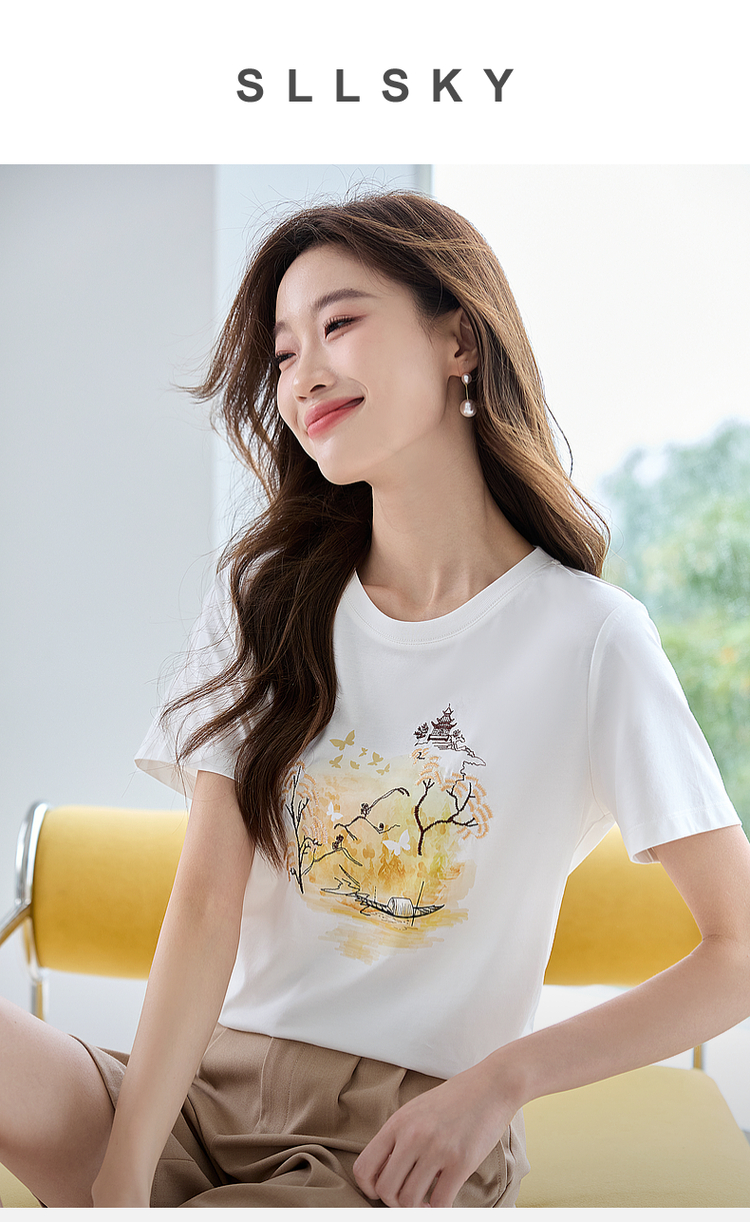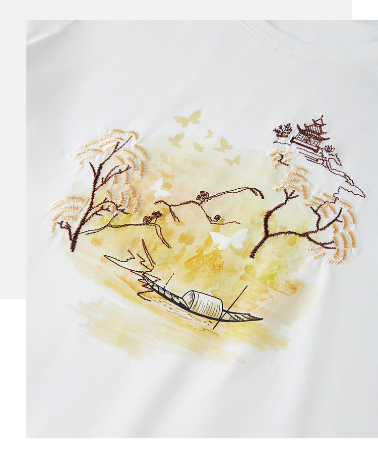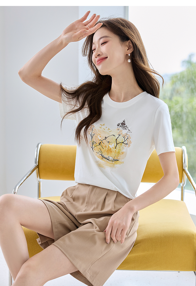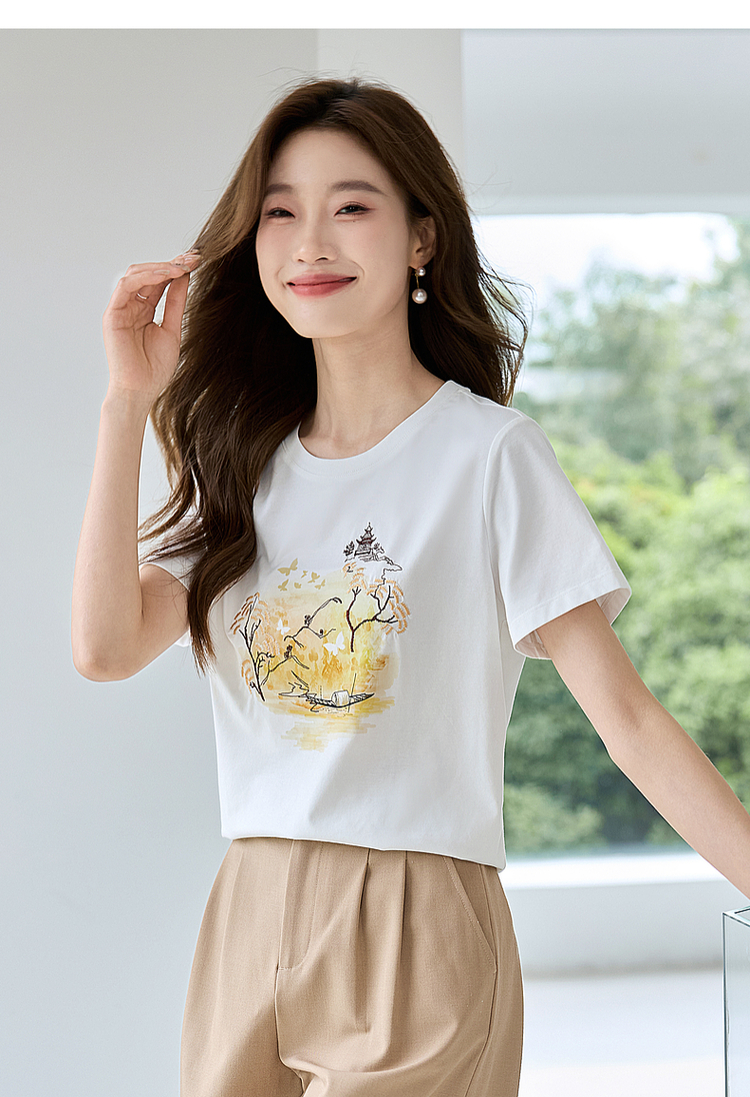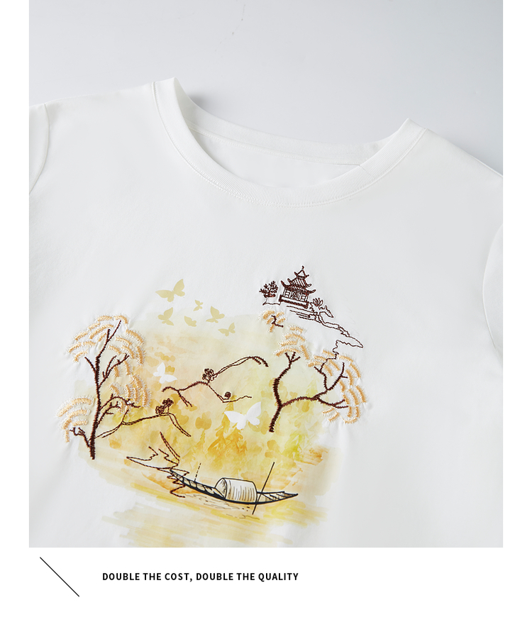 【专属特价】熙世界2025夏季新款轻国风水墨晕染刺绣白色T恤短袖设计感上衣