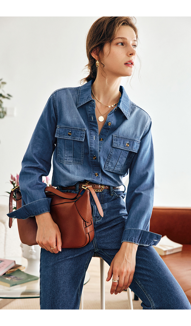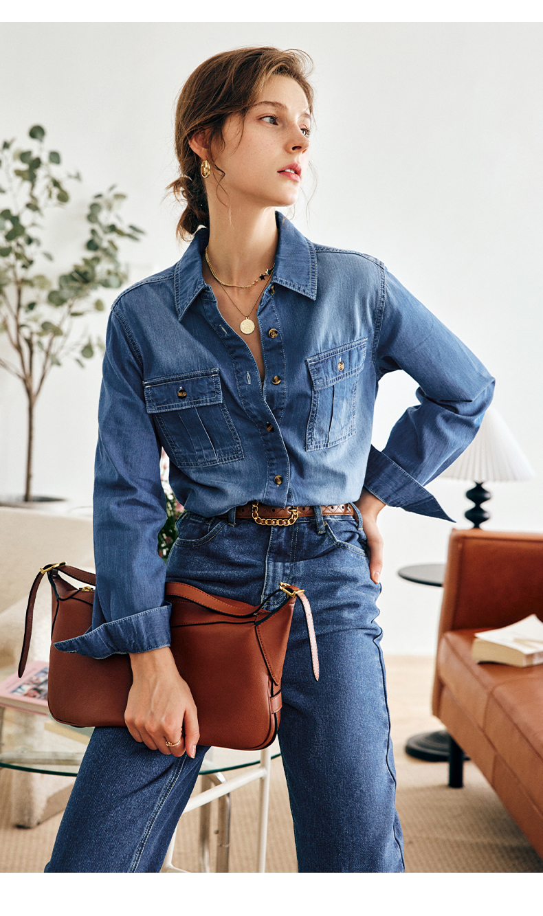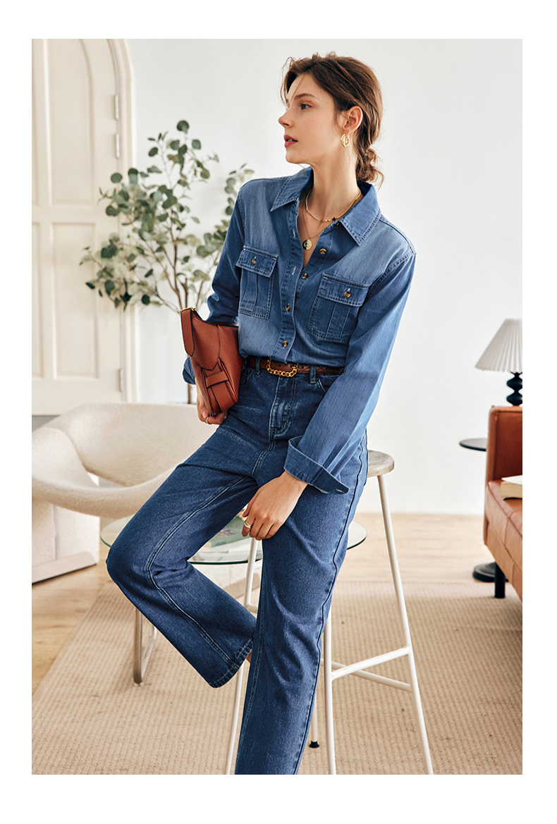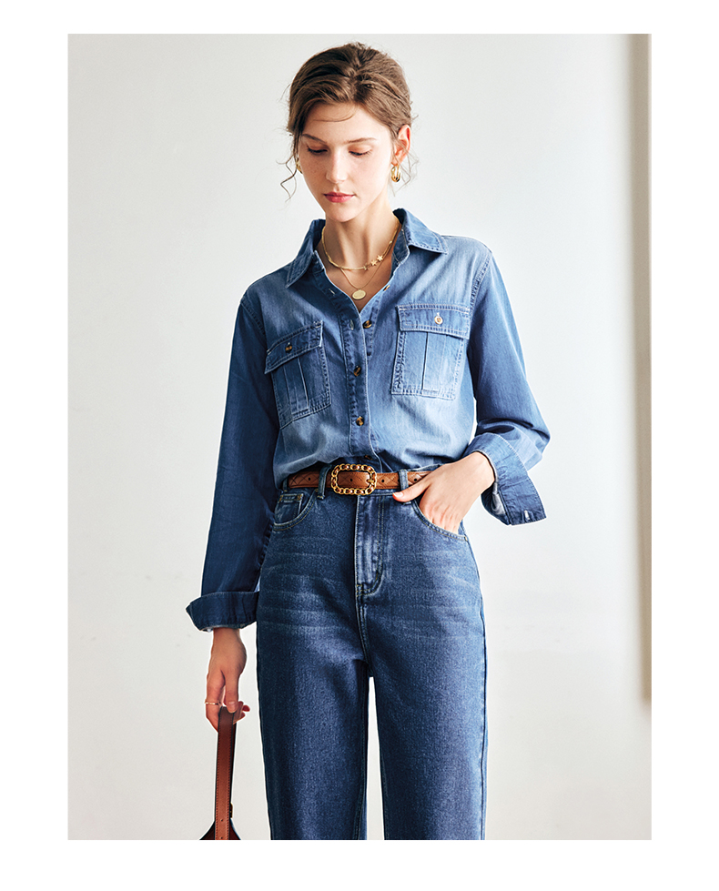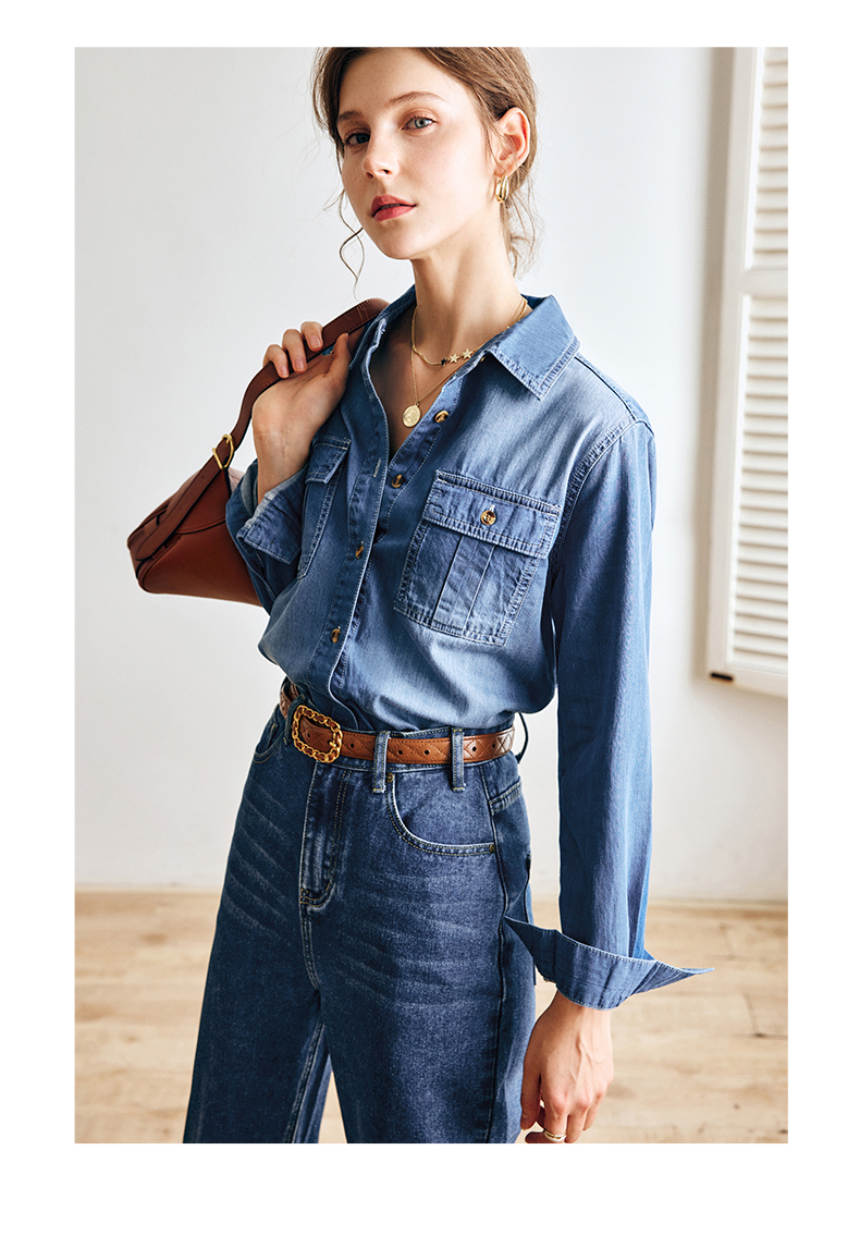 OLrain法式蓝色牛仔衬衫女早秋2022年新款复古宽松气质翻领衬衣