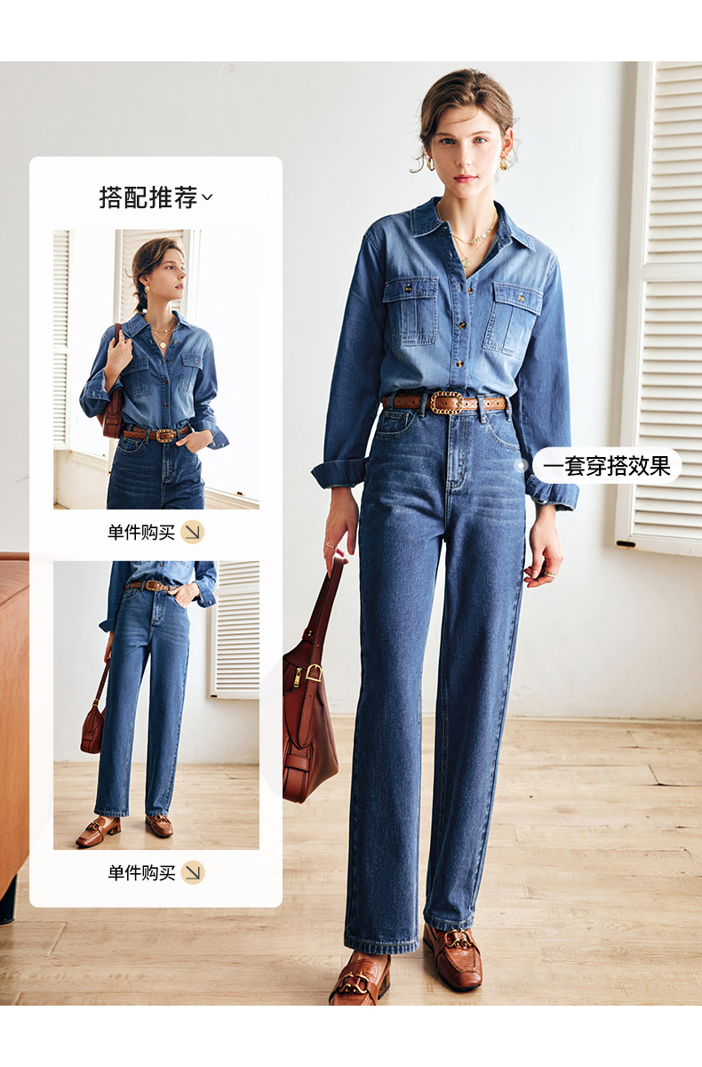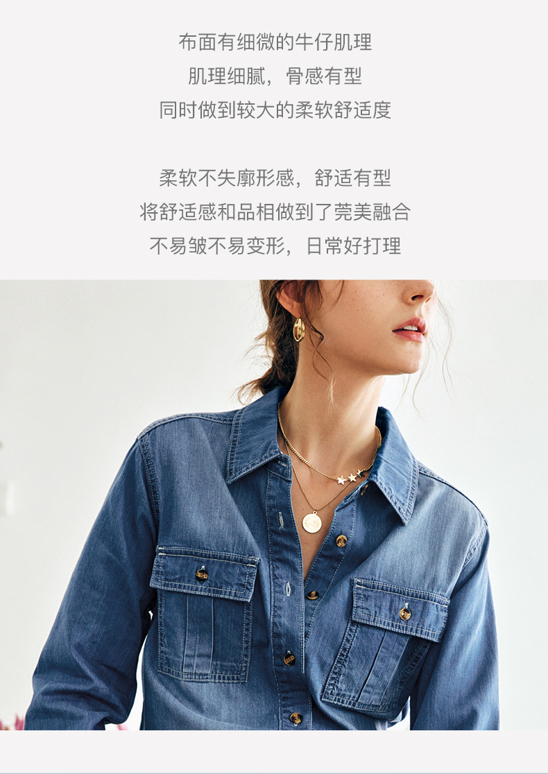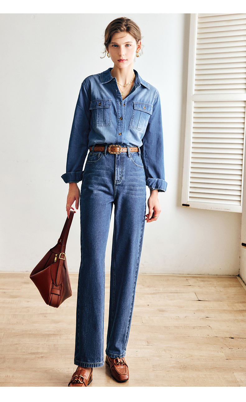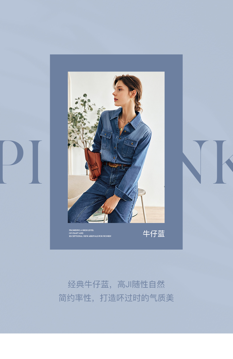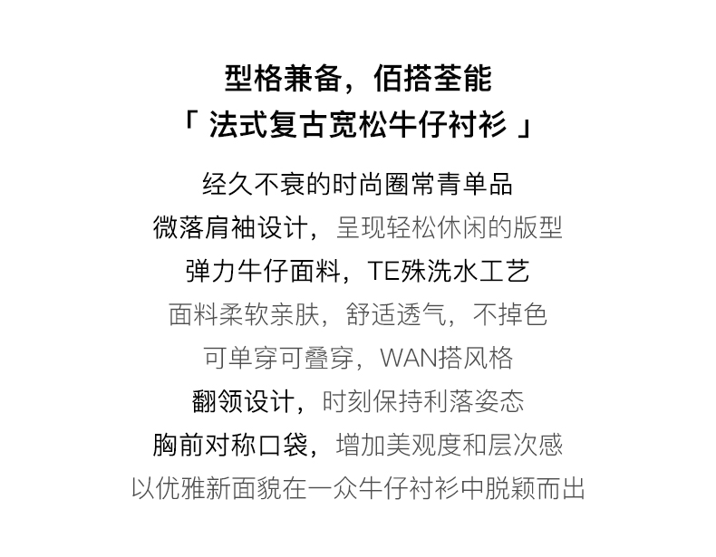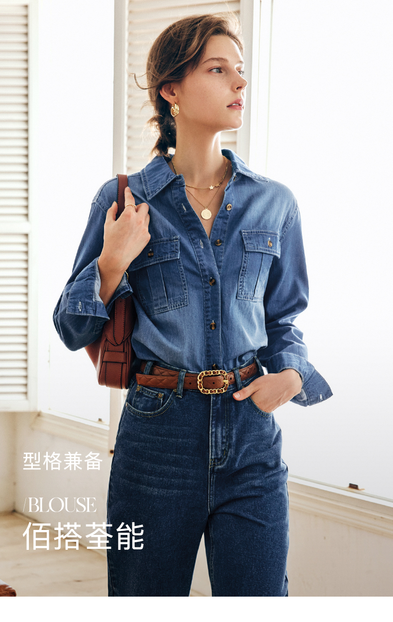 OLrain法式蓝色牛仔衬衫女早秋2022年新款复古宽松气质翻领衬衣