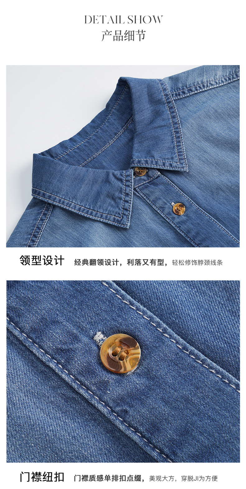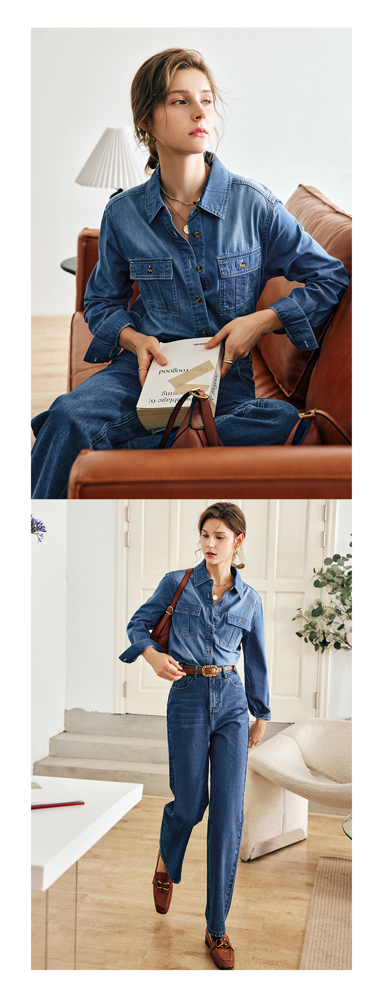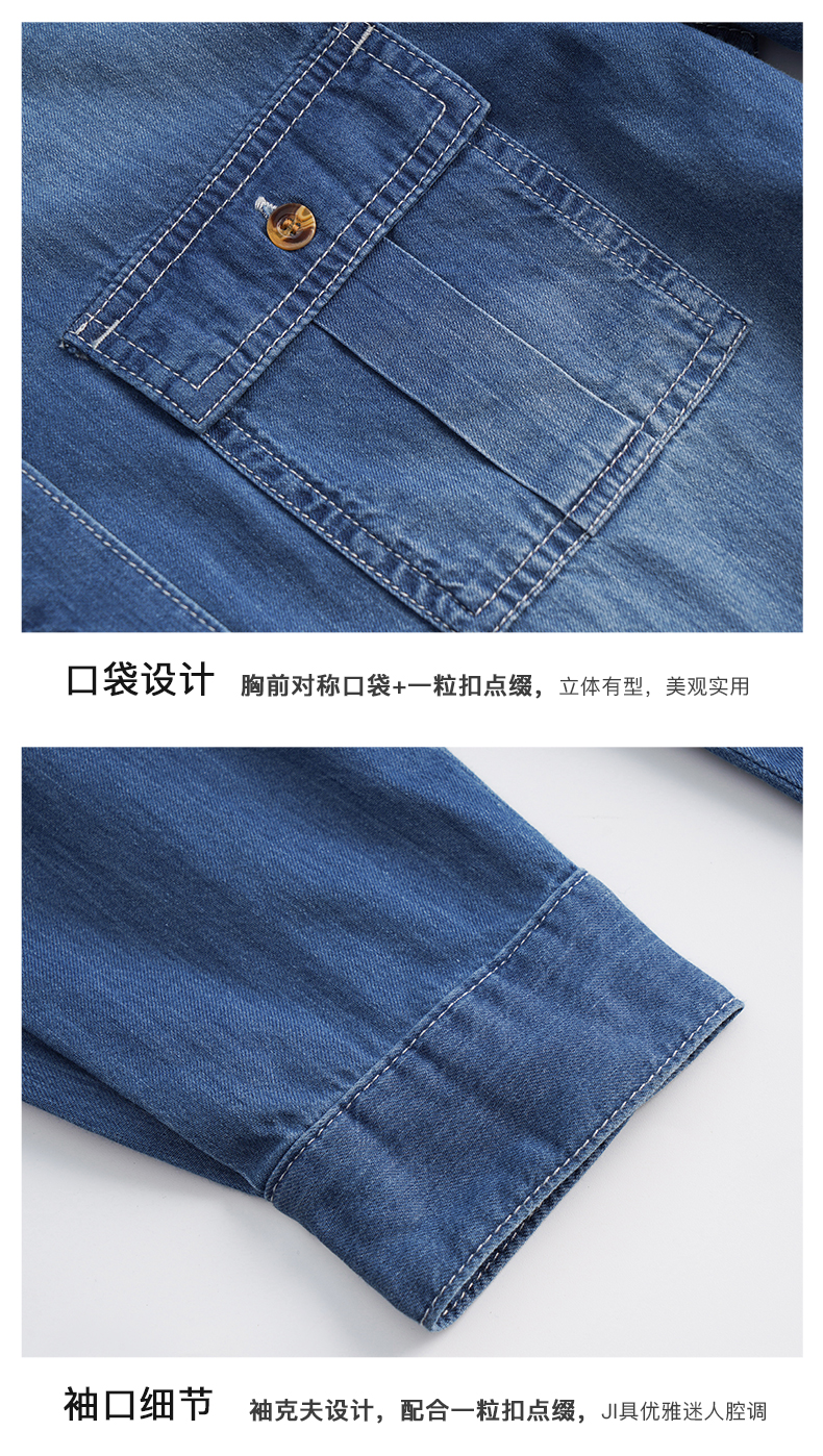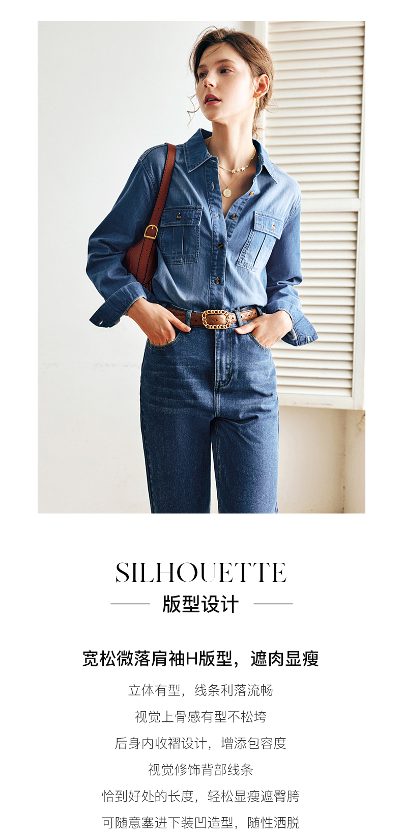OLrain法式蓝色牛仔衬衫女早秋2022年新款复古宽松气质翻领衬衣