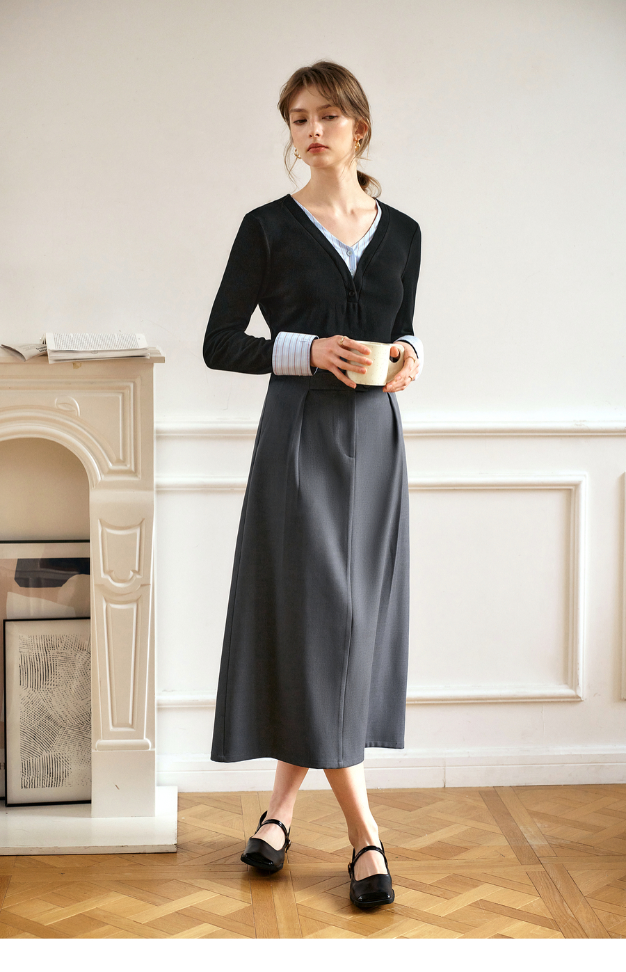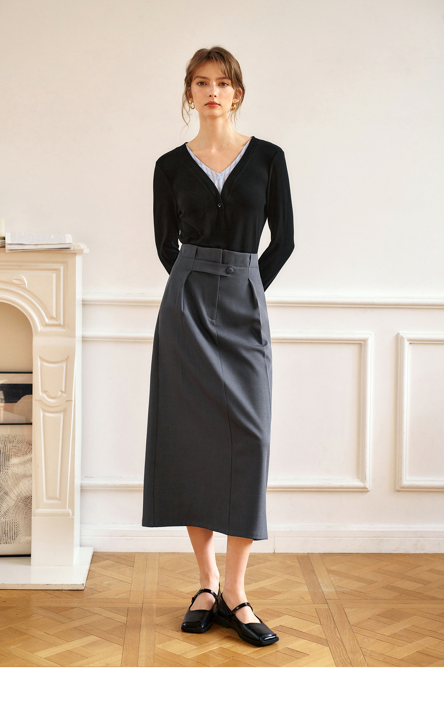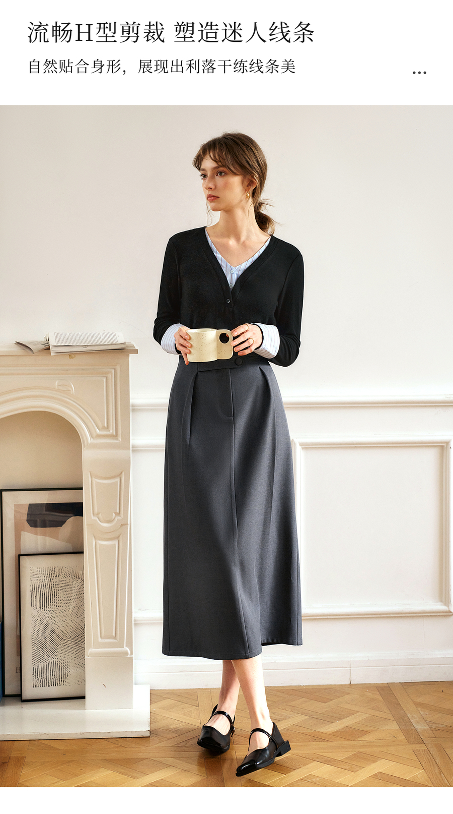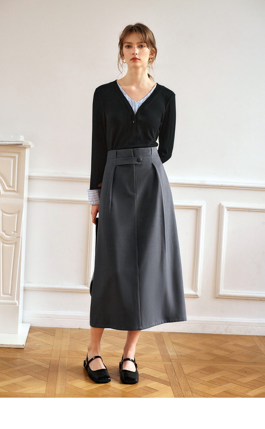 OLrain欧芮儿灰色高腰半身裙女春季2025年新款通勤压褶高级感半裙