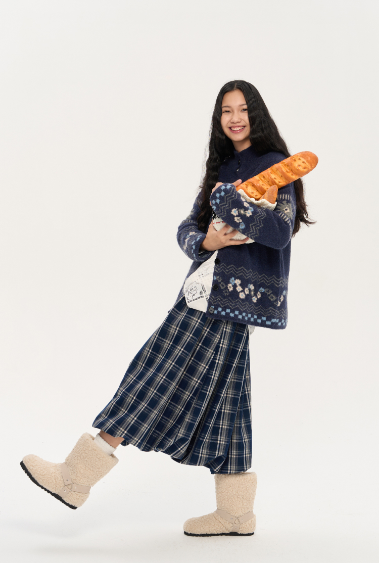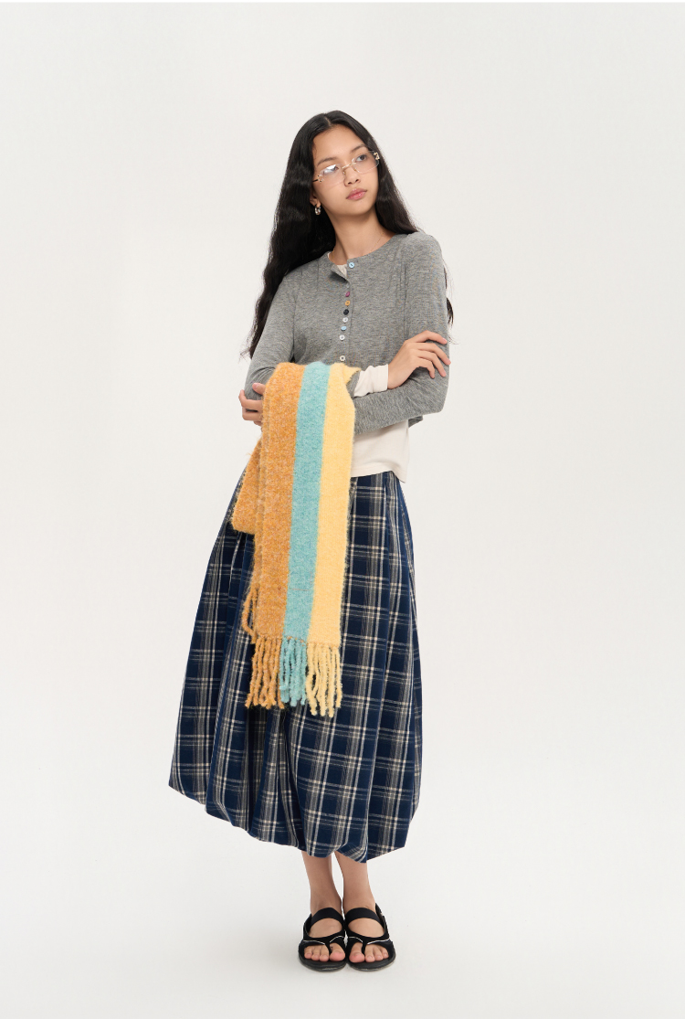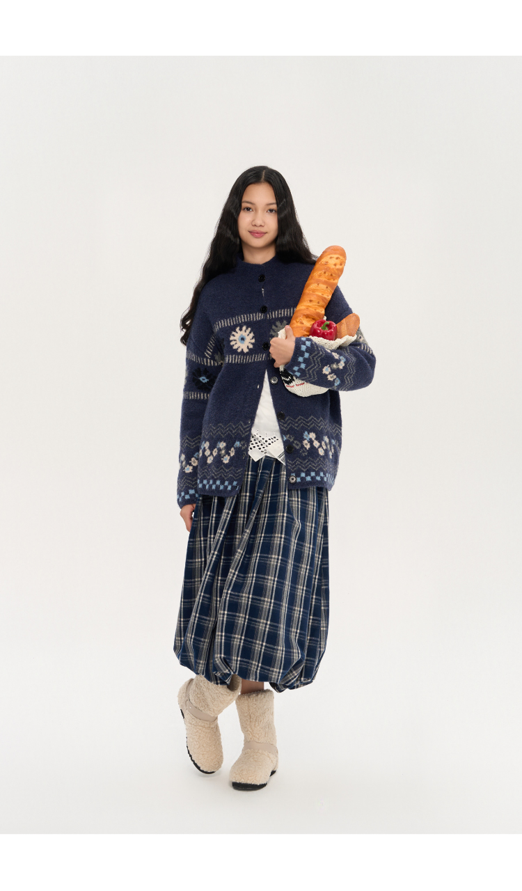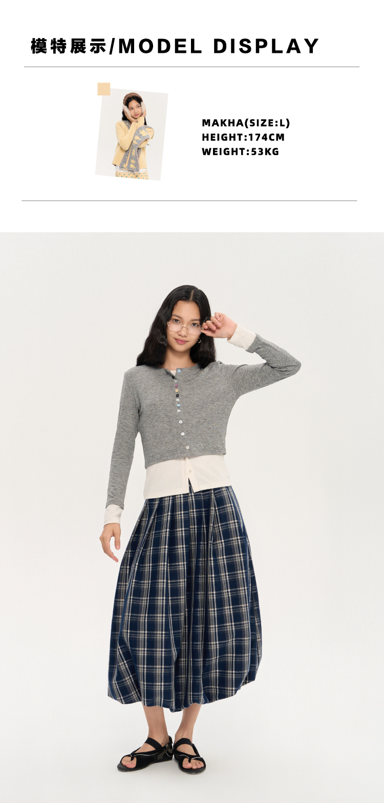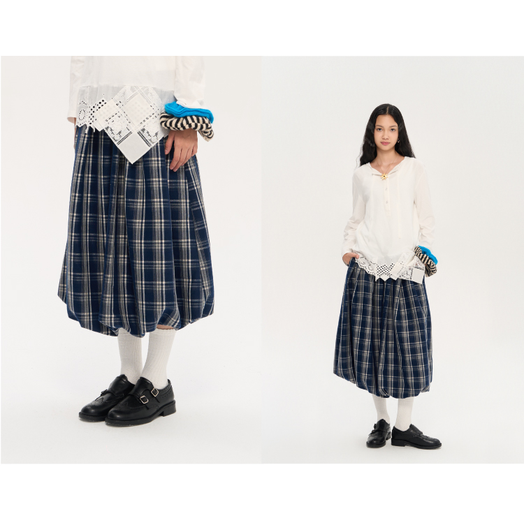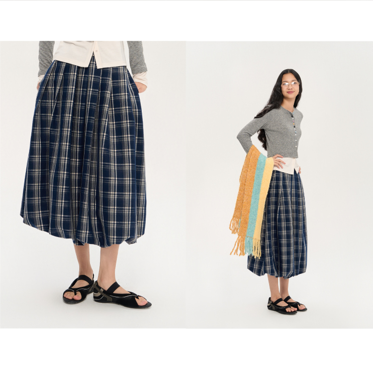 heris/H53121/预科学院藏蓝格纹 立体百褶花苞 气质A型长半身裙