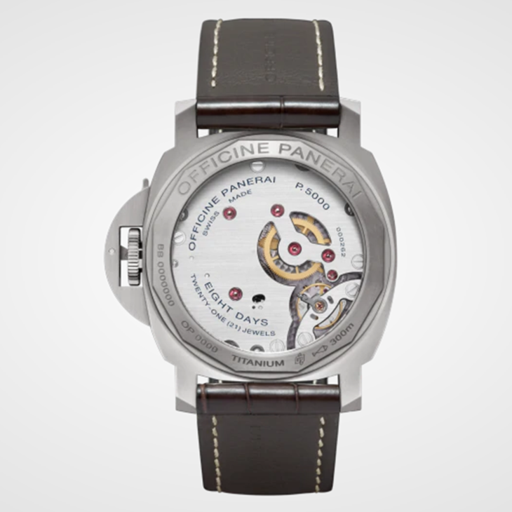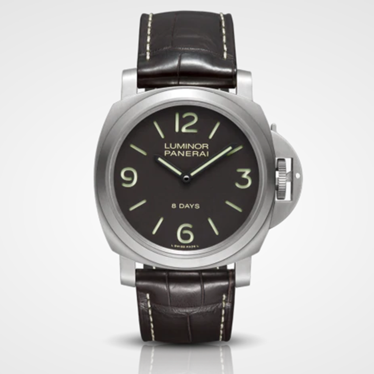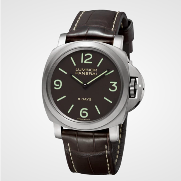 镜面材质 | 蓝宝石水晶玻璃 | 表盘 | 磨砂钛金属表壳 棕色表盘 阿拉伯数字夜光时标 指针 8日动力储存 表冠护桥,磨砂钛金属(沛纳海专利) 透底 |