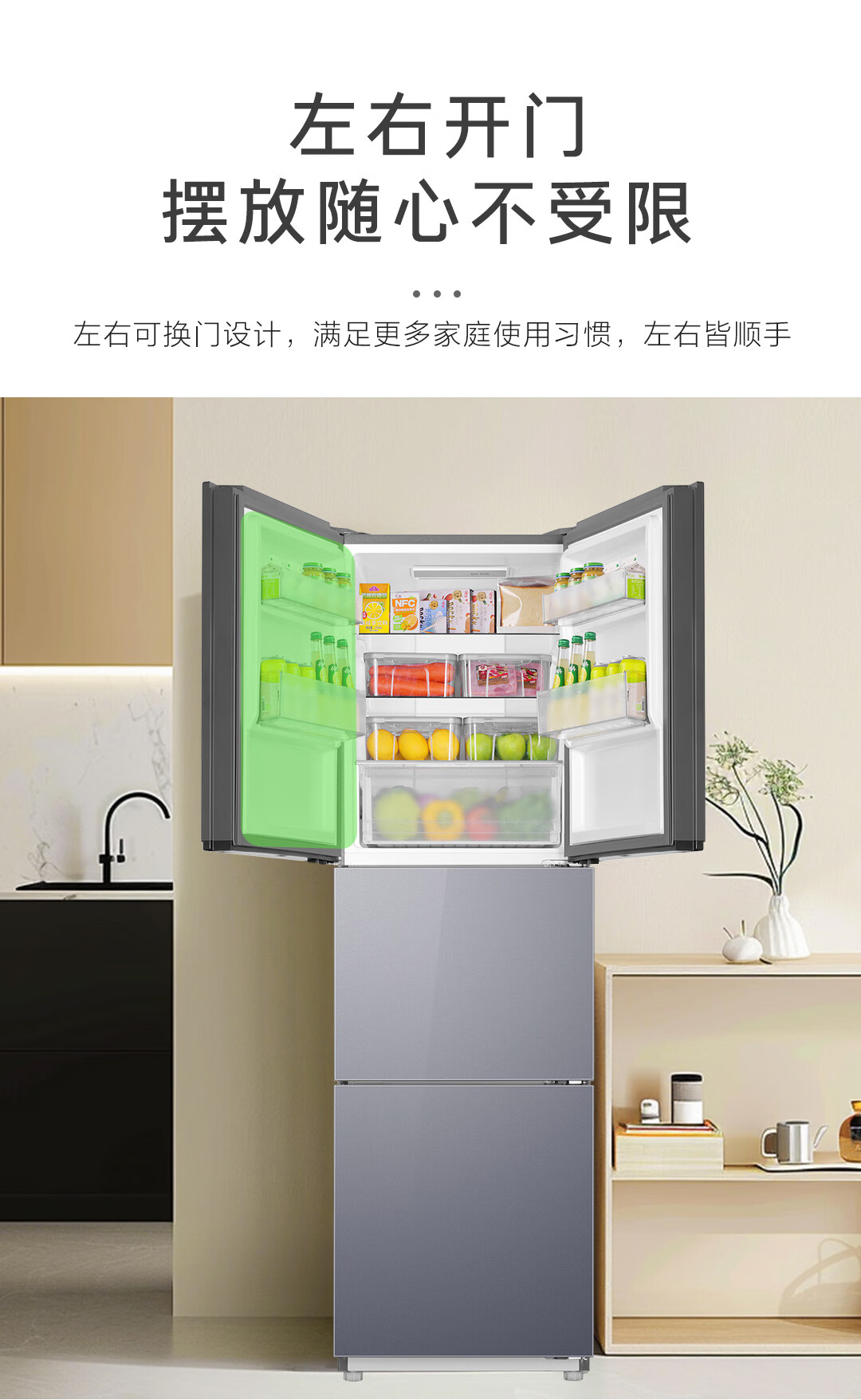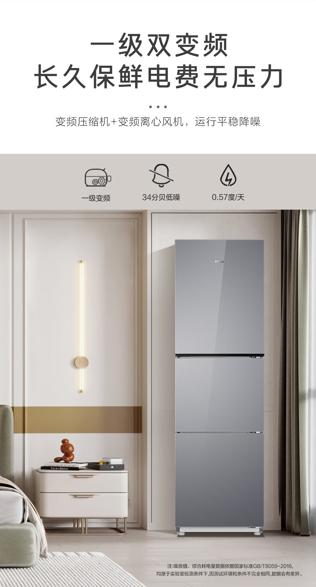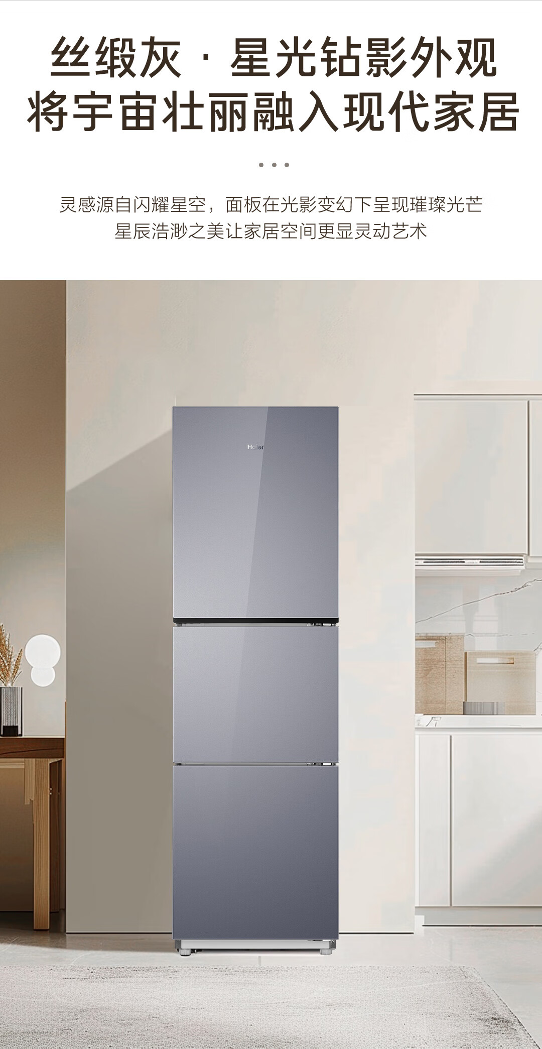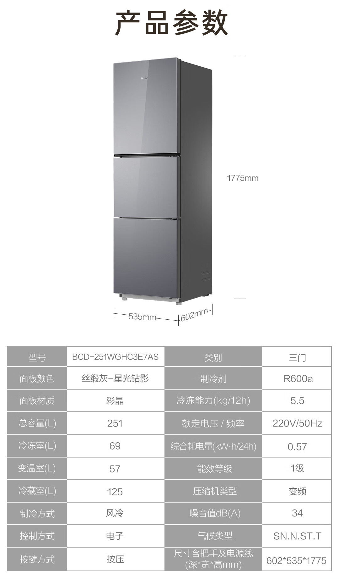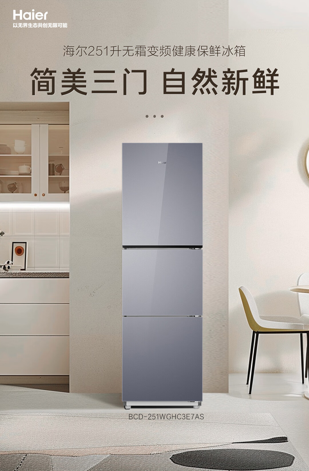新品上市海尔冰箱251升三开门风冷无霜一级能效双变频三档变温节能安静三门彩晶电冰箱 风冷不结霜丨一级双变频丨中门变温区丨彩晶玻璃面板BCD-251WGHC3E7AS