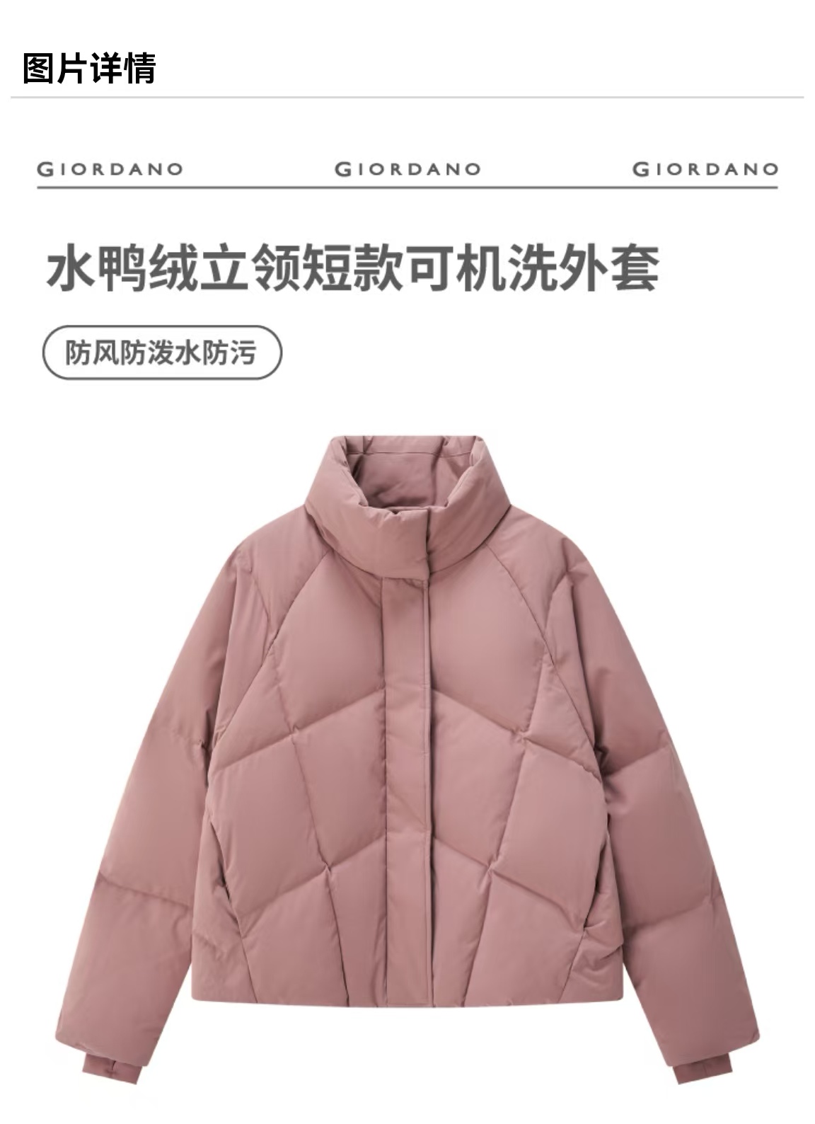 佐丹奴女装25年防风防泼水防污可机洗立领短款鸭绒外套05375621