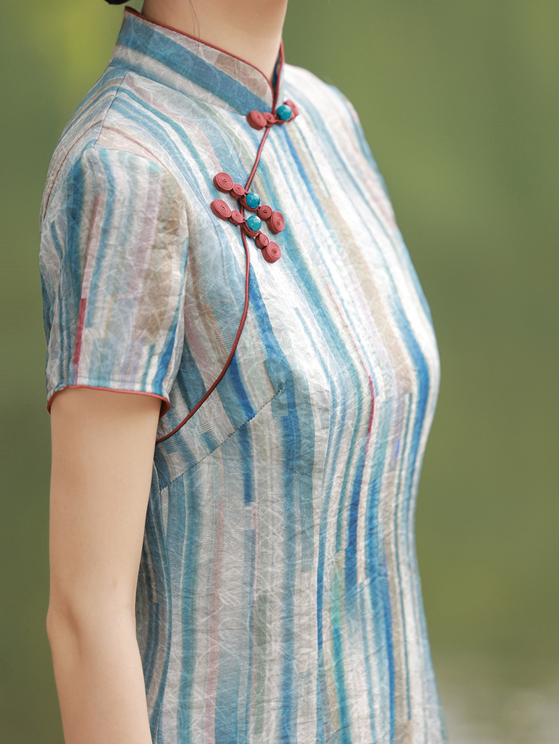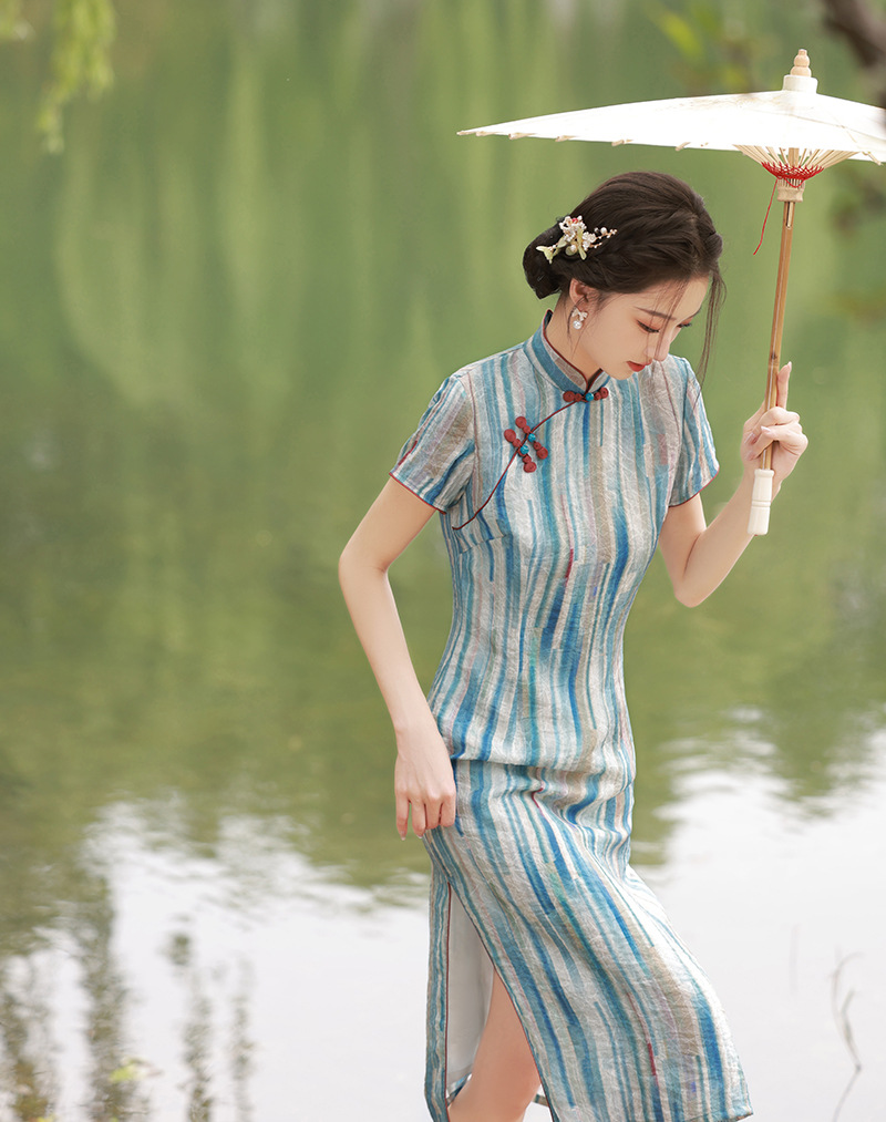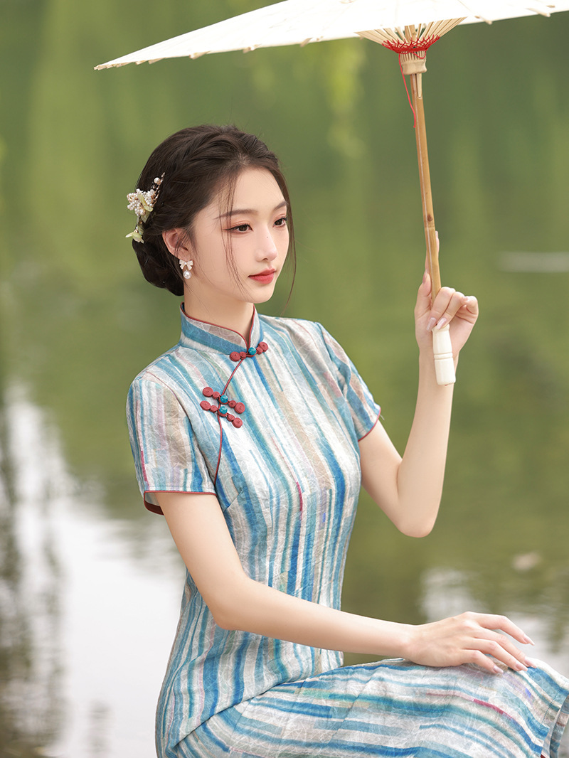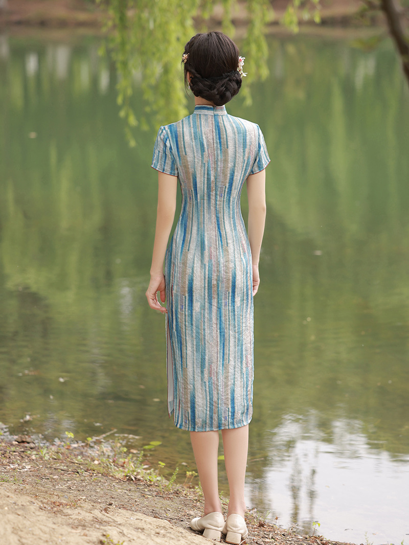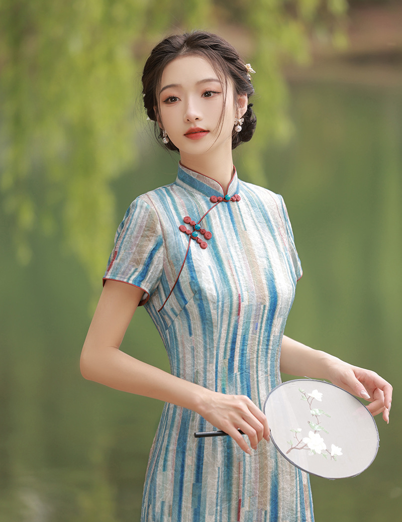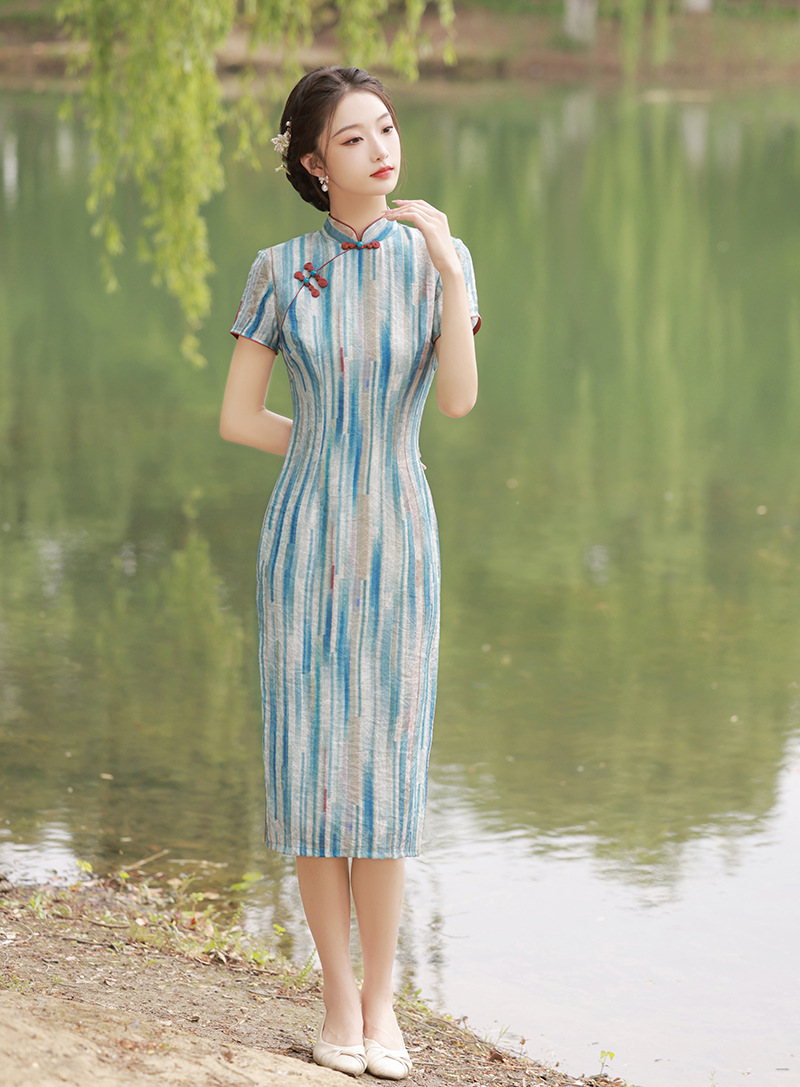 轻薄冰丝感复古中国风,中长款修身旗袍连衣裙XL-23211