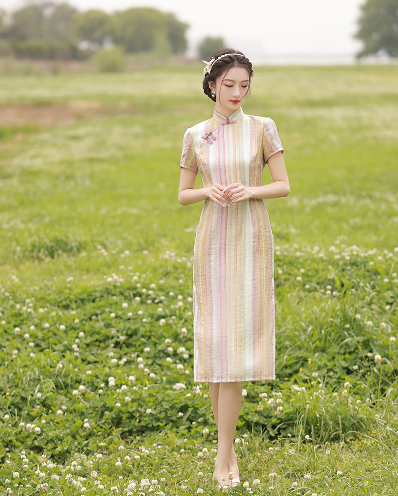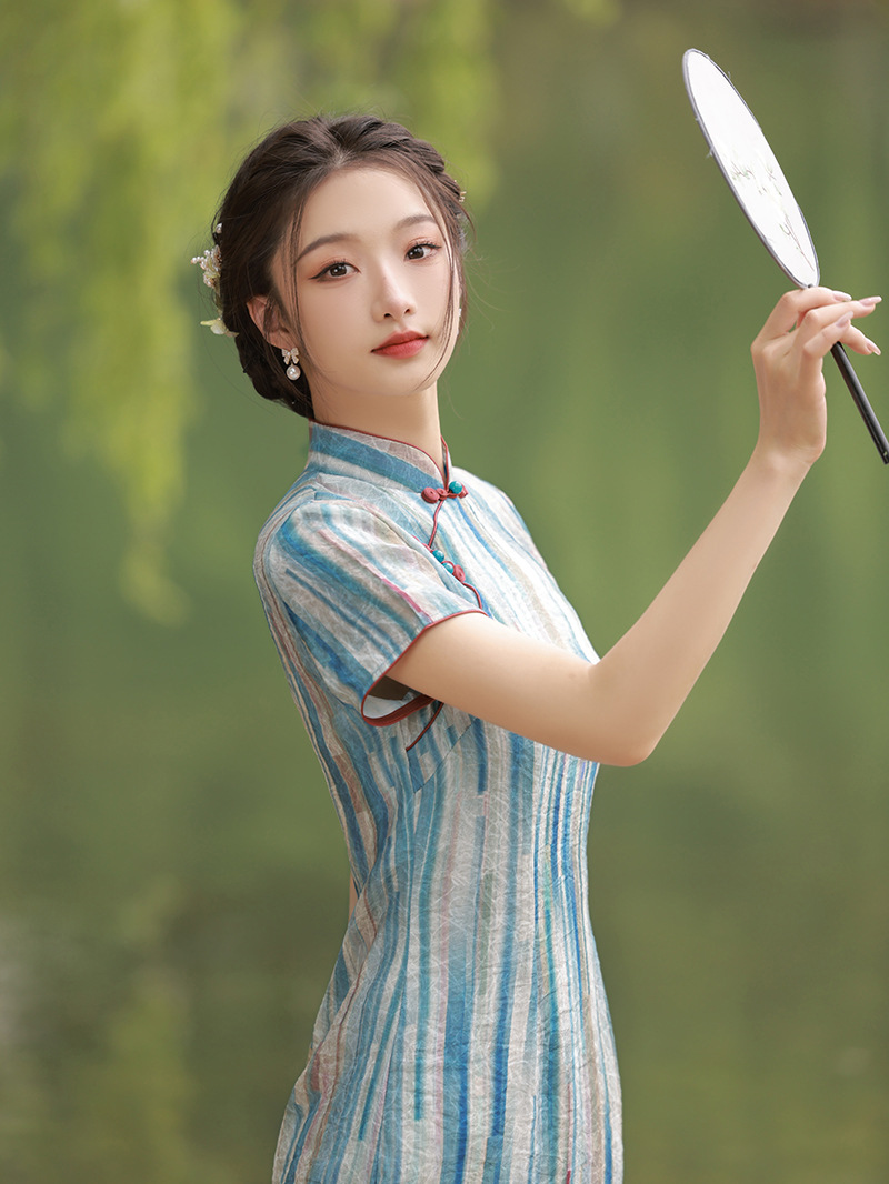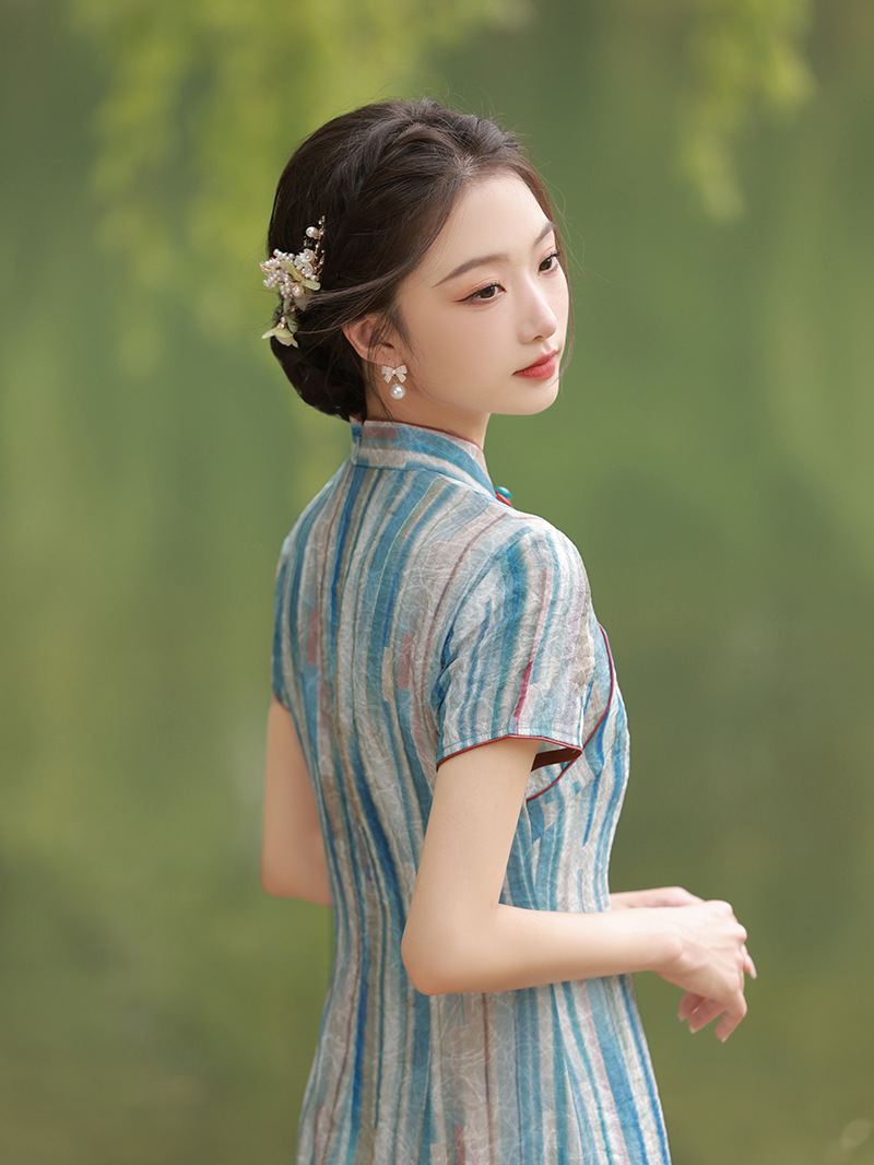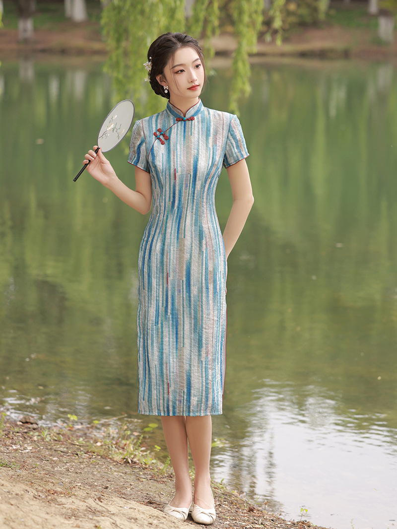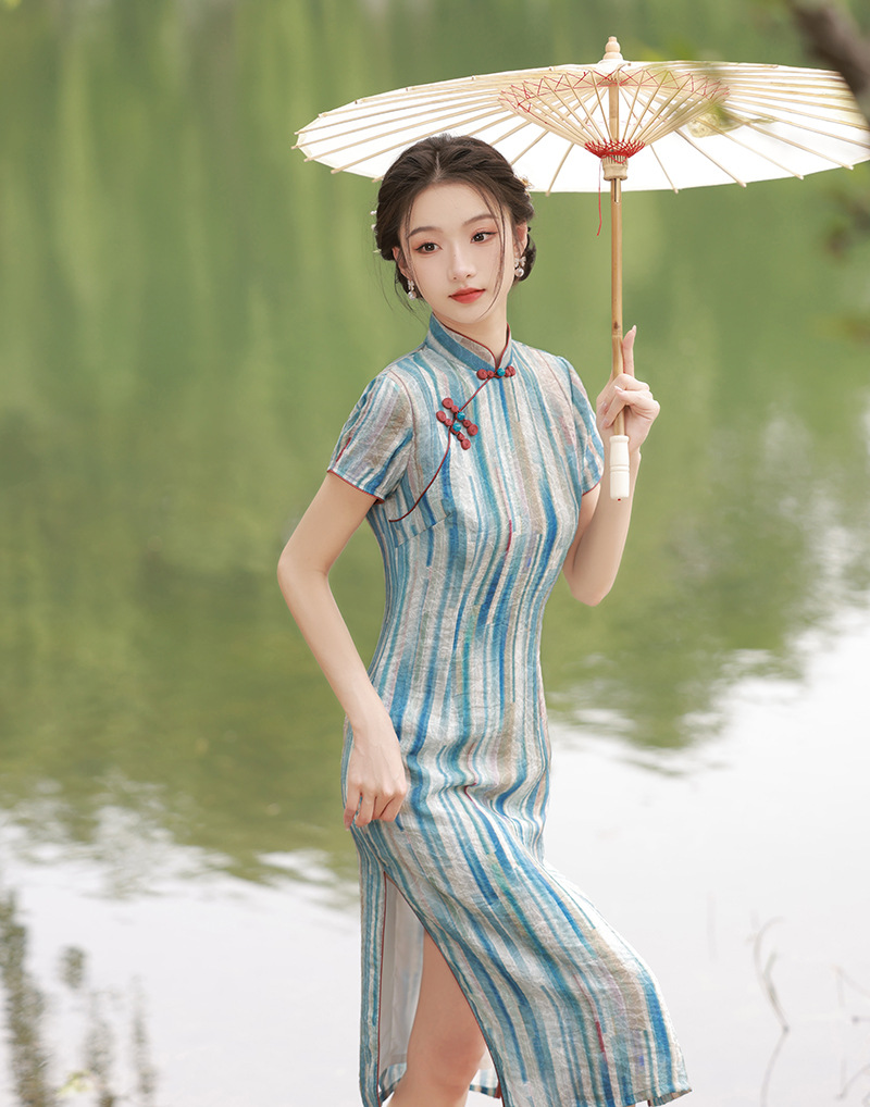 轻薄冰丝感复古中国风,中长款修身旗袍连衣裙XL-23211