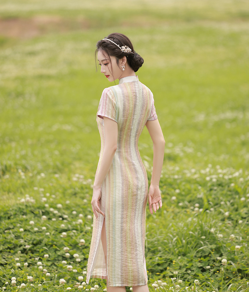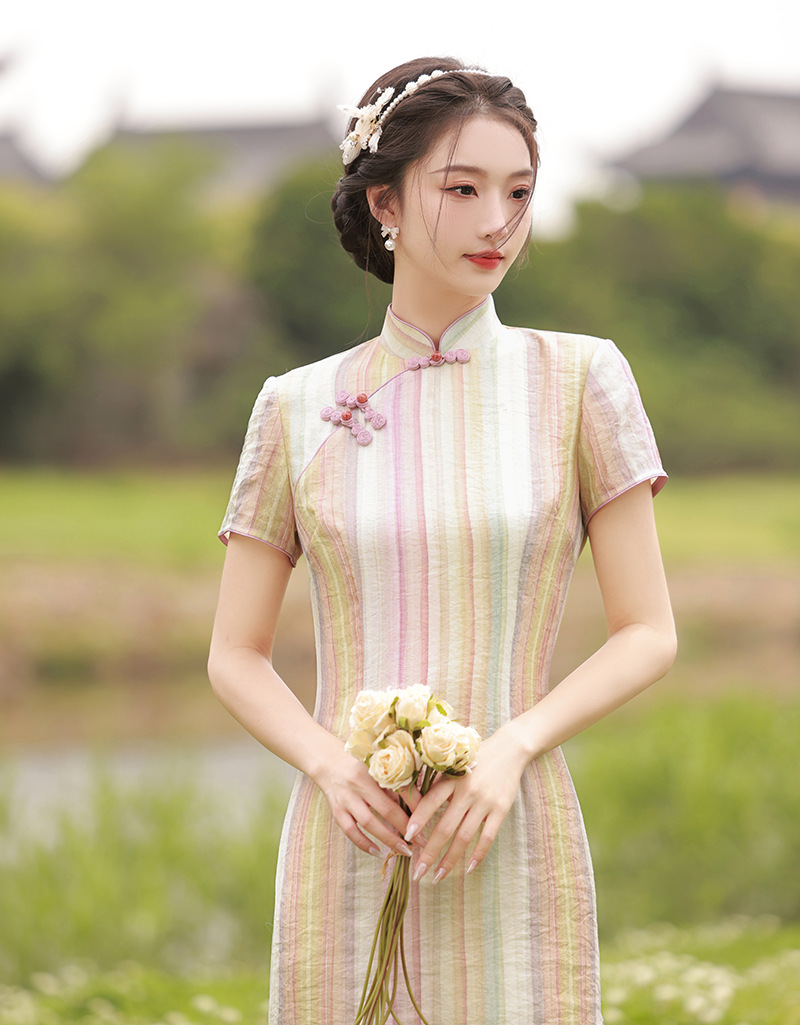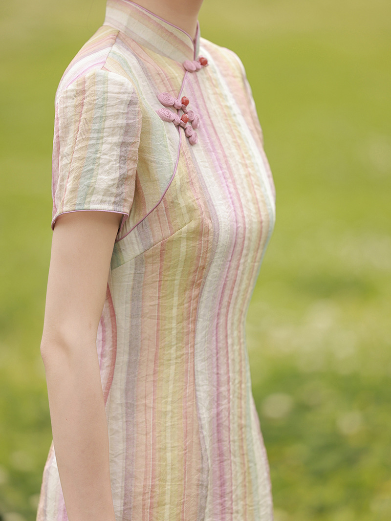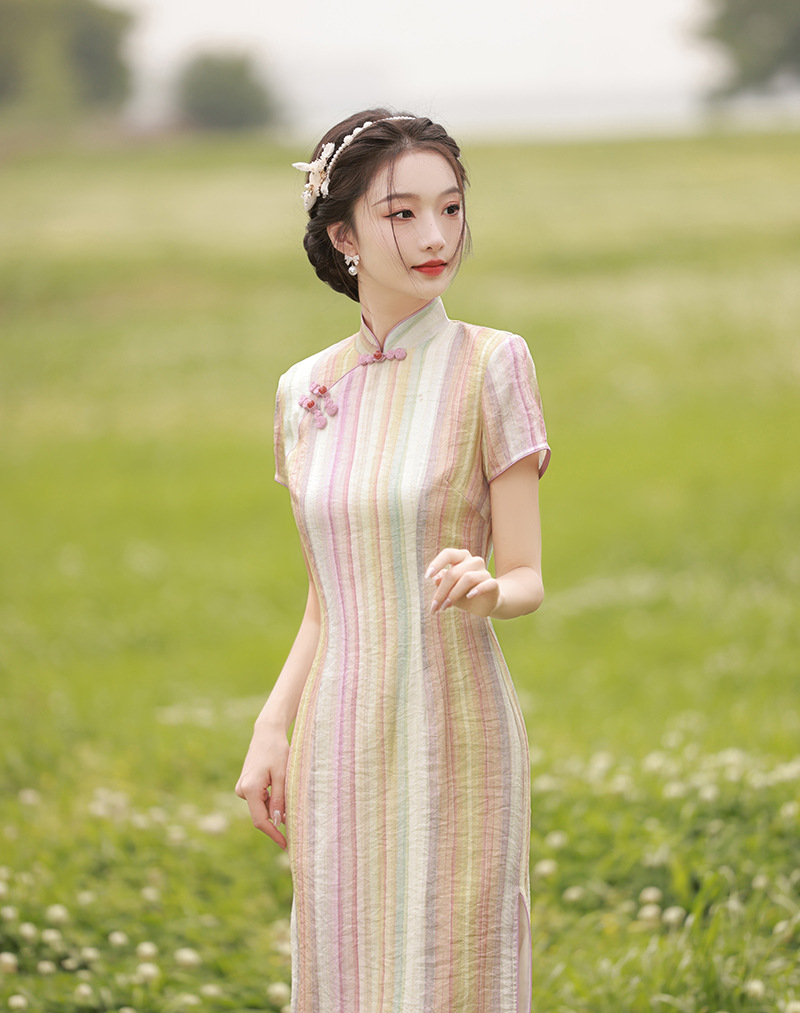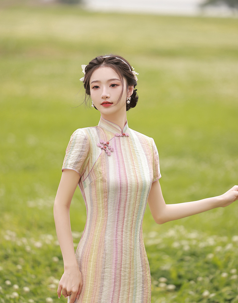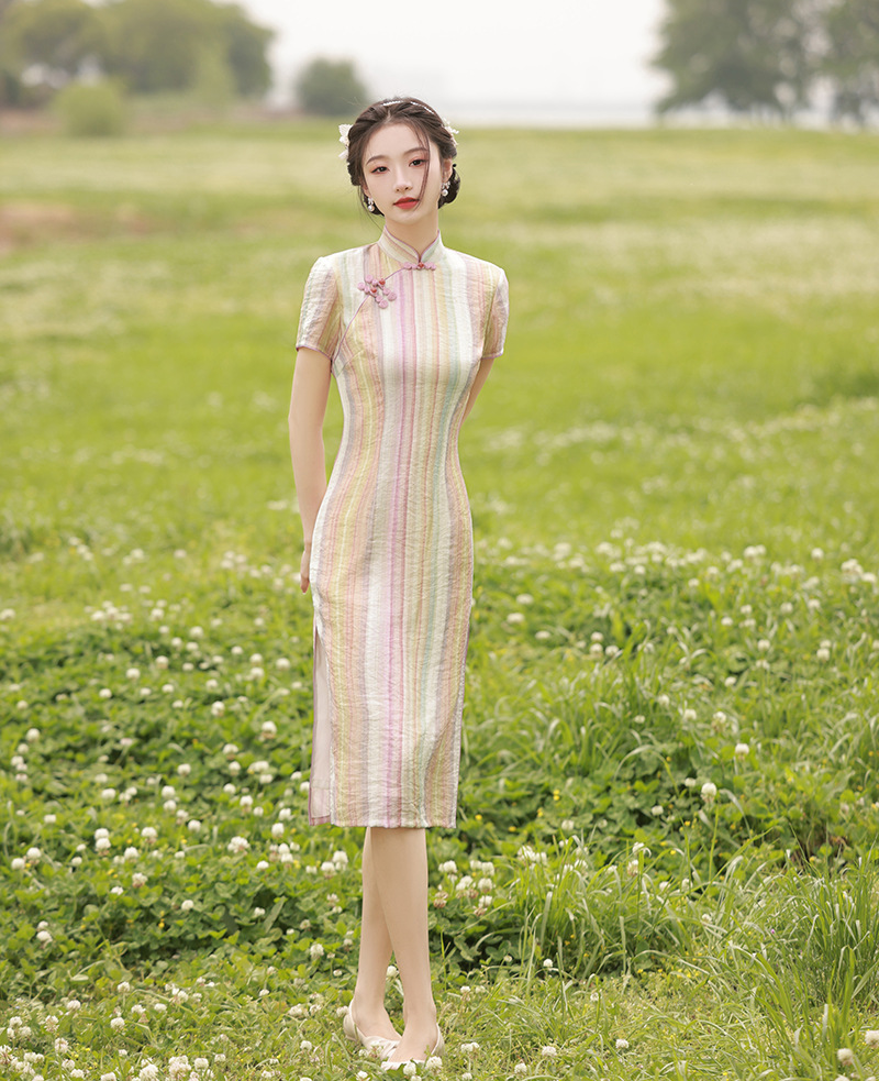 轻薄冰丝感复古中国风,中长款修身旗袍连衣裙XL-23211