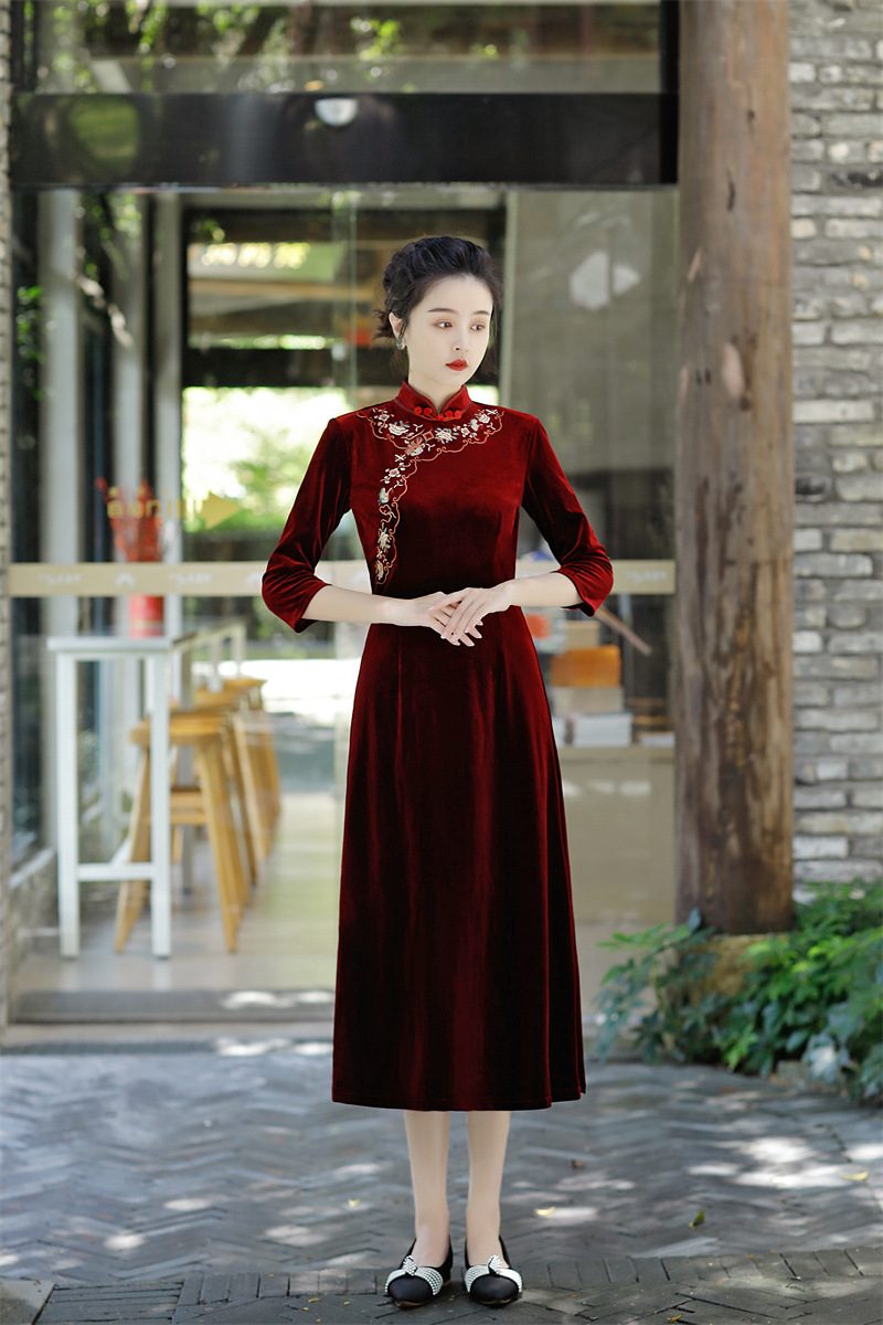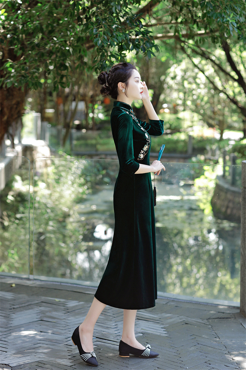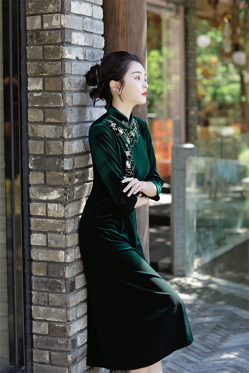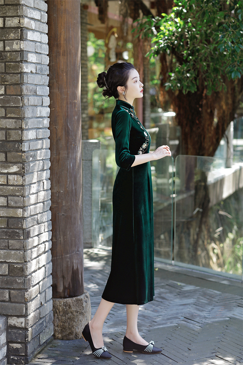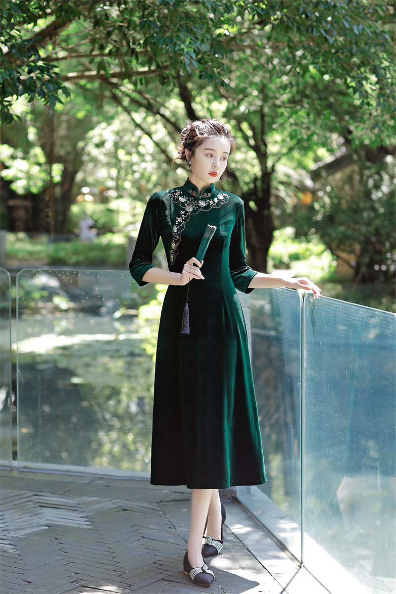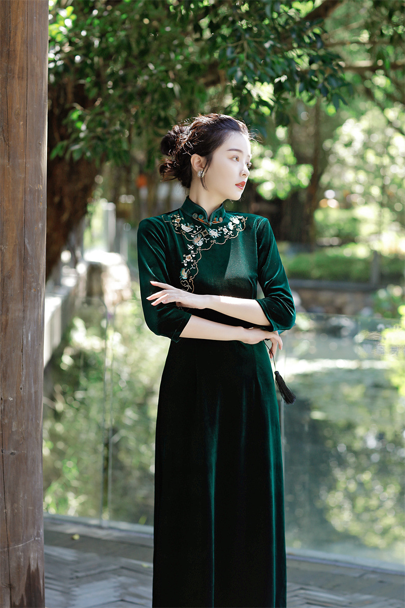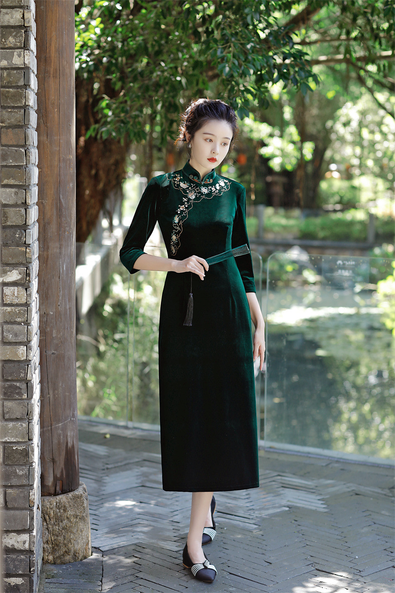 老上海丝绒绣花长款七分袖旗袍大摆裙GX22909