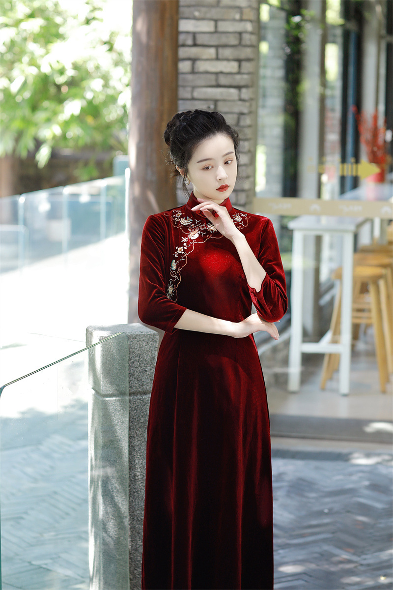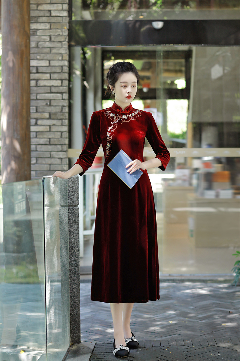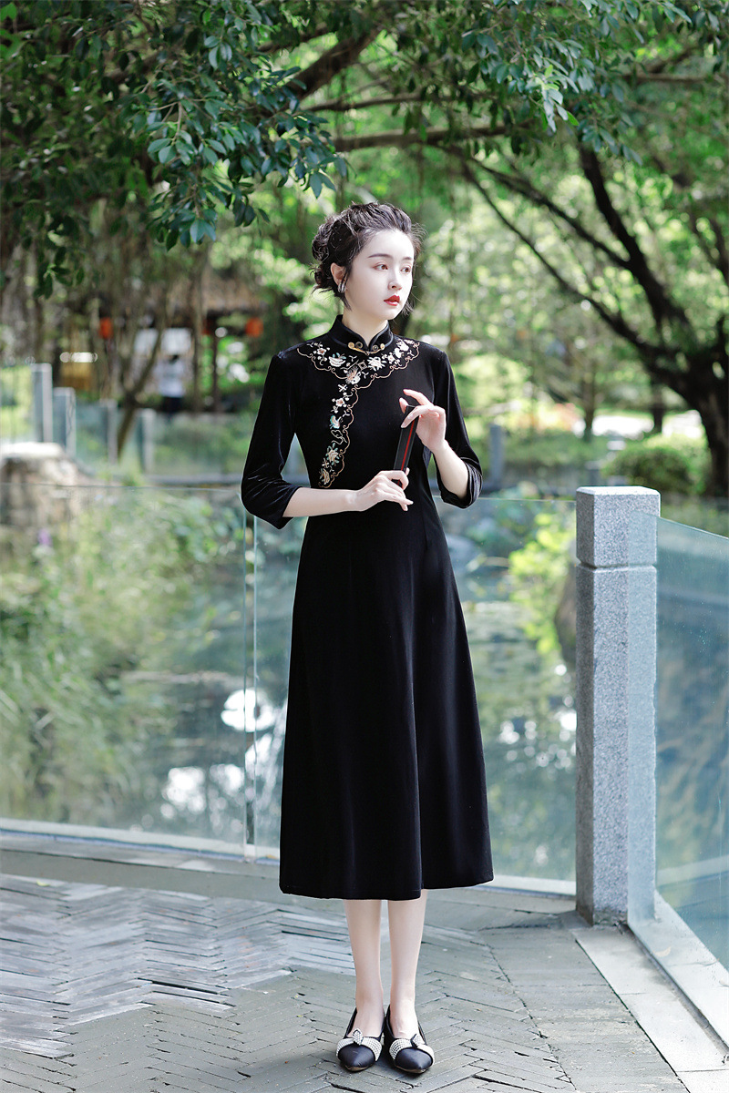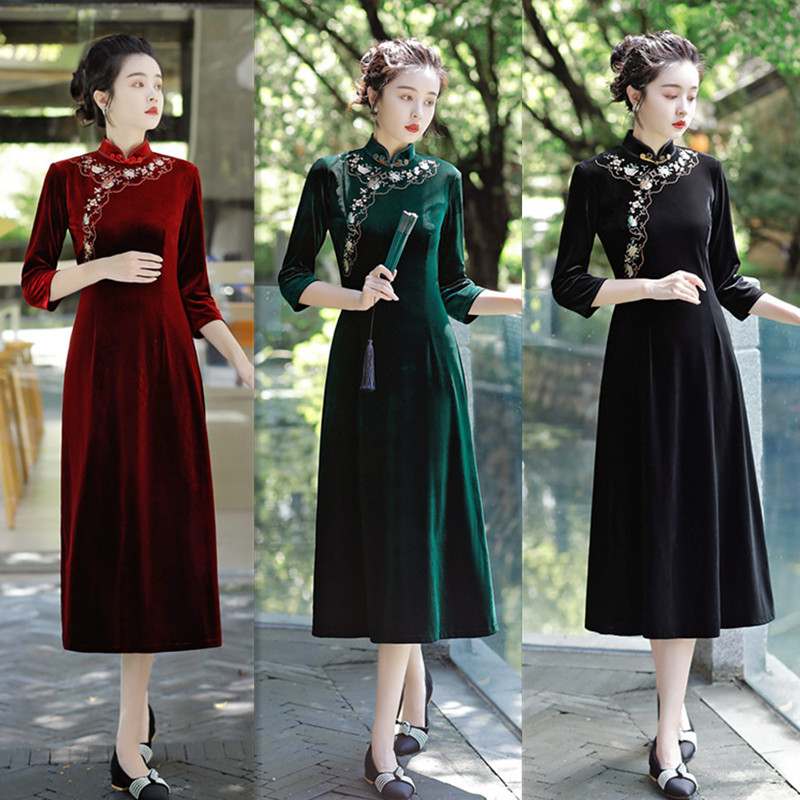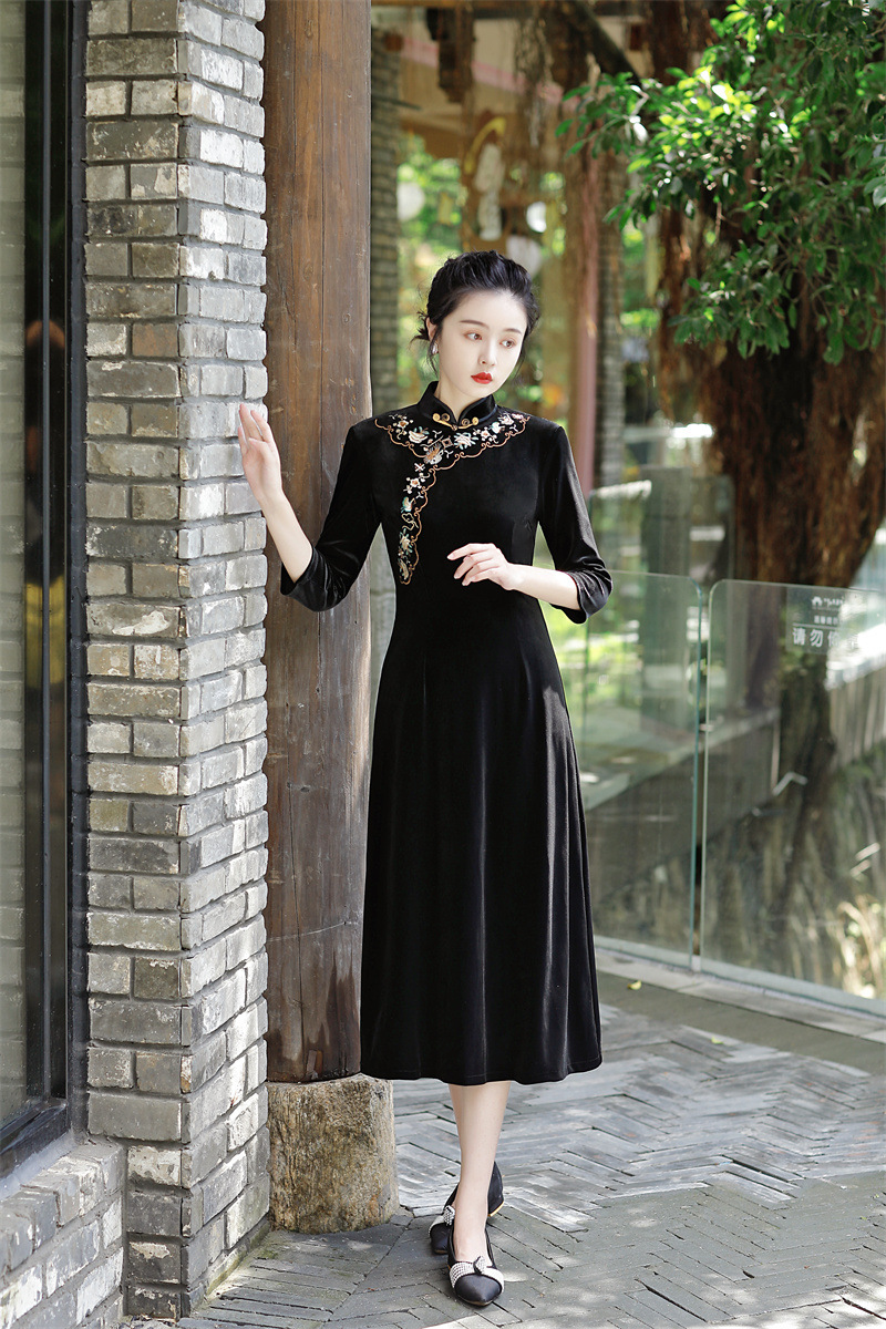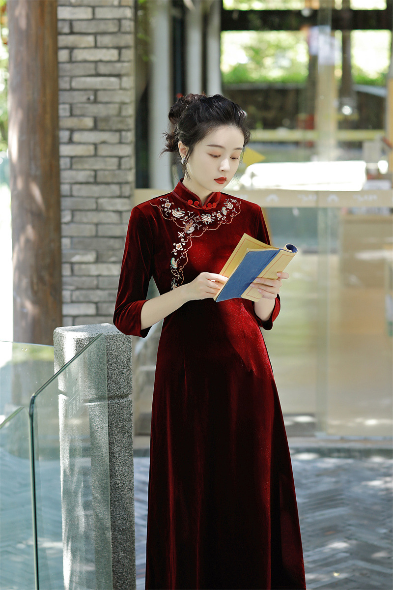 老上海丝绒绣花长款七分袖旗袍大摆裙GX22909