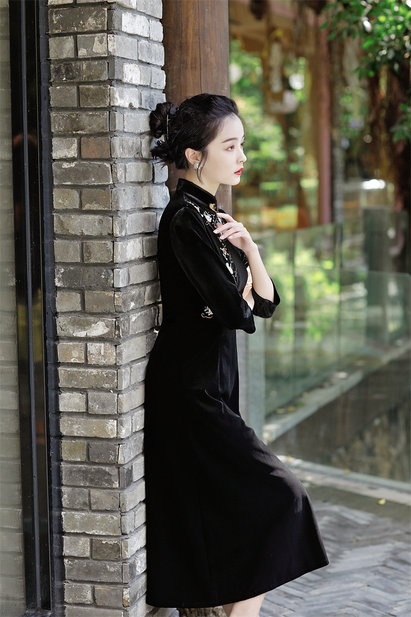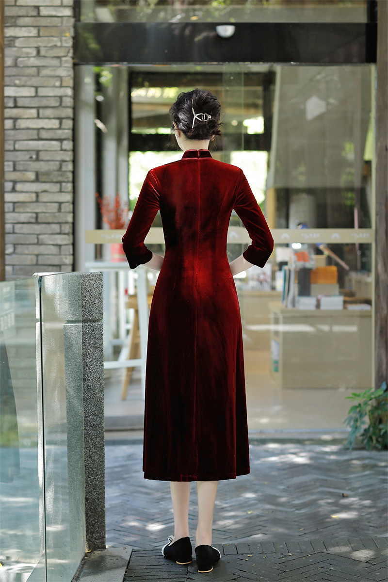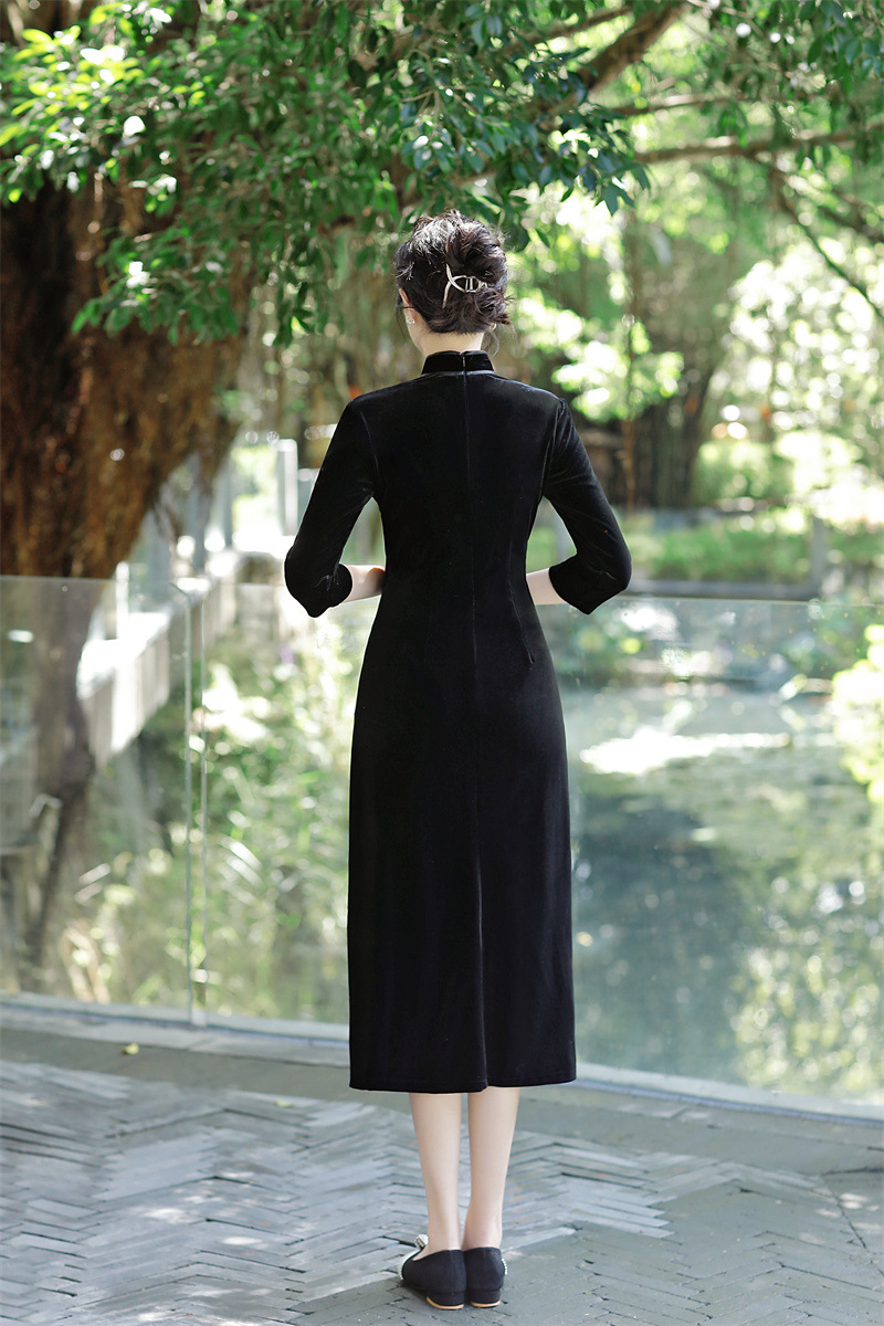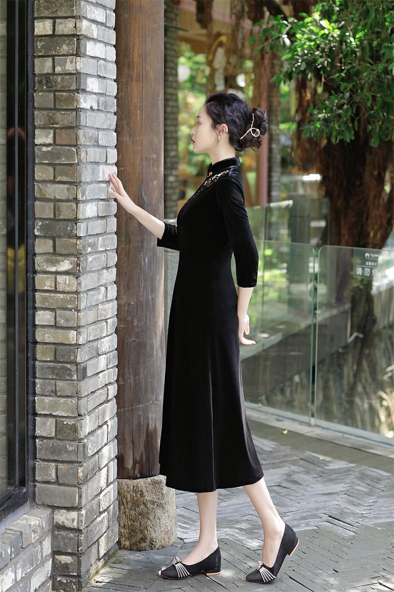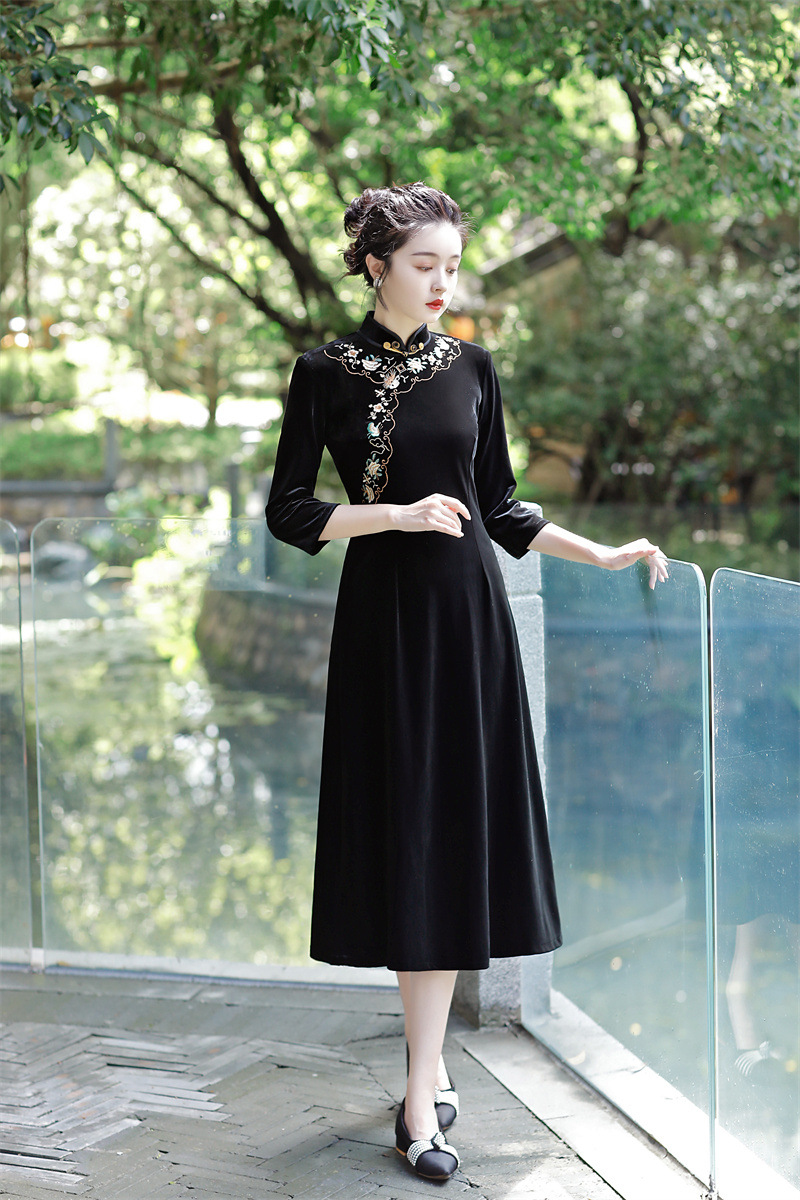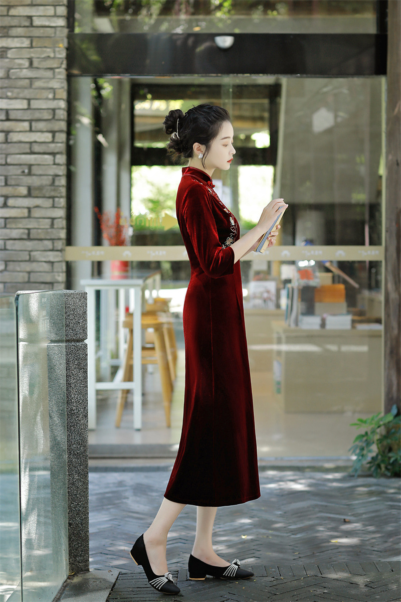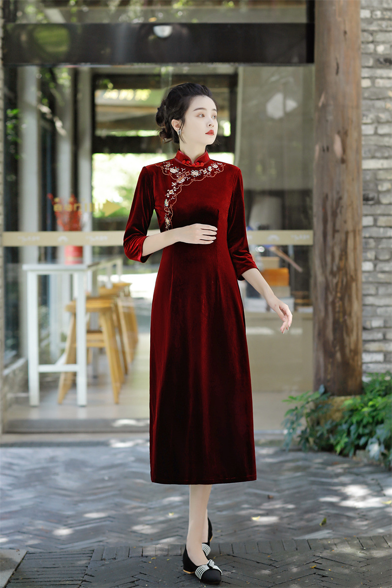 老上海丝绒绣花长款七分袖旗袍大摆裙GX22909