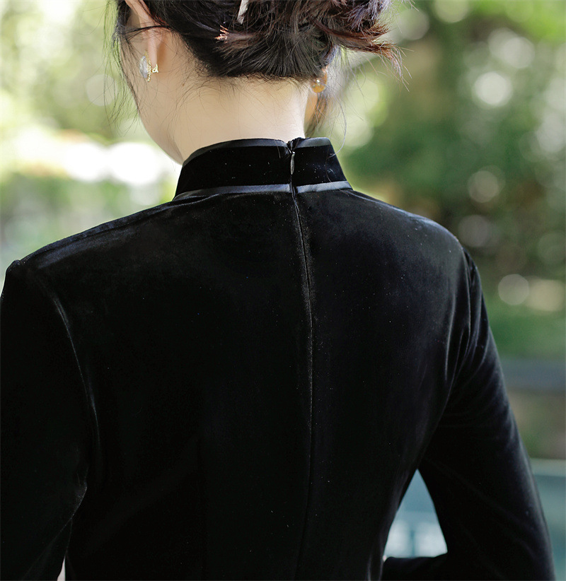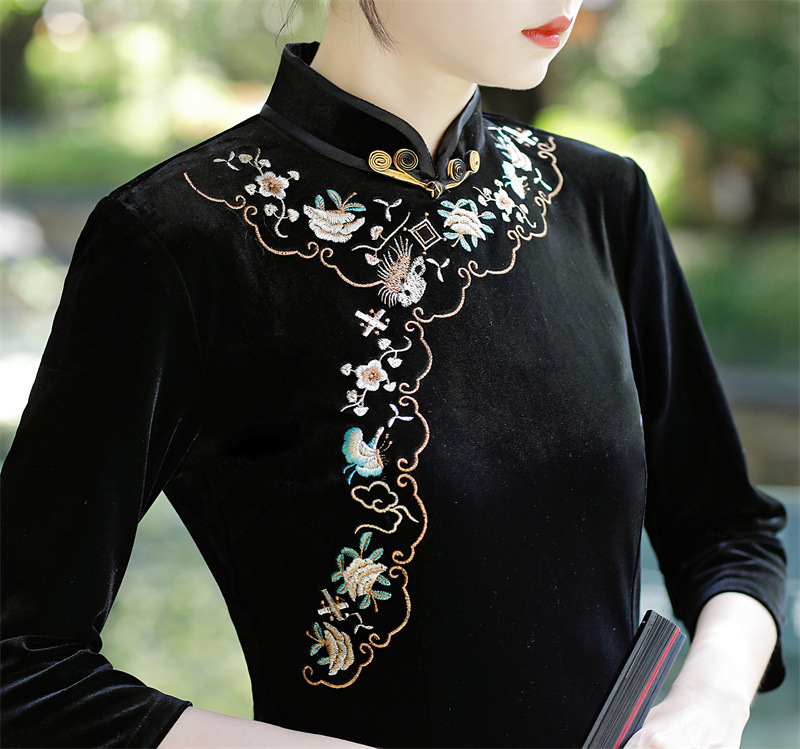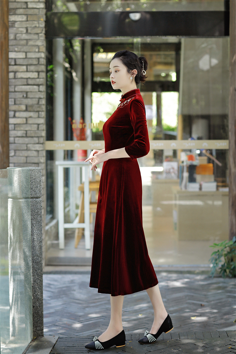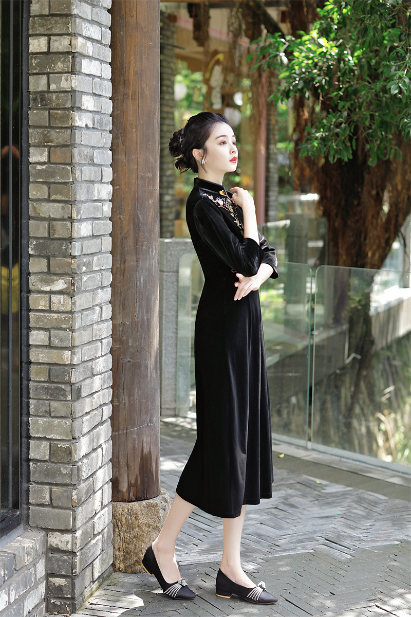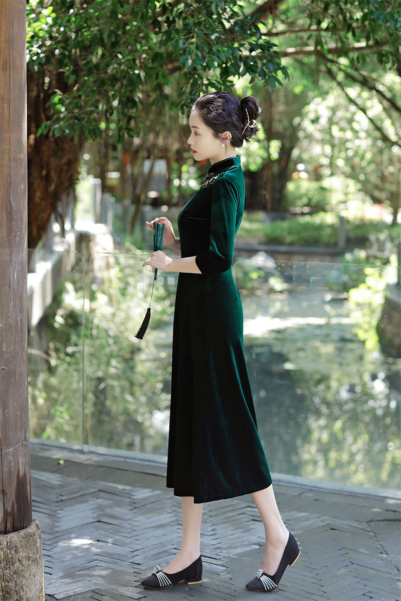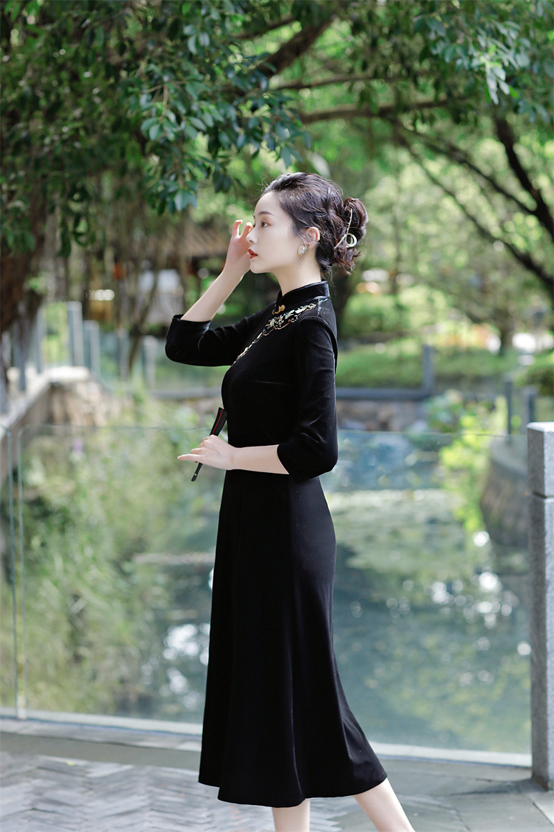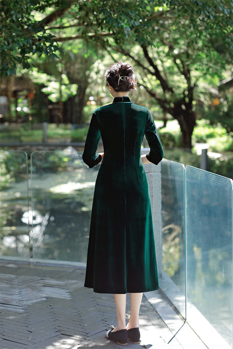老上海丝绒绣花长款七分袖旗袍大摆裙GX22909