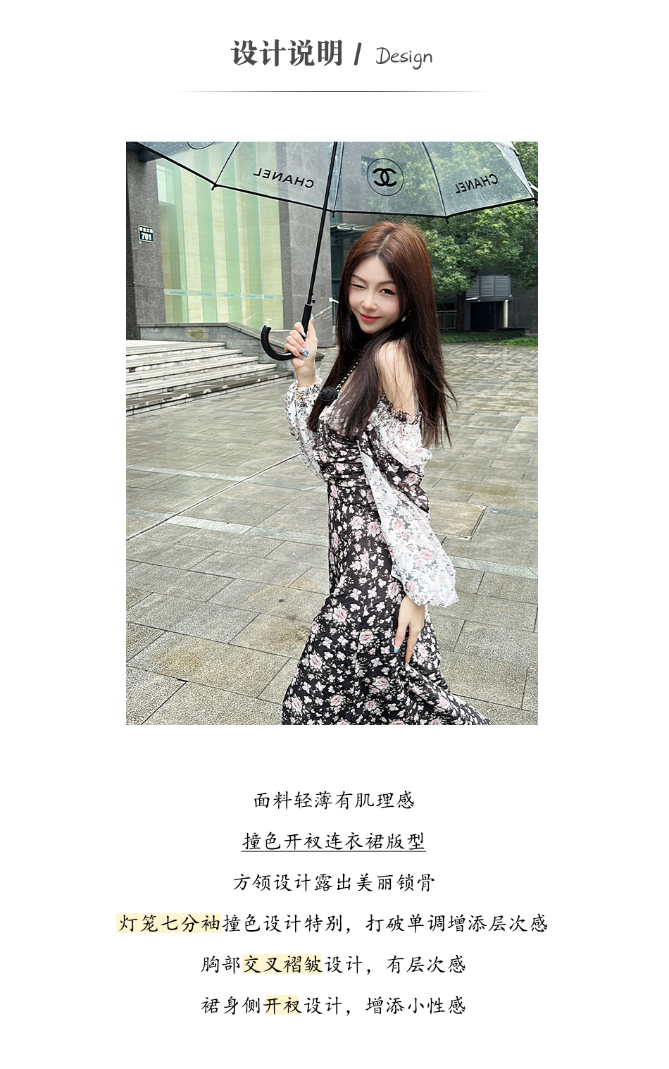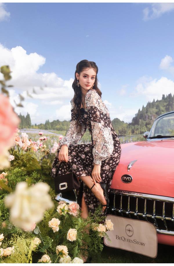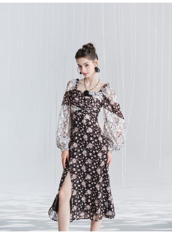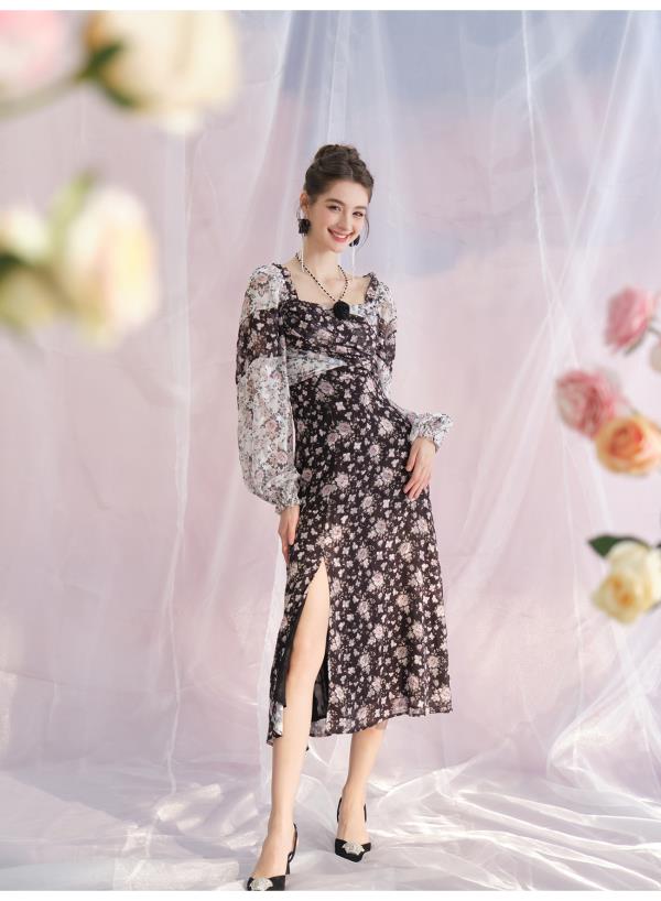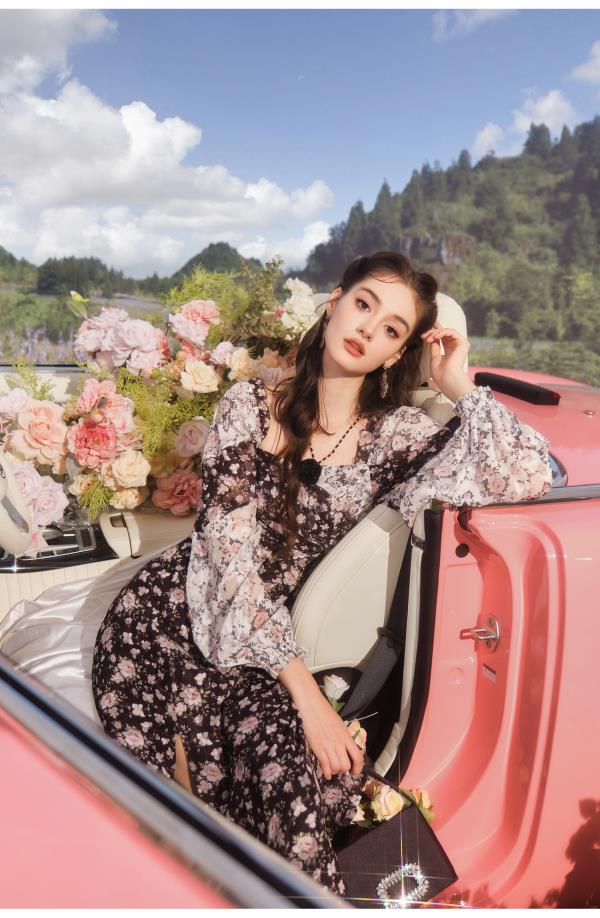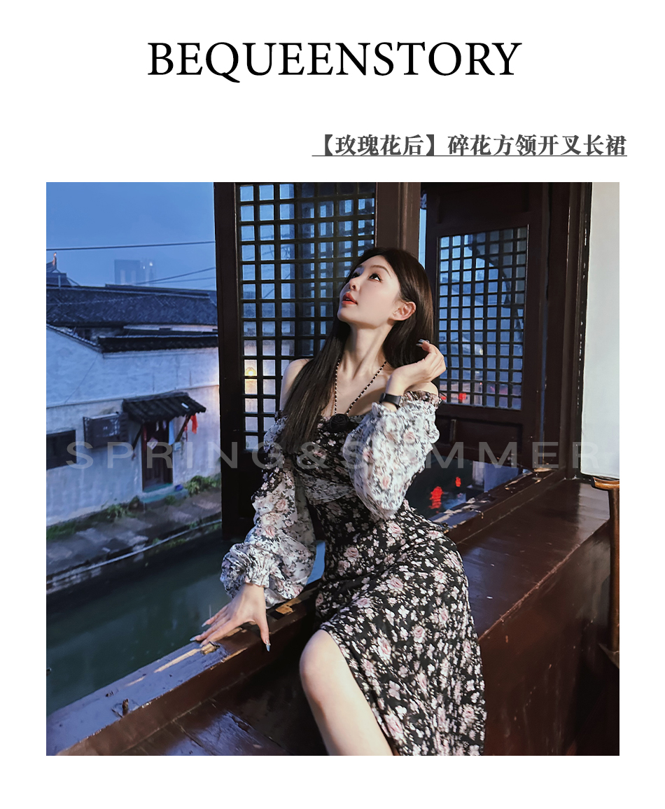 【孤品样衣,不退不换】【玫瑰花后】气质复古碎花方领开叉连衣裙新款夏