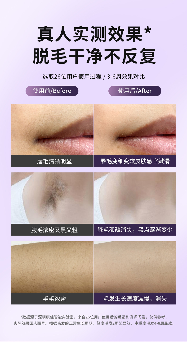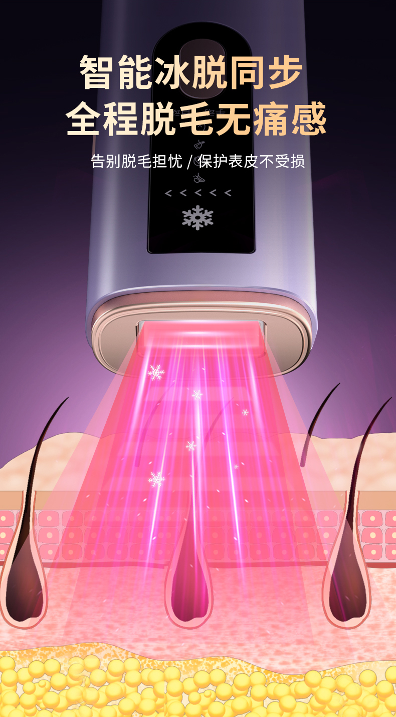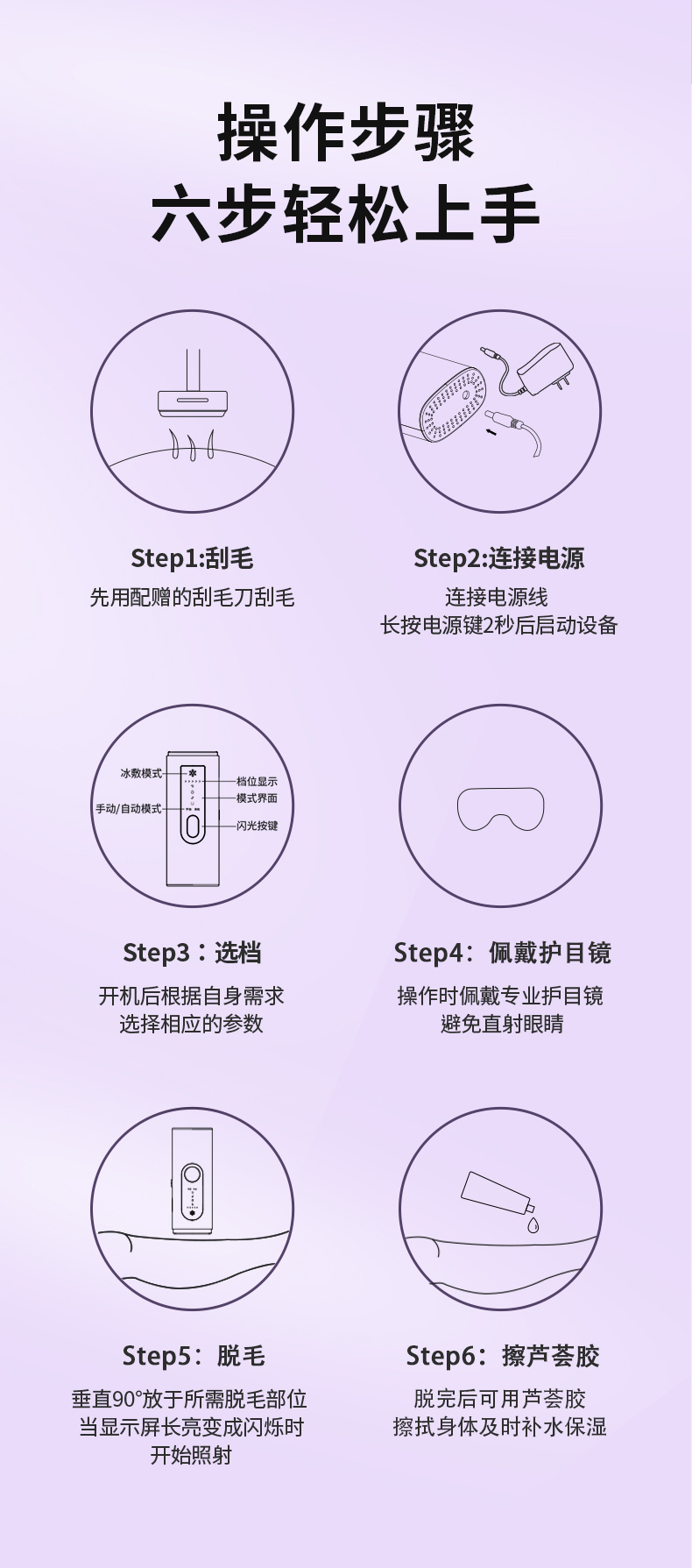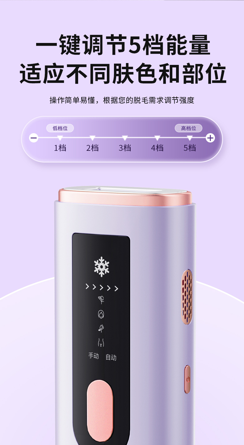 5档调节:多种模式多档调节,根据自身皮肤定制适合自己的模式档位,让脱毛更轻松快速;