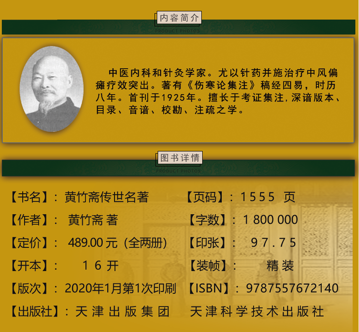 黄竹斋(1886-1960年),中医内科和针灸学家。自学成才,学识渊博。黄竹斋擅长于考证集注,深谙版本、目录、音谙、校勘、注疏之学。做学问非常认真,著作《伤寒论集注》曾“稿经四易,时历八年”,首刊于1925年。