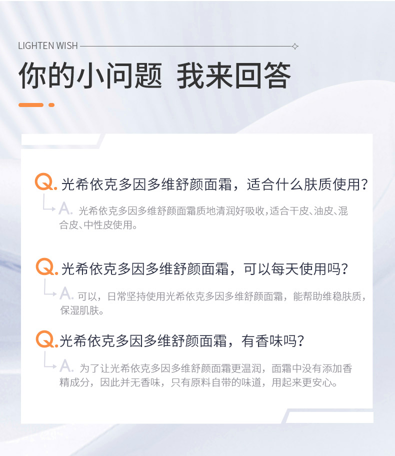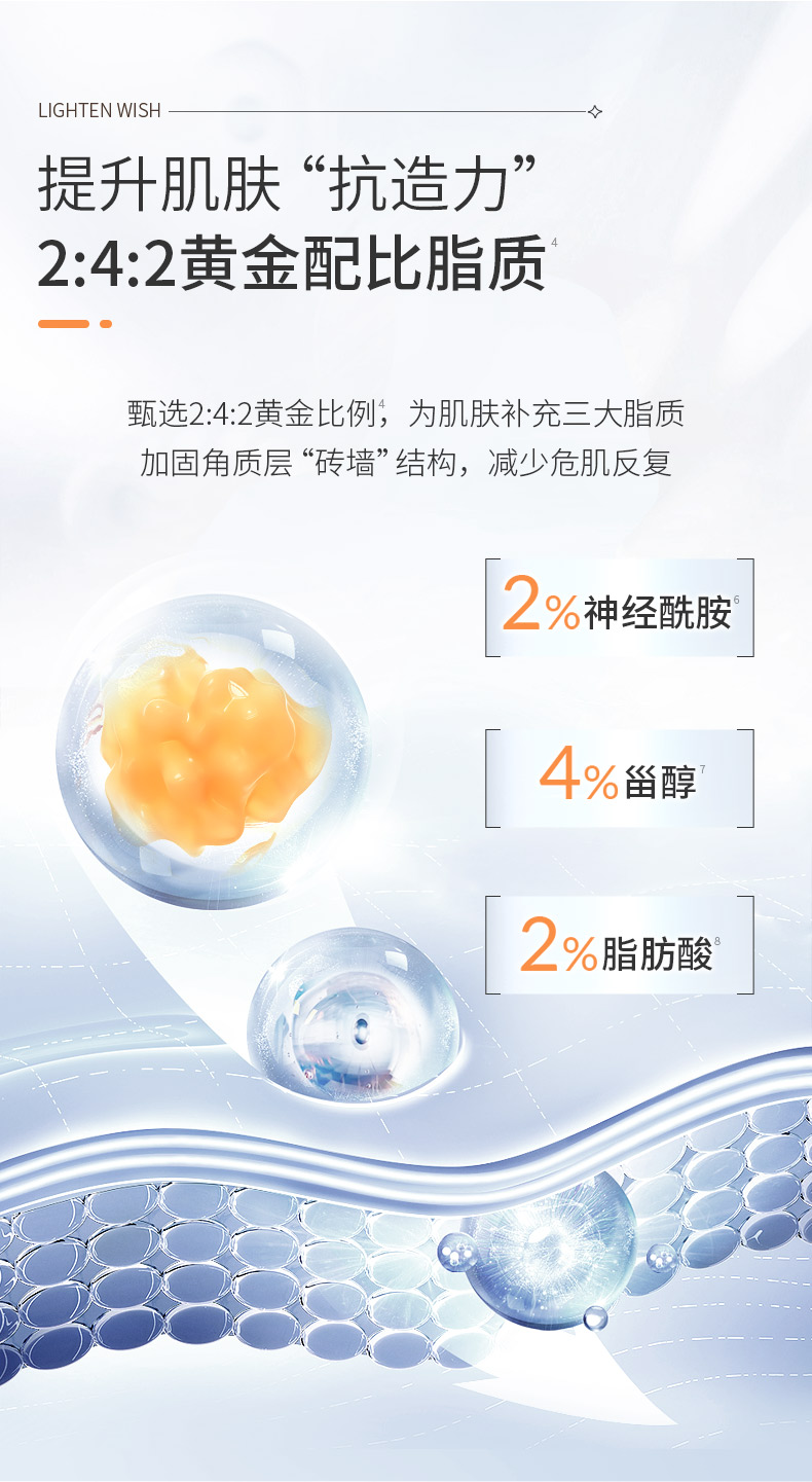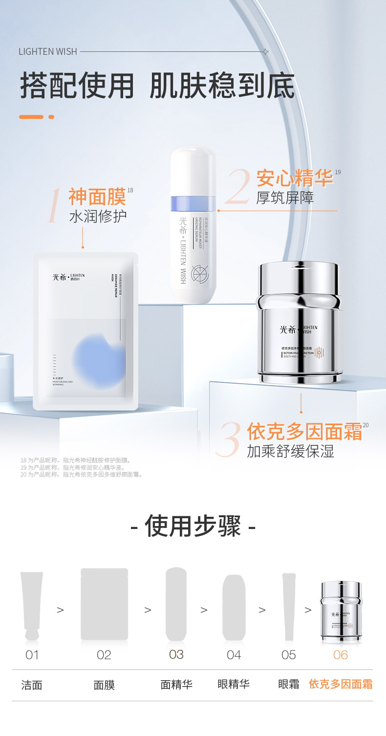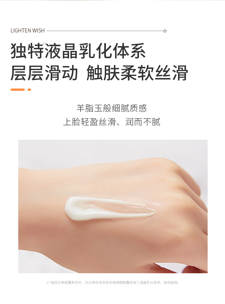 - 护肤新理念,吸收是关键。光希Lightenwish,科技护肤领先者。脂质体纳米微球,活性成分透皮吸收,直达肌底高效养肤。遇见光希,封存美丽。