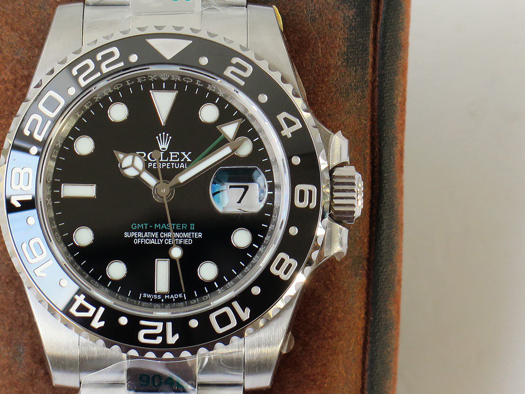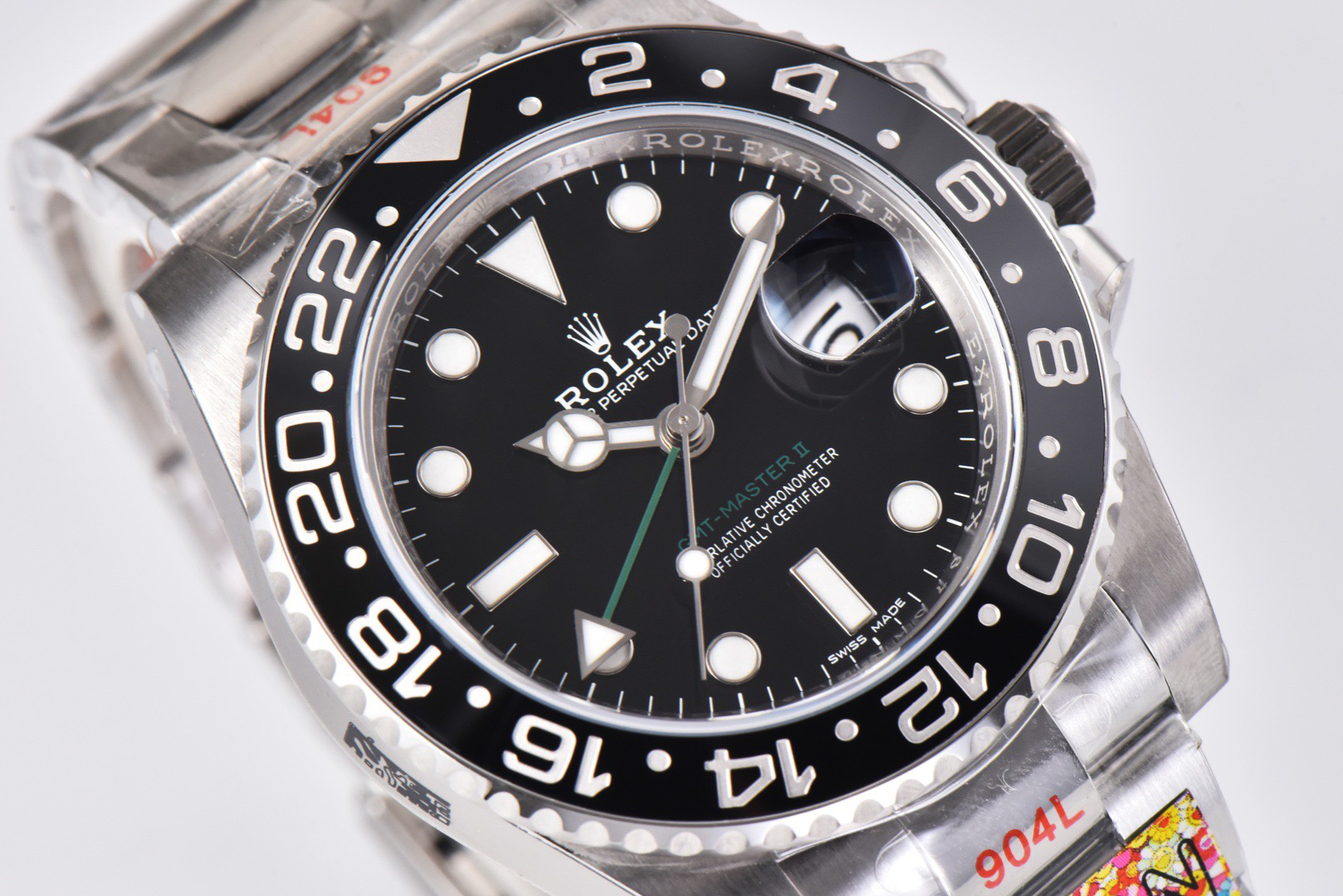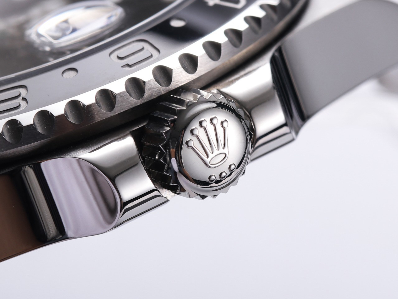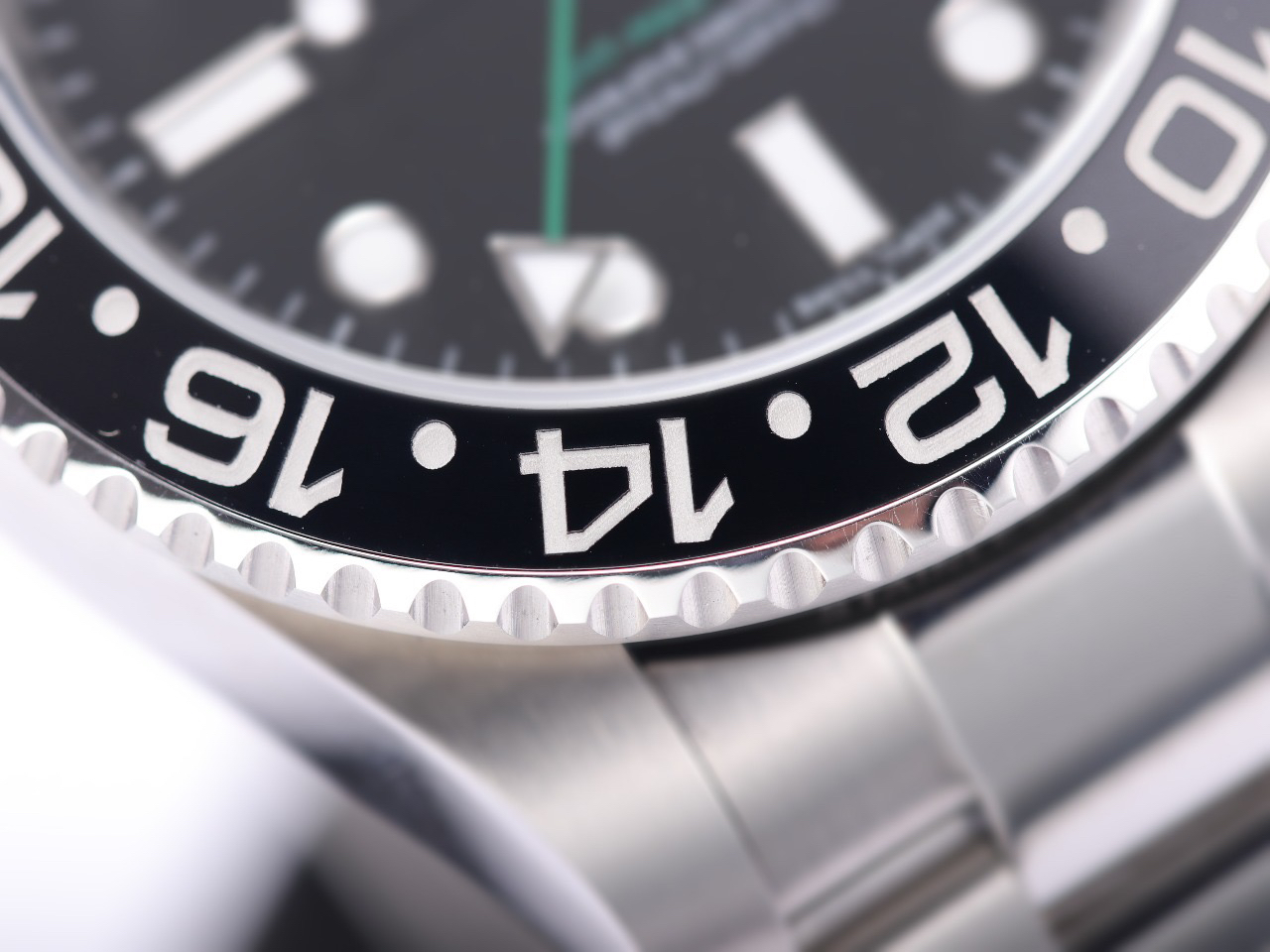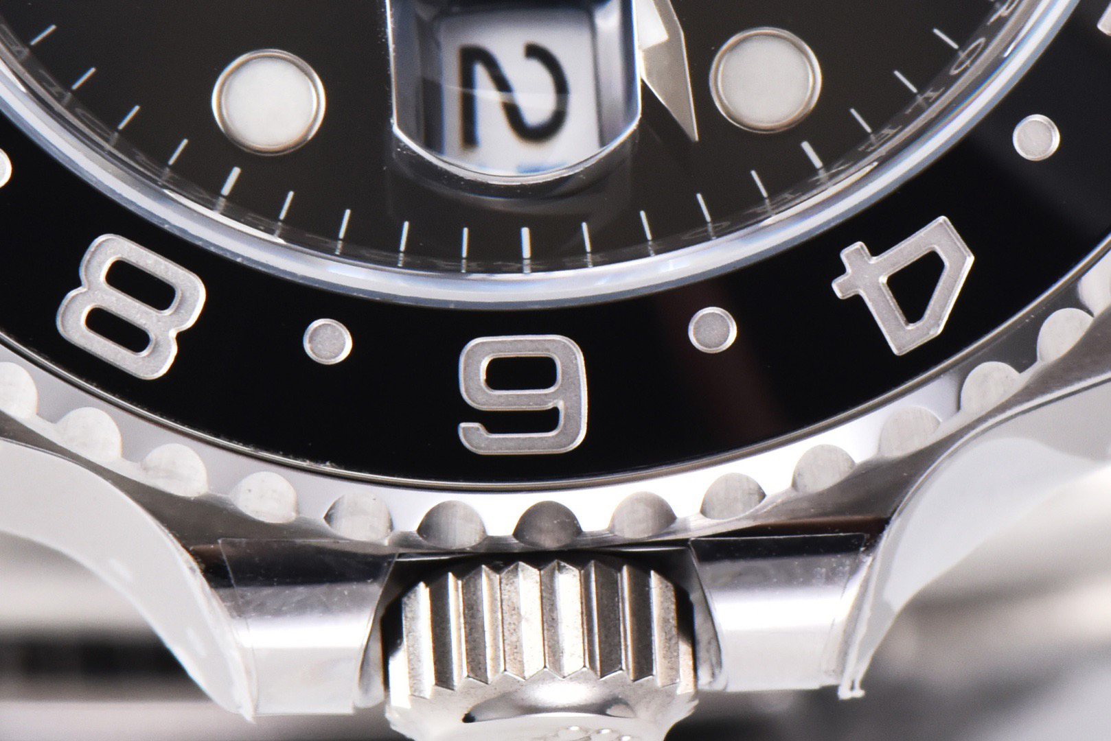 The appearance of the watch case is entirely made of 904L shell body, perfectly reproducing the entire shape of the GMT and correcting the feel of the GMT rotation. crown