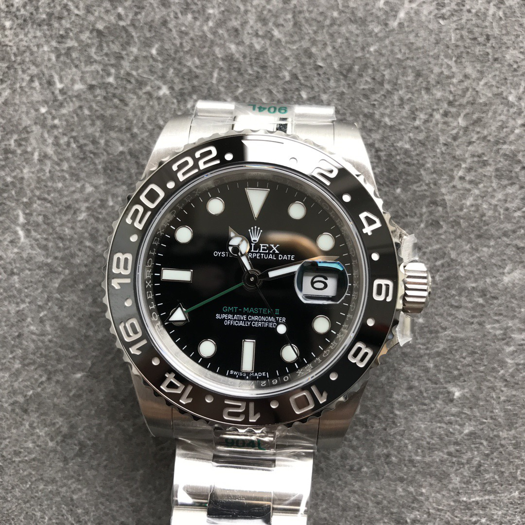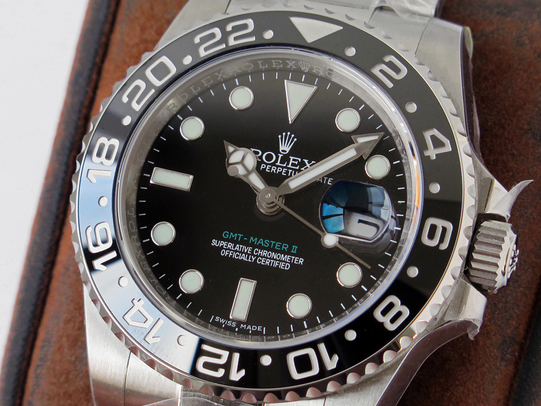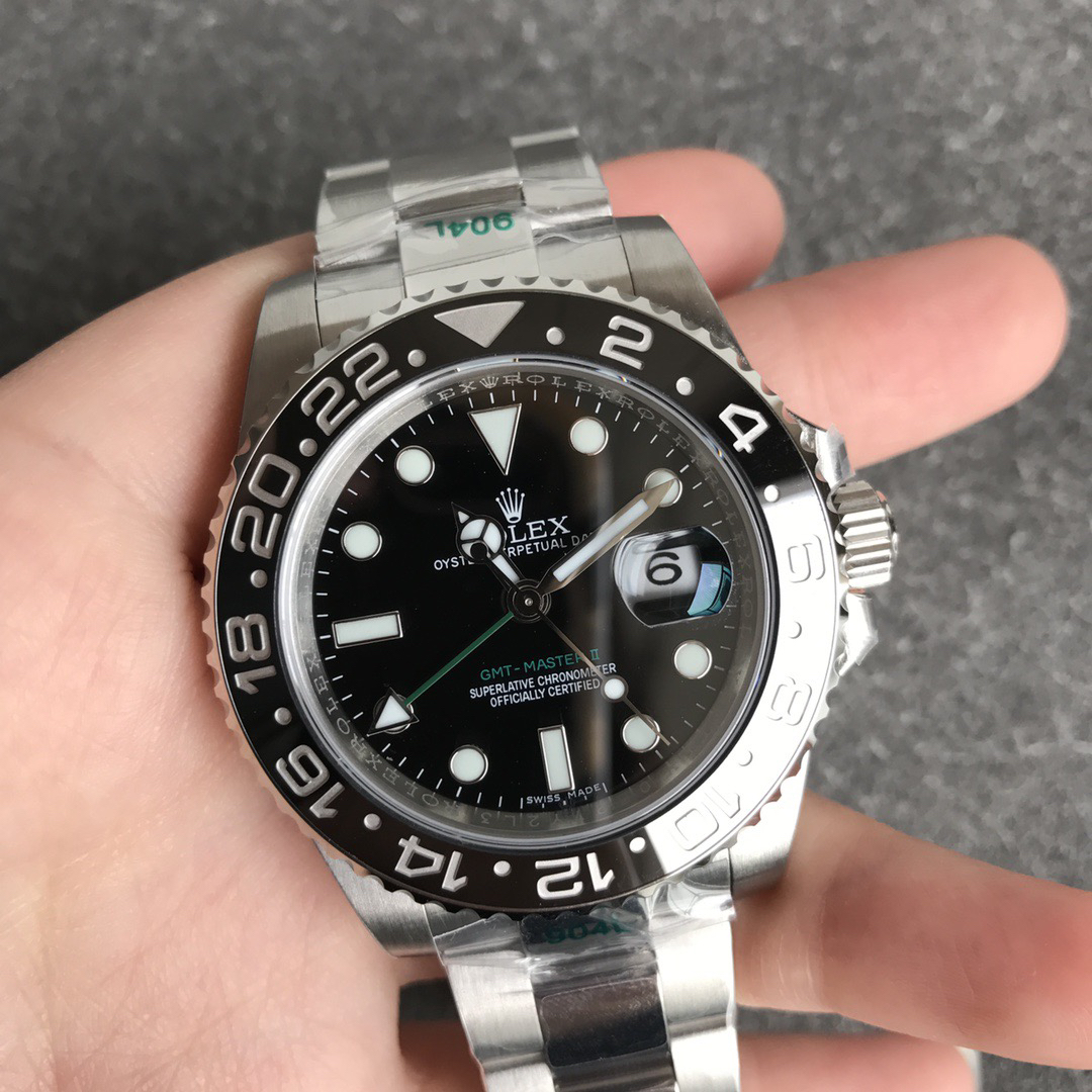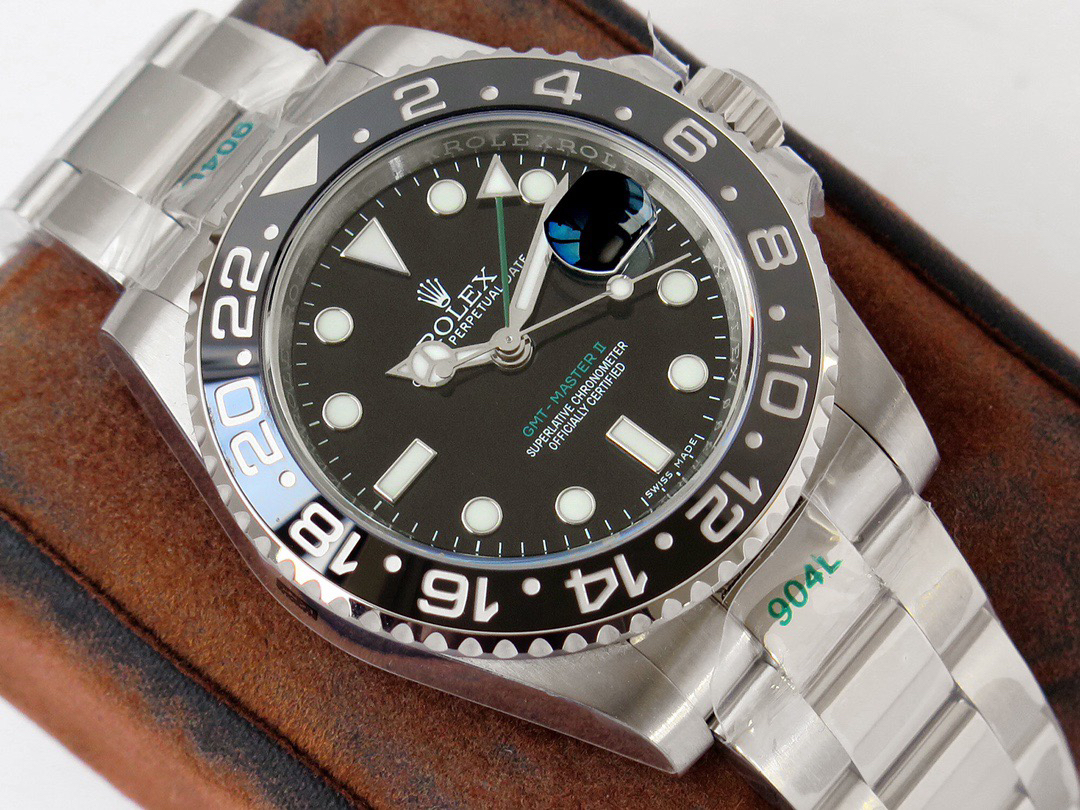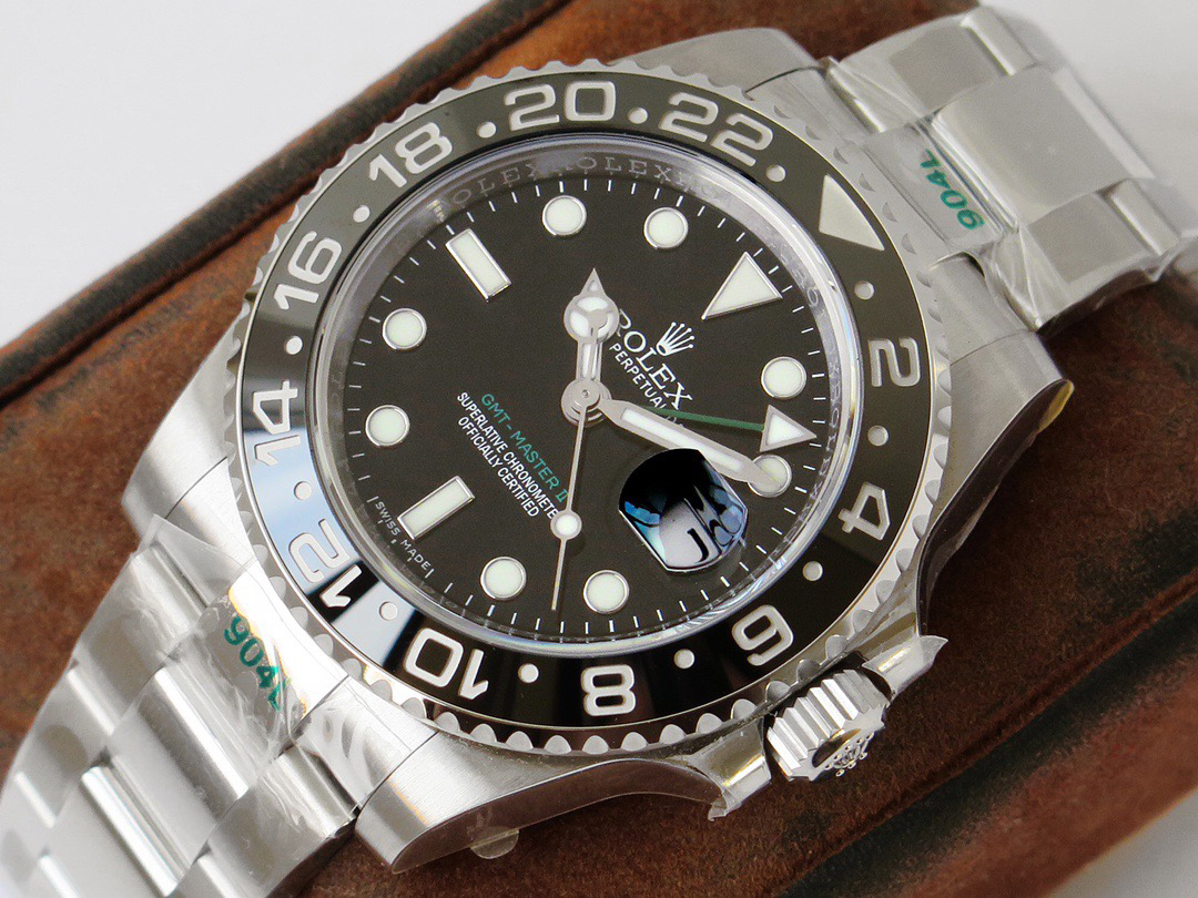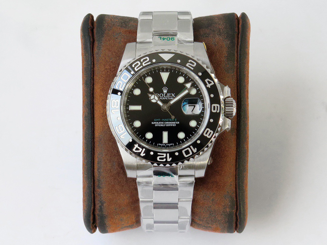 The appearance of the watch case is entirely made of 904L shell body, perfectly reproducing the entire shape of the GMT and correcting the feel of the GMT rotation. crown