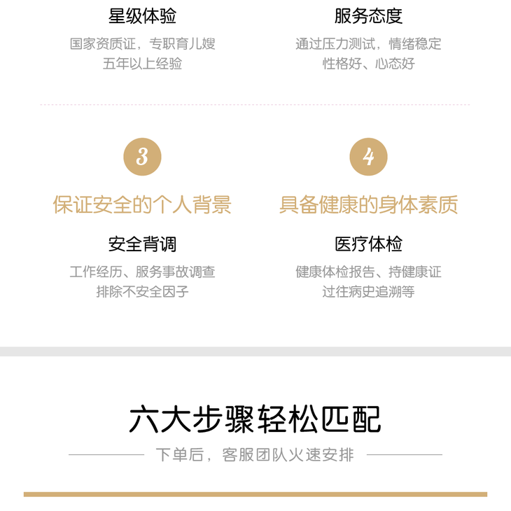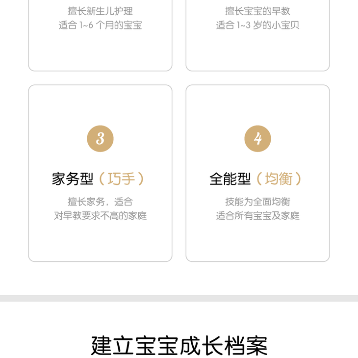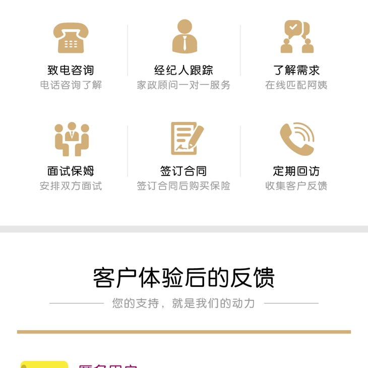 - 专注为中高端家庭提供安全、便捷、优质的家庭服务,针对家庭的每个周期提供全方位的月嫂、育婴师、钟点保姆、养老护理、日常保洁、除尘除螨、家电清洗等一站式高品质家政服务。