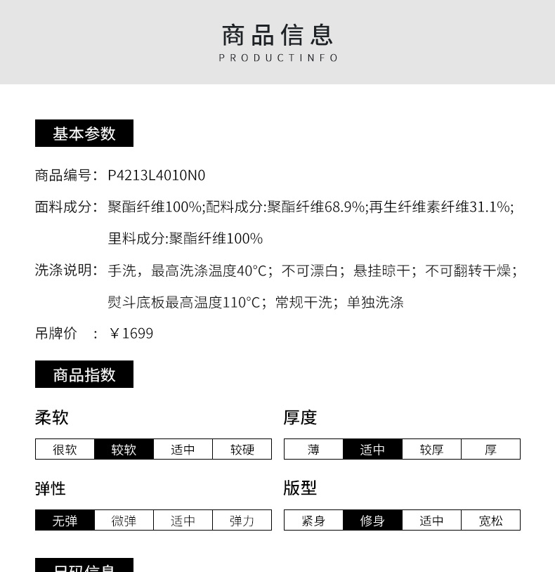 成熟、稳重、高贵典雅、大方得体 融合东方文化的含蓄和法国的浪漫 将创意的艺术性与消费需求相结合 为自信女性塑造高品质场合服装