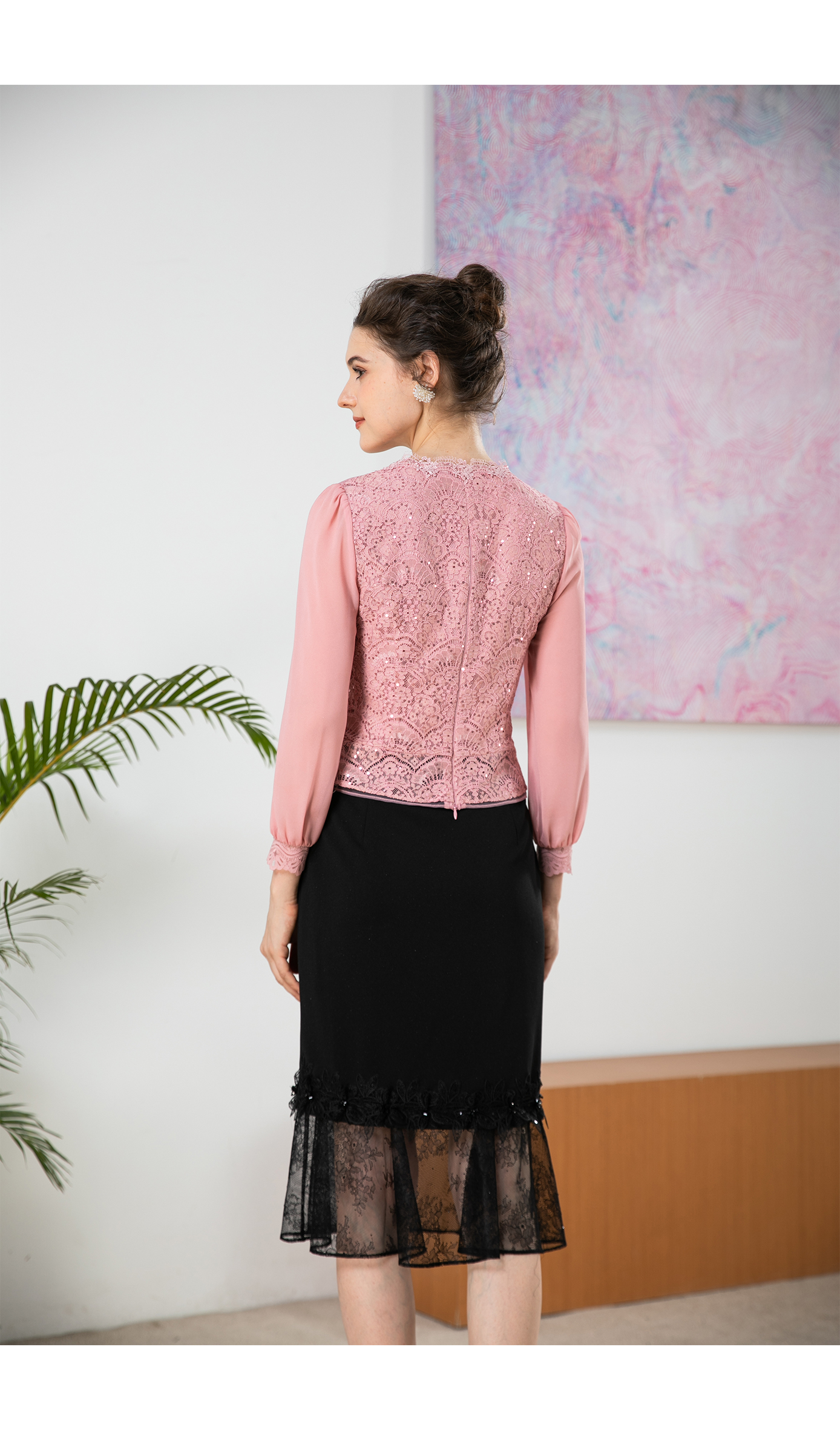 司歌刺绣连衣裙圆领网纱长袖弹力修身A881268