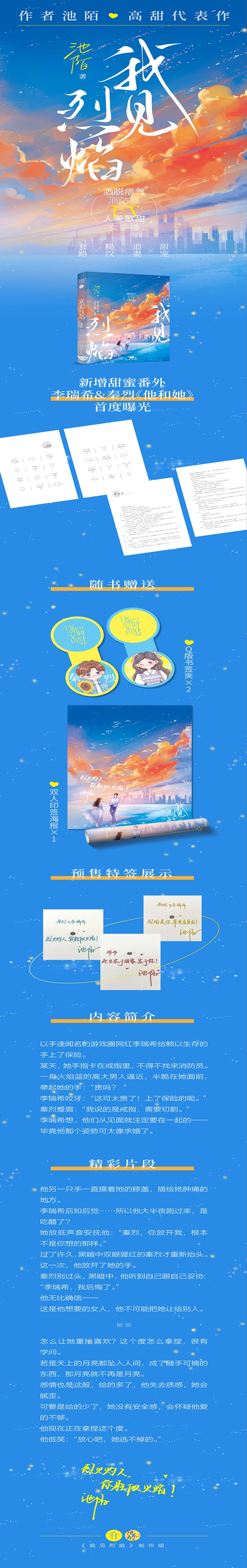 "★晋江原创网签约作者池陌甜宠之作,讲述优质消防员男主角的深深大爱 ★作品连载期间位居晋江原创网各大榜单前列,收藏5W+,文章积分超8亿 ★洒脱痞气消防员VS人美歌甜女主播,热门甜宠,糙汉“追妻火葬场” ★若是天上的月亮都坠入人间,成了随手可摘的东西,那月亮就不再是月亮。——秦烈 ★新增甜蜜番外,李瑞希&秦烈《他和她》首度曝光 ★随书赠品:印特签双人海报一张,书签夹一对 "
